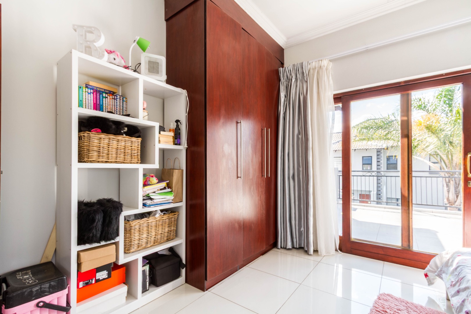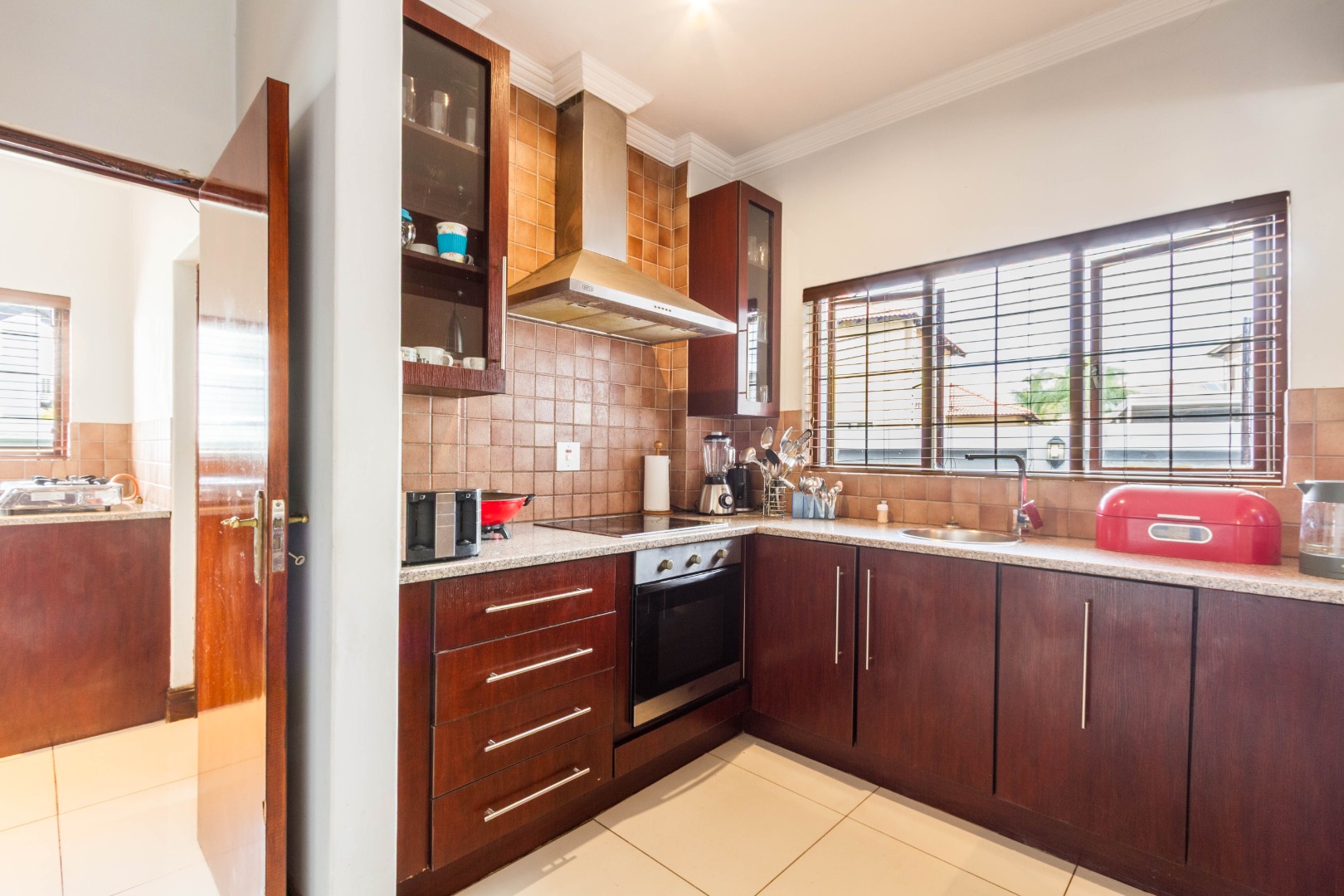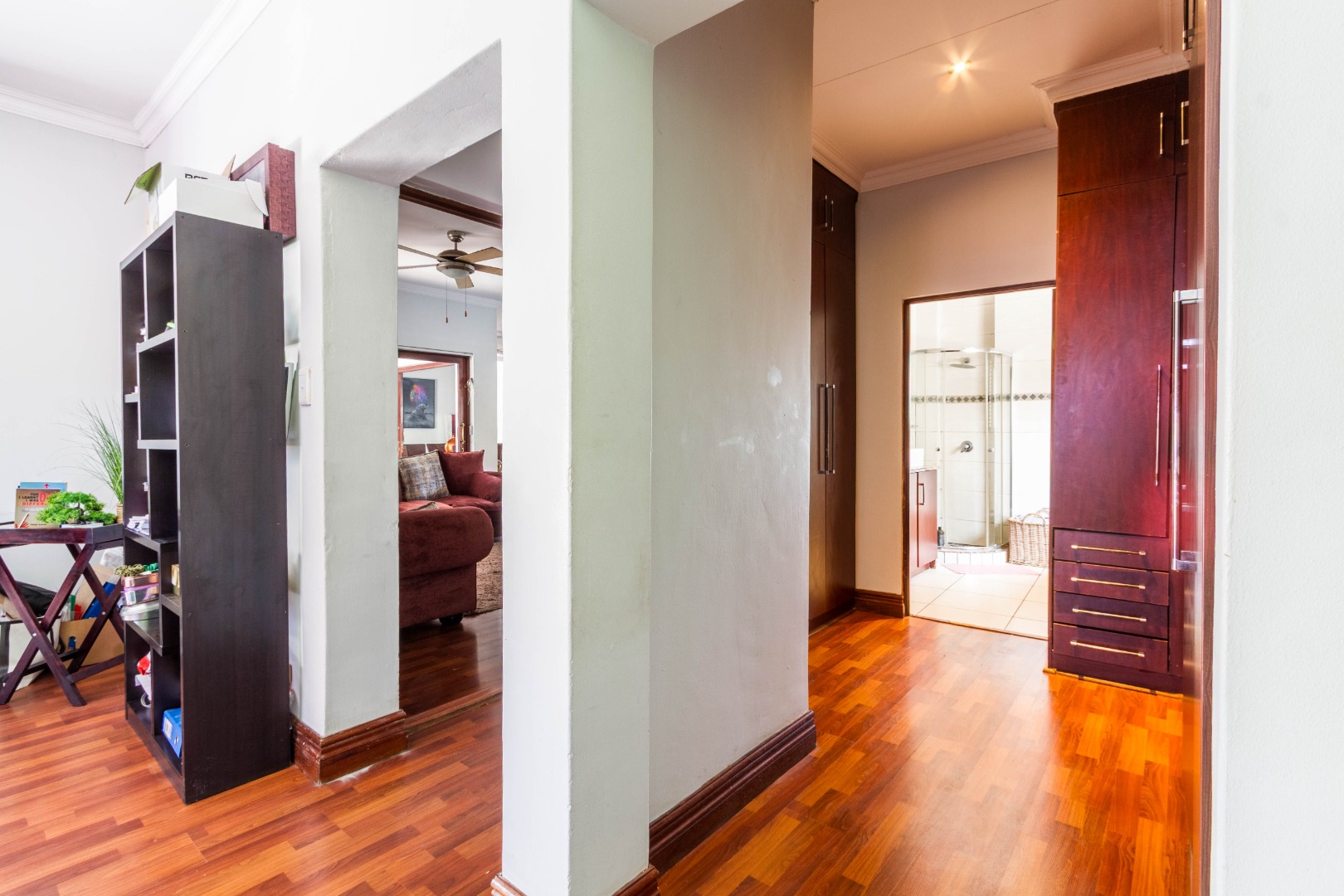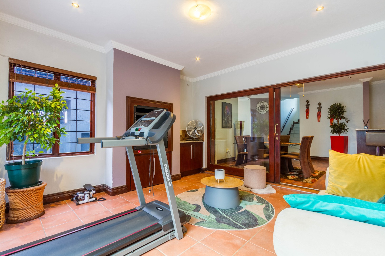 Downstairs, the spacious main bedroom is en-suite with ample cupboard space and opens onto the outside area.