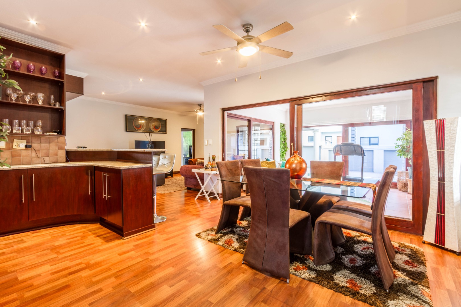 An inviting entrance hall leads to a separate, private lounge before flowing into the open-plan dining area with a built-in bar and adjoining lounge. Both living and dining areas open via sliding doors onto an enclosed patio, complete with a built-in braai, prep bowl and additional cabinetry — ideal for year-round entertaining.