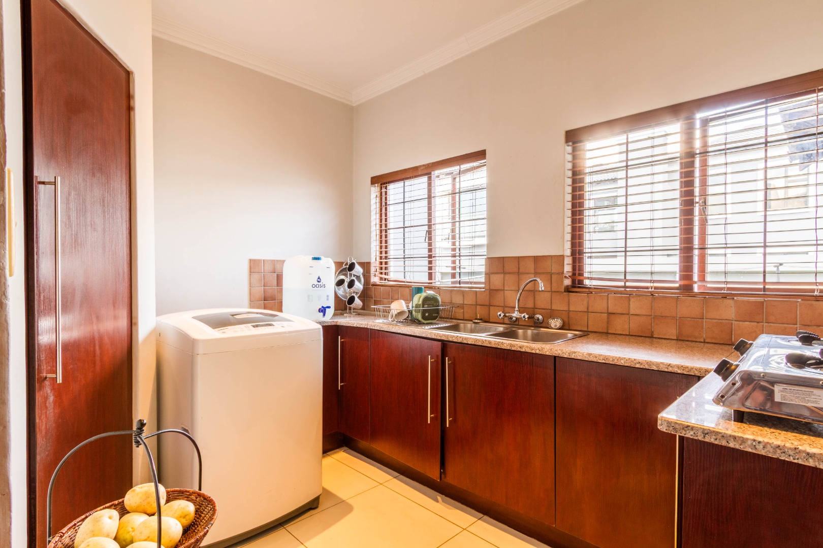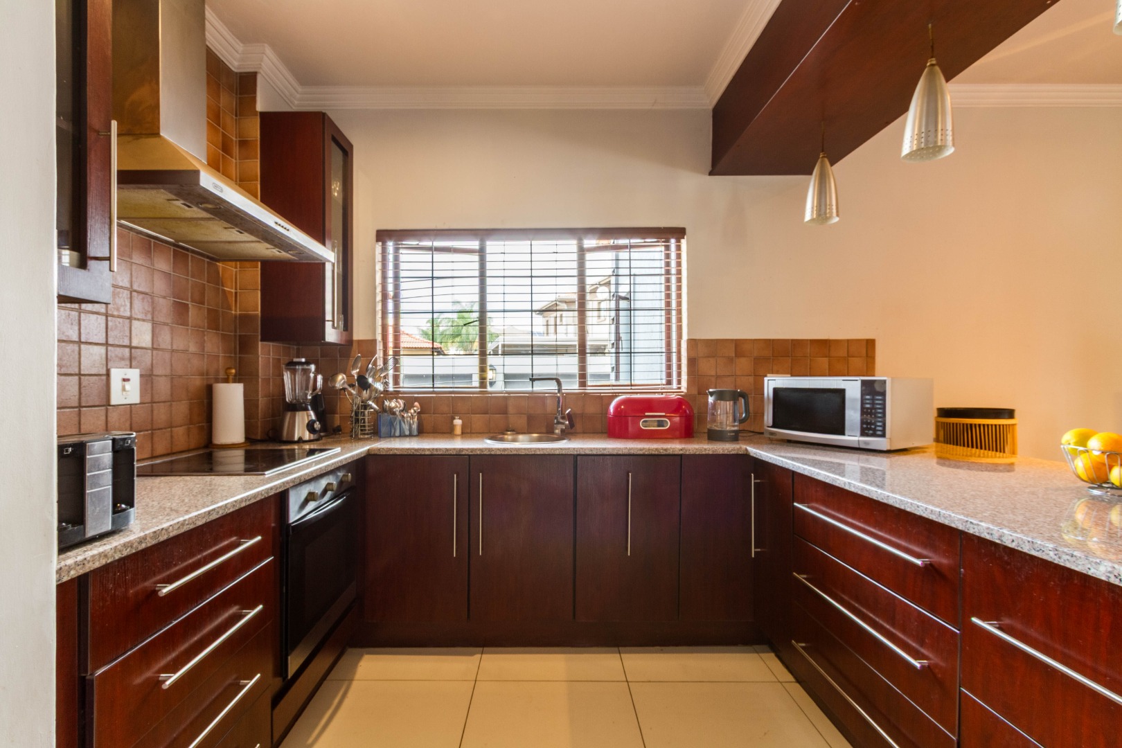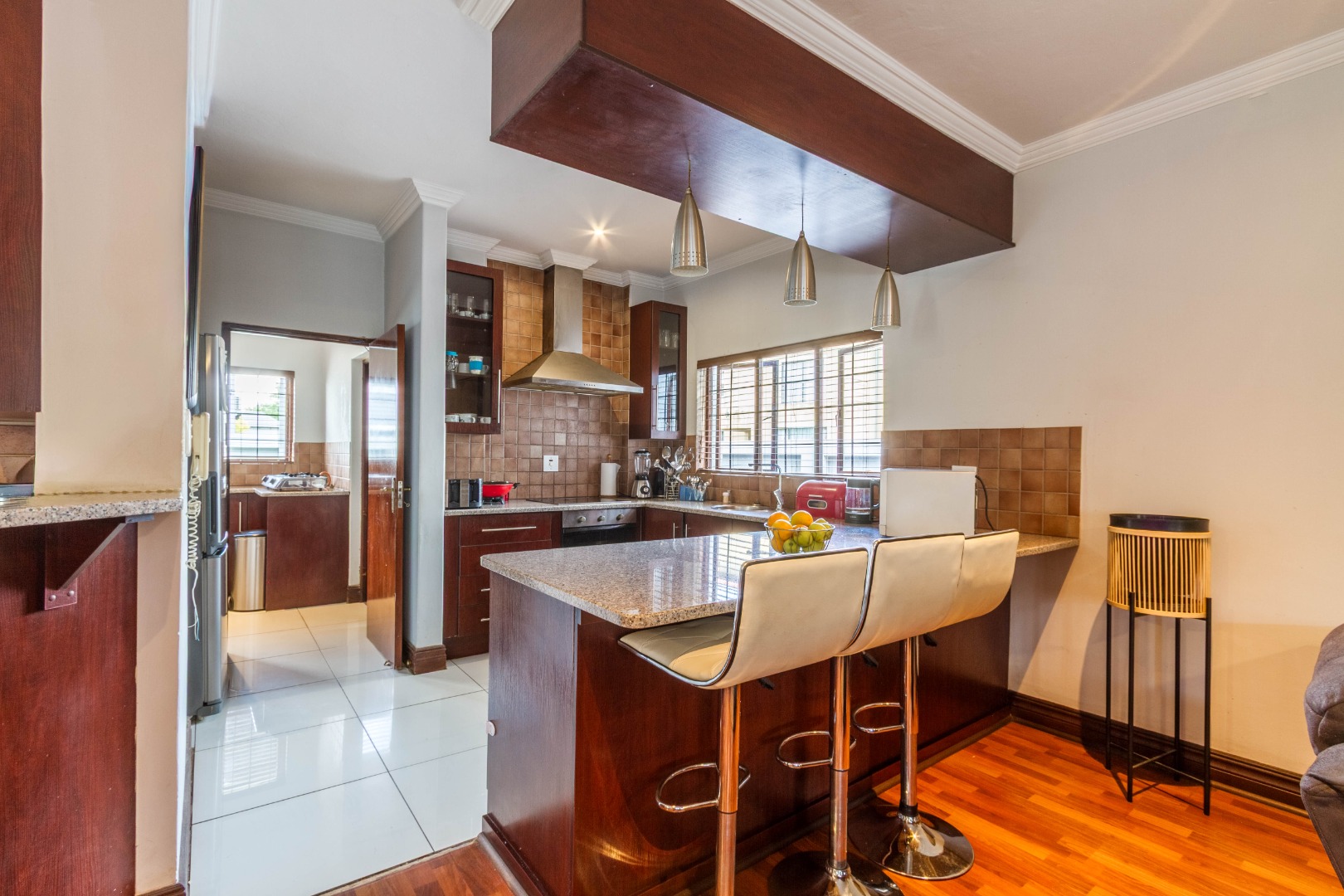 The open-plan kitchen features granite countertops, a breakfast nook, a large pantry and a separate scullery, offering both functionality and flow.