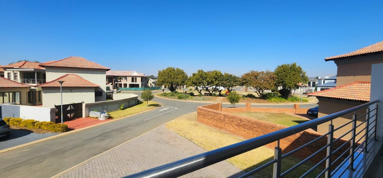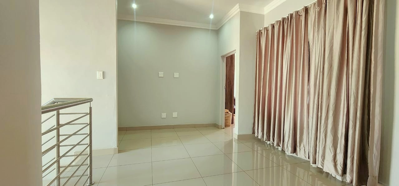 The upper level features a cosy pajama lounge and three well-sized bedrooms, each with its own en-suite bathroom. The main bedroom offers ample cupboard space and opens onto a private balcony with lovely estate views.