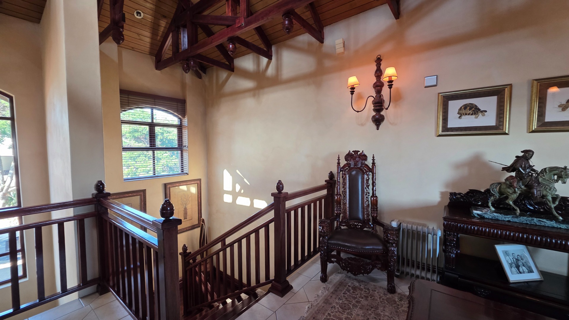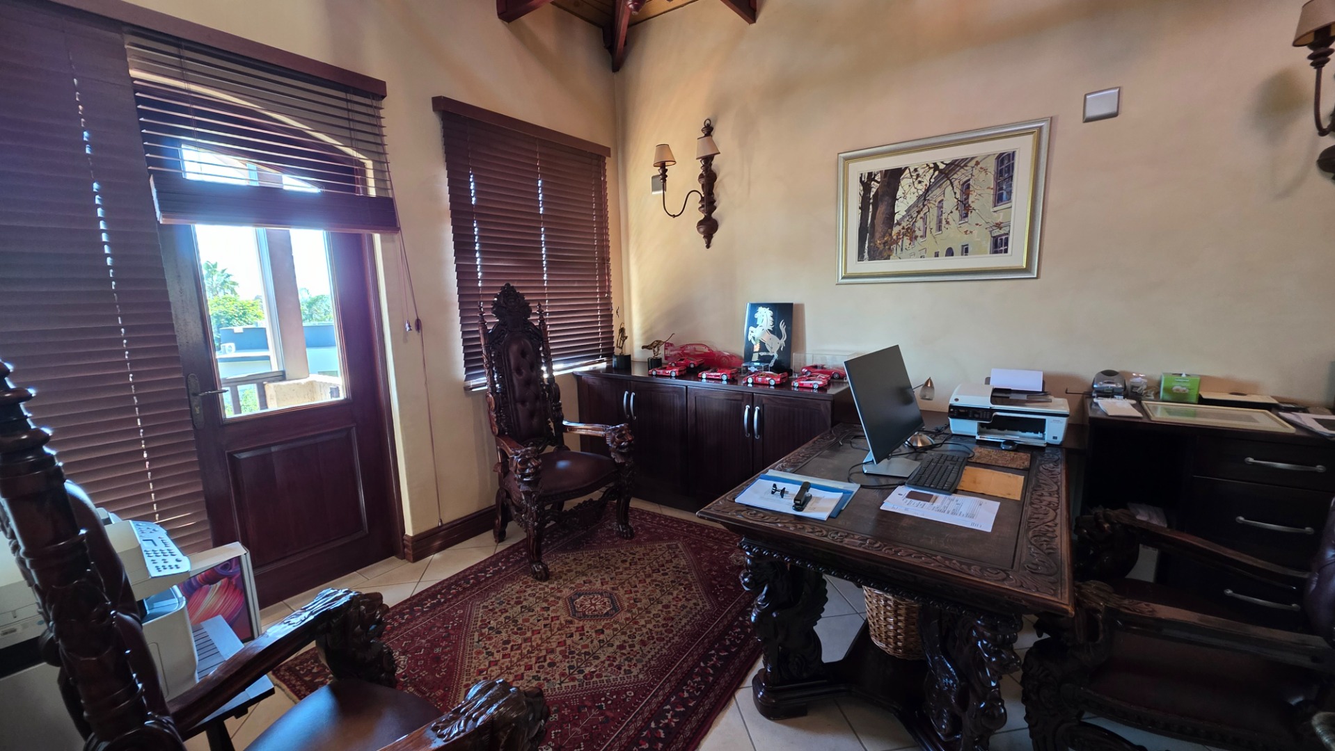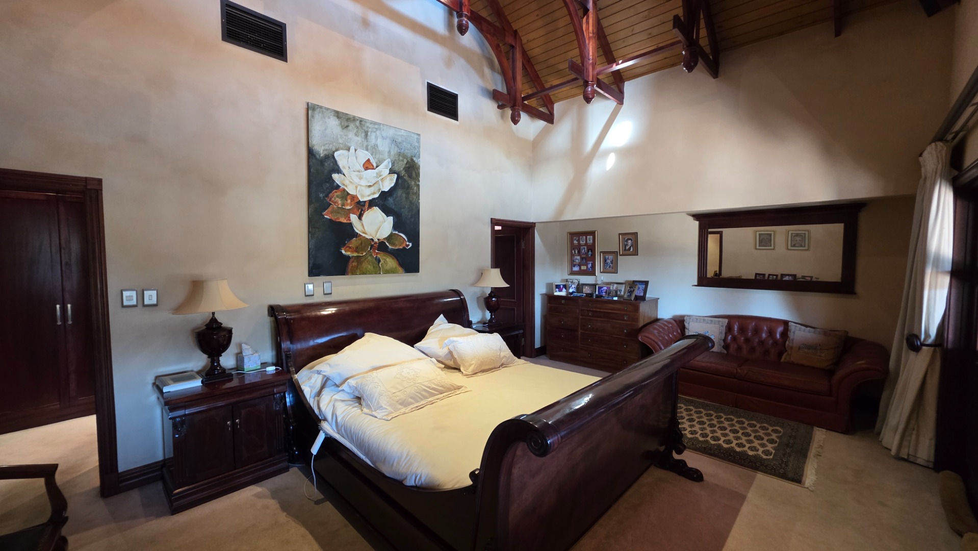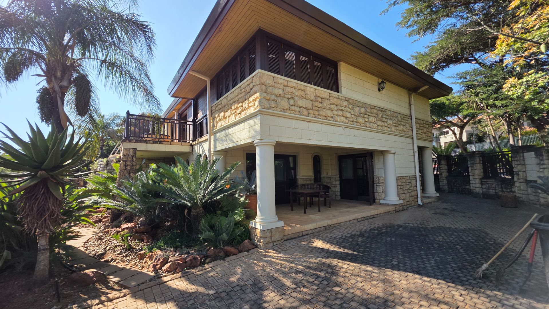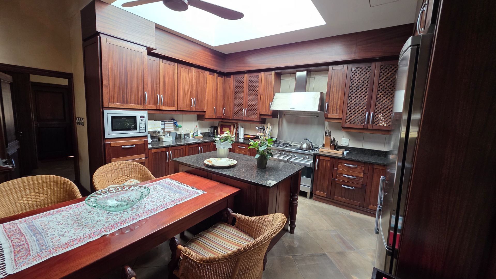 Indulge in the epitome of sophistication with immaculate finishes throughout, including elegant sandstone floors and a custom-designed mahogany kitchen featuring granite countertops, an Ilve double oven, and a gas stove. Boasting five large, flowing reception areas, this home provides ample space for relaxation and entertaining. A separate scullery, laundry/ironing room, and large pantry ensure practical convenience.