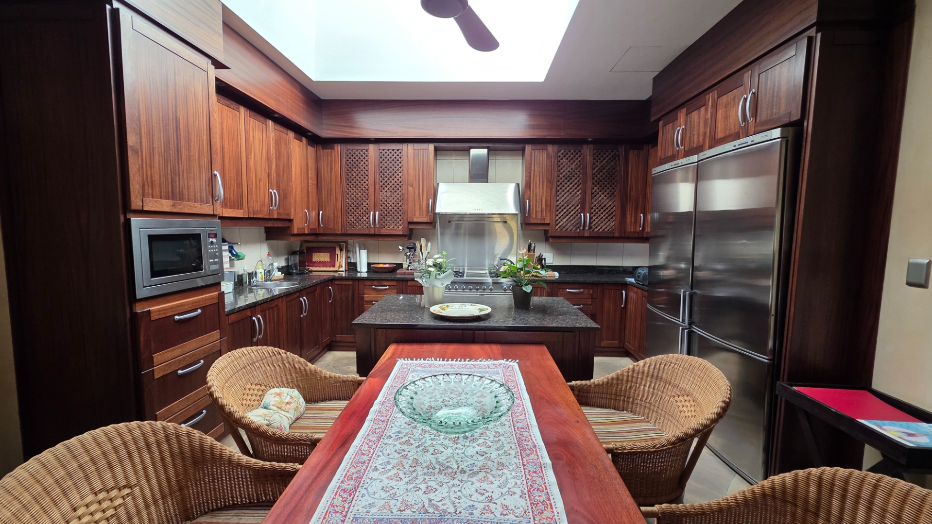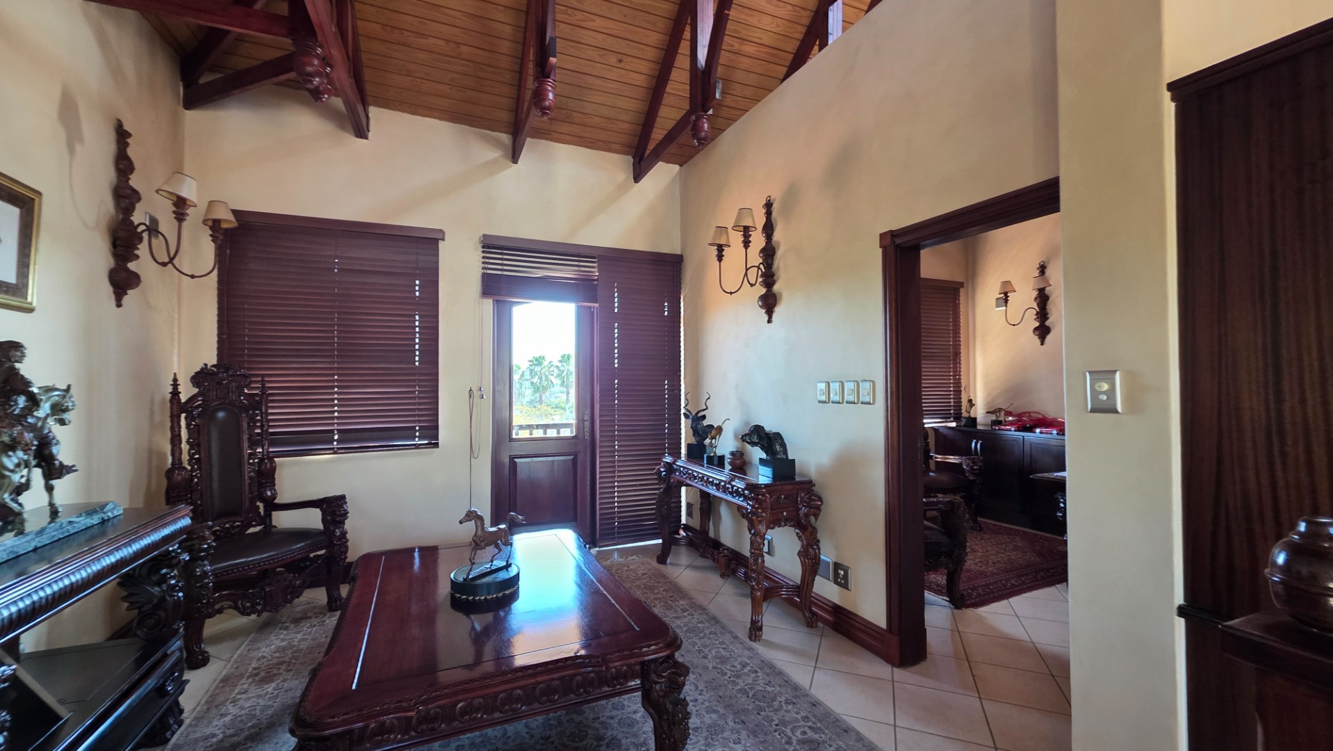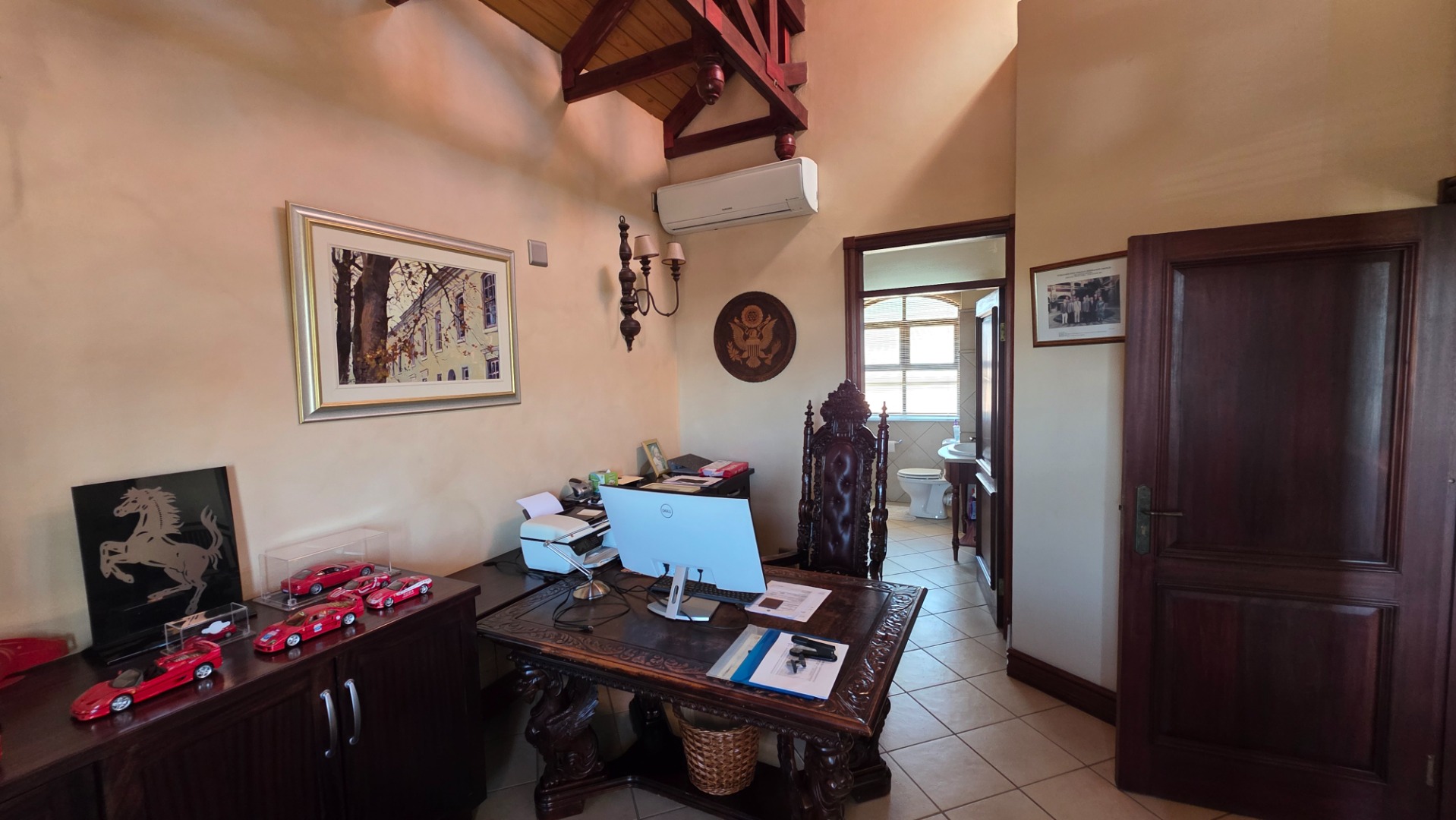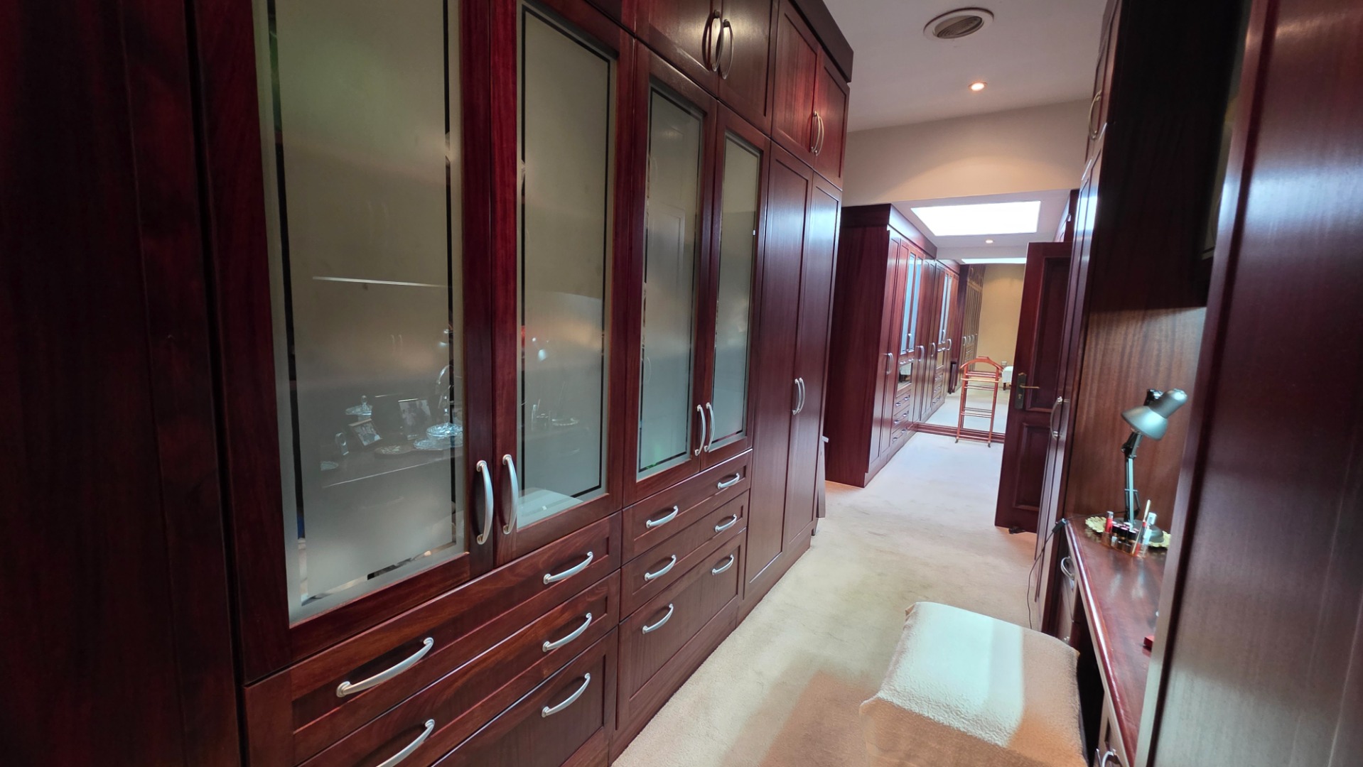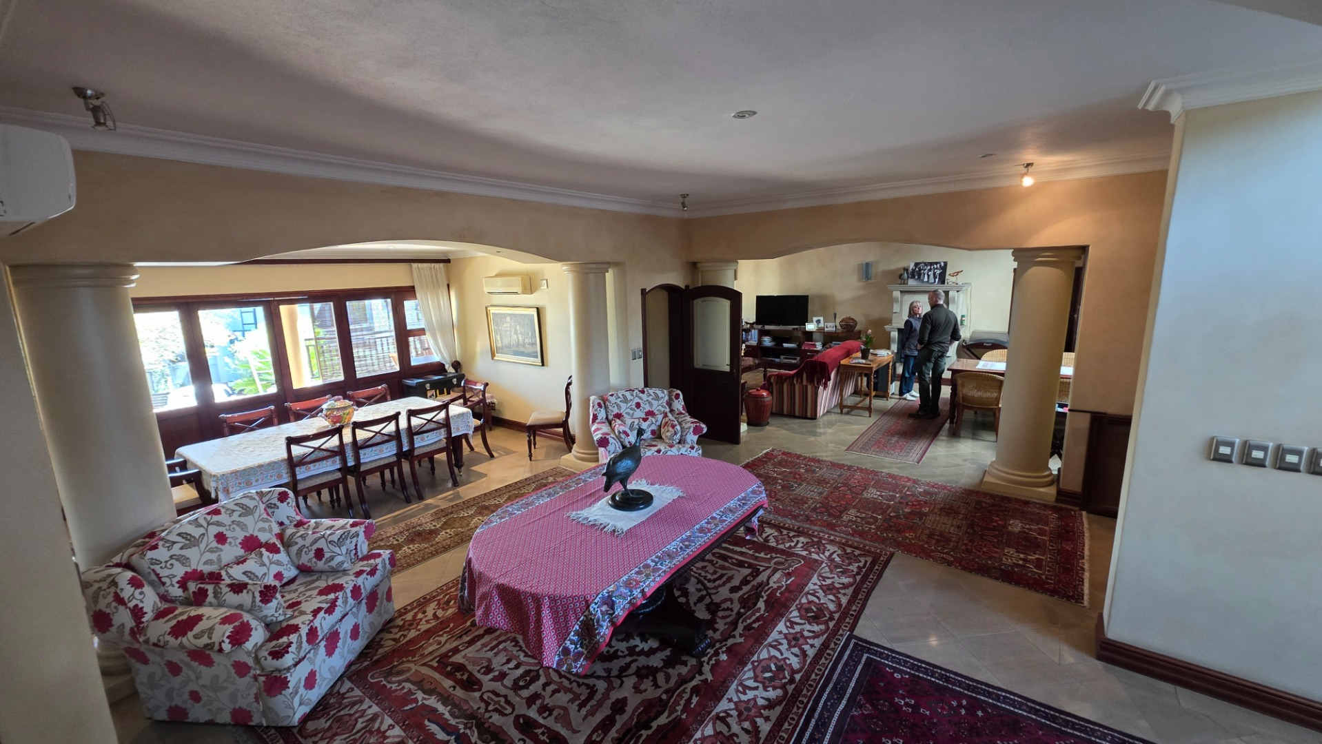 Indulge in the epitome of sophistication with immaculate finishes throughout, including elegant sandstone floors and a custom-designed mahogany kitchen featuring granite countertops, an Ilve double oven, and a gas stove. Boasting five large, flowing reception areas, this home provides ample space for relaxation and entertaining. A separate scullery, laundry/ironing room, and large pantry ensure practical convenience.