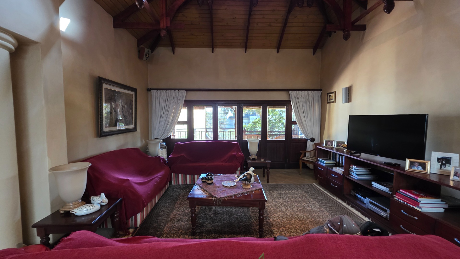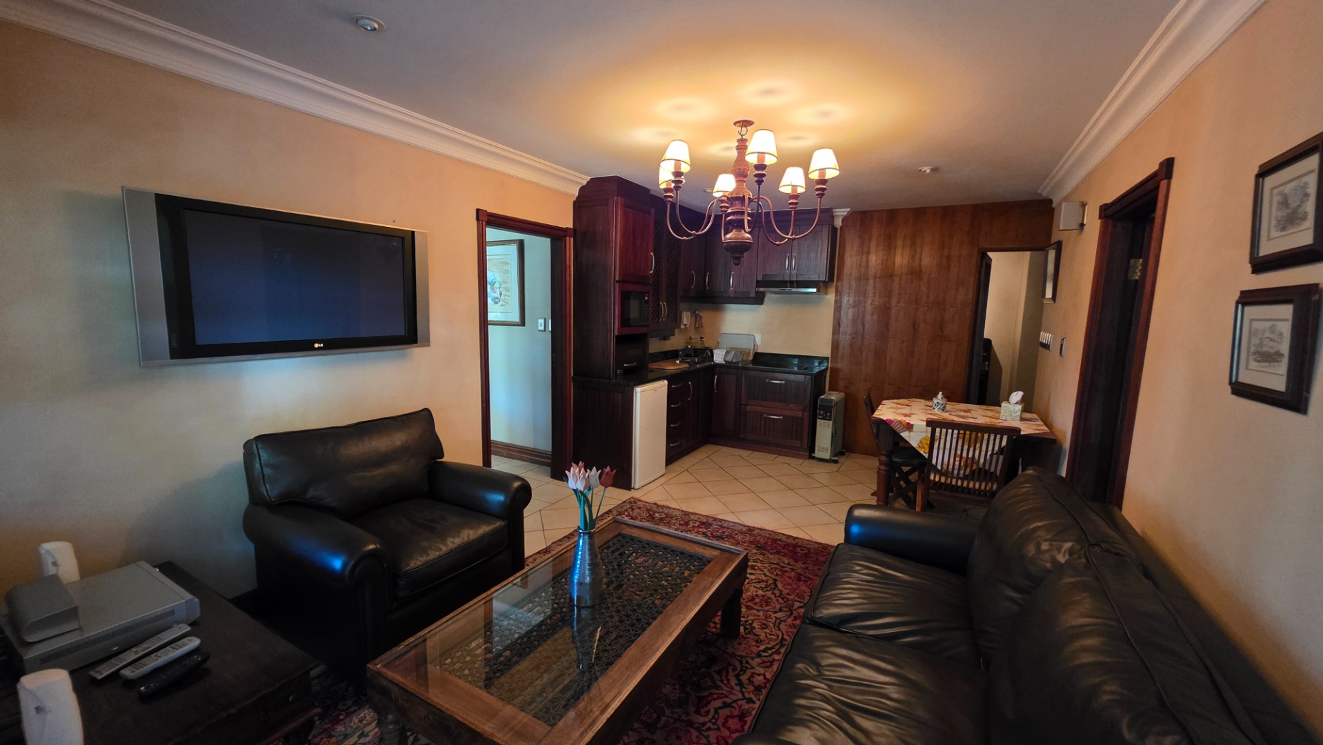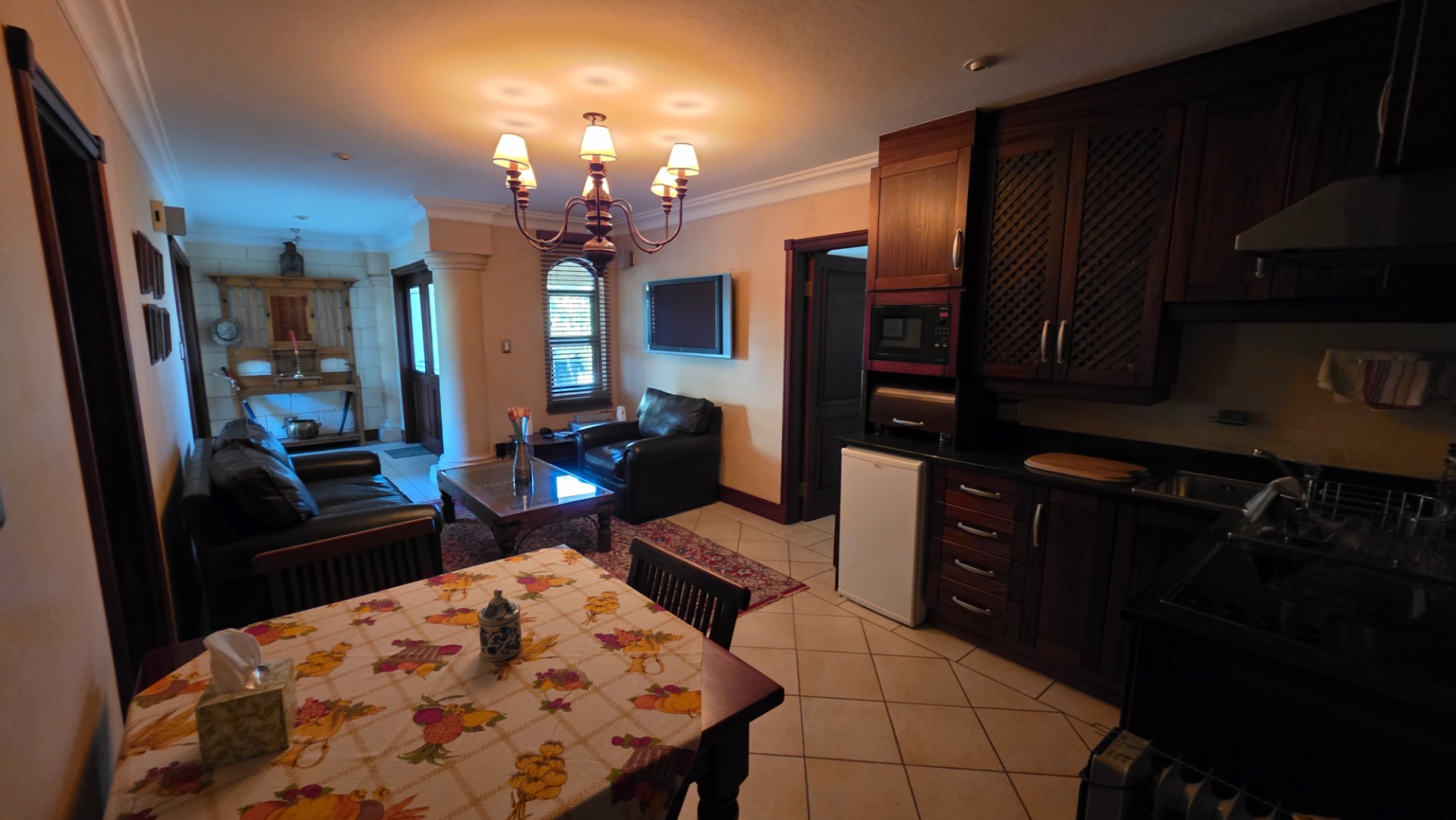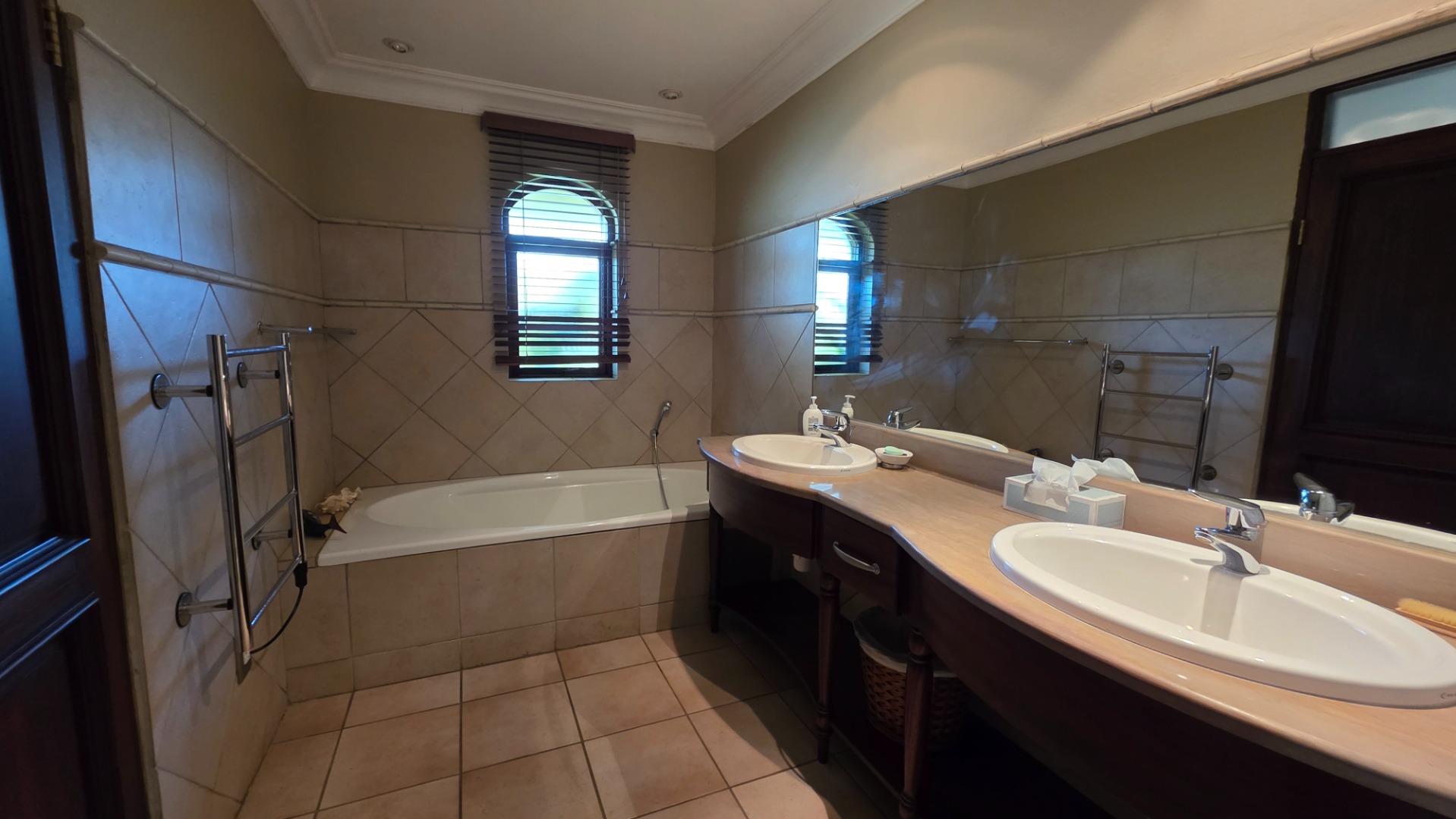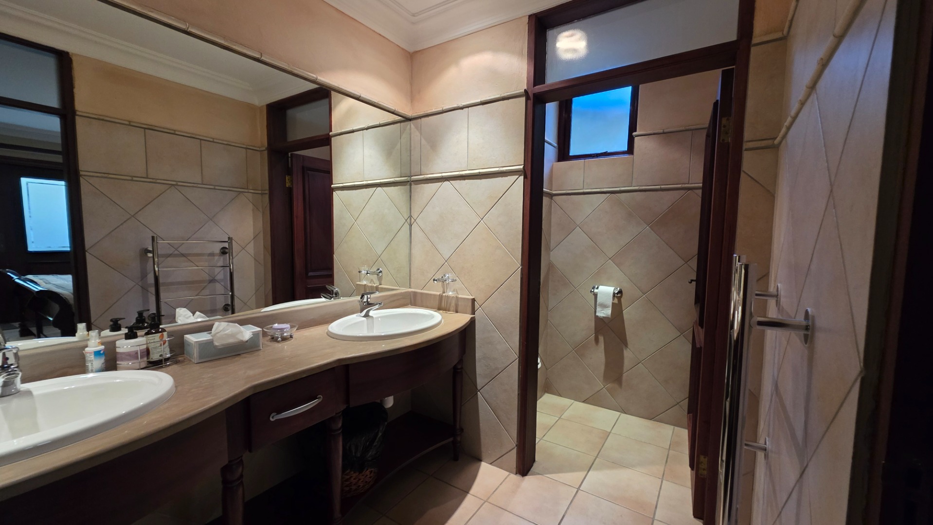 Indulge in the epitome of sophistication with immaculate finishes throughout, including elegant sandstone floors and a custom-designed mahogany kitchen featuring granite countertops, an Ilve double oven, and a gas stove. Boasting five large, flowing reception areas, this home provides ample space for relaxation and entertaining. A separate scullery, laundry/ironing room, and large pantry ensure practical convenience.