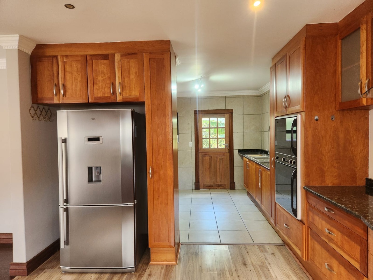 The kitchen is thoughtfully designed with both style and practicality in mind, featuring double ovens, a gas hob, space for a double-door fridge, and a separate scullery/laundry space that leads out into the garden.