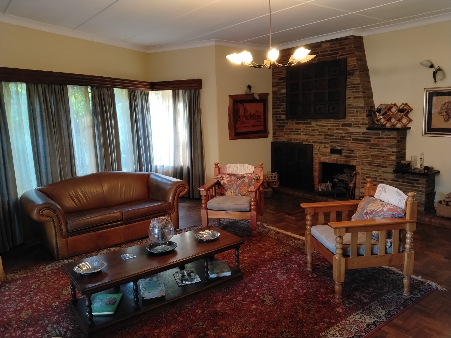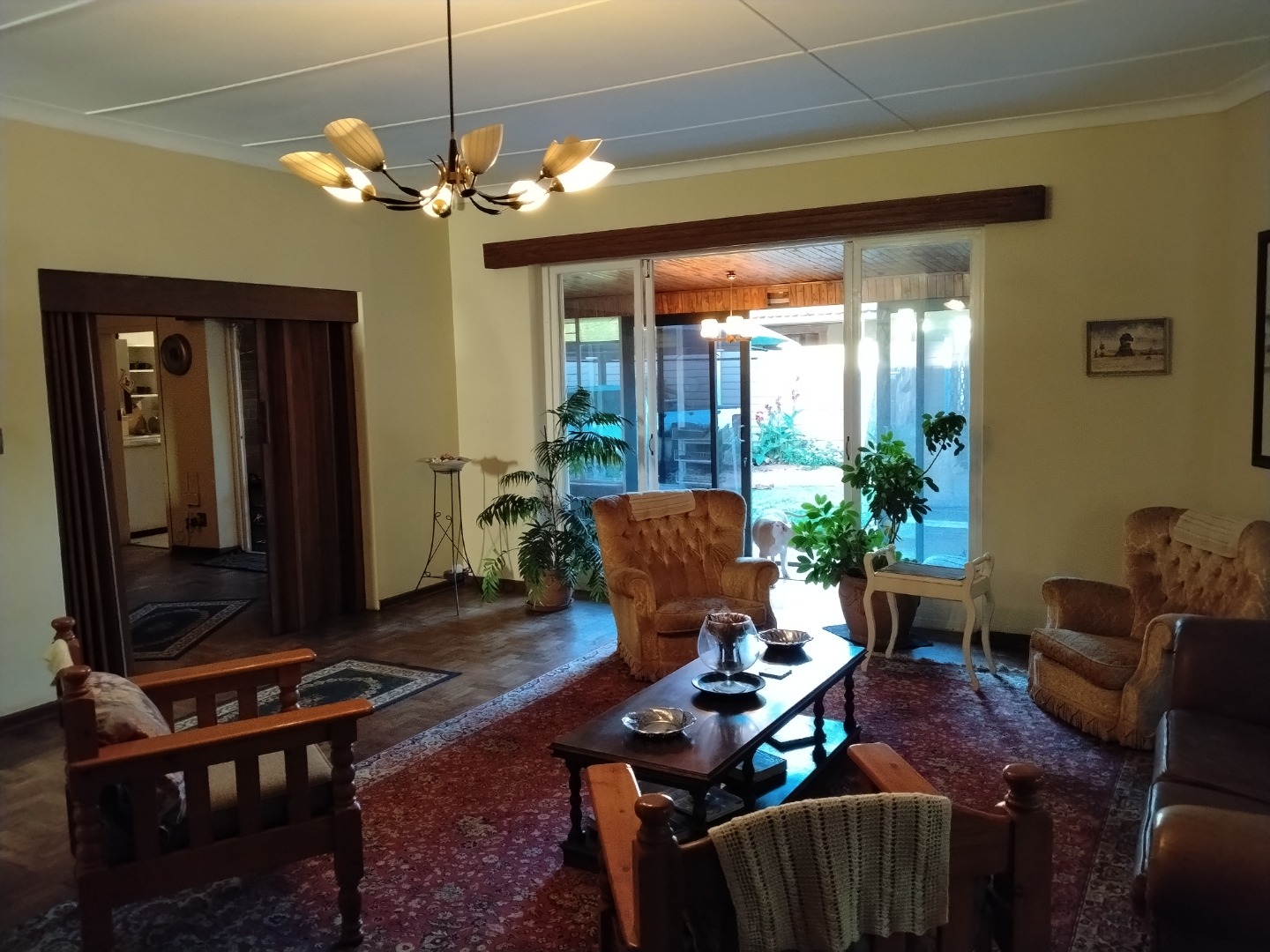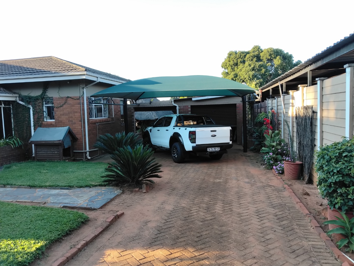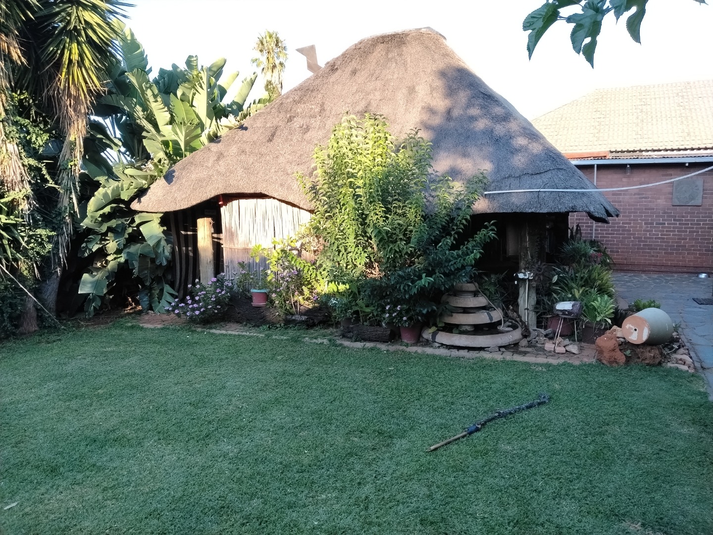 The main house offers 3 bedrooms, 2 bathrooms, guest toilette, large lounge with a stone fireplace, separate dining room, kitchen, laundry room and an enclosed veranda. Outbuildings consist of a single garage, 2 carports in the front of the garage and additional 2 carports on the western side of the property. Staff quarters with own electric geyser are situated behind the garage. The well maintained garden has several larger trees, many shrubs and plants and manicured grass. Well maintained swimming pool is located on the western side of the house. Large thatched roof lapa with built-in braai and a bar counter is situated in the northern side of the garden.