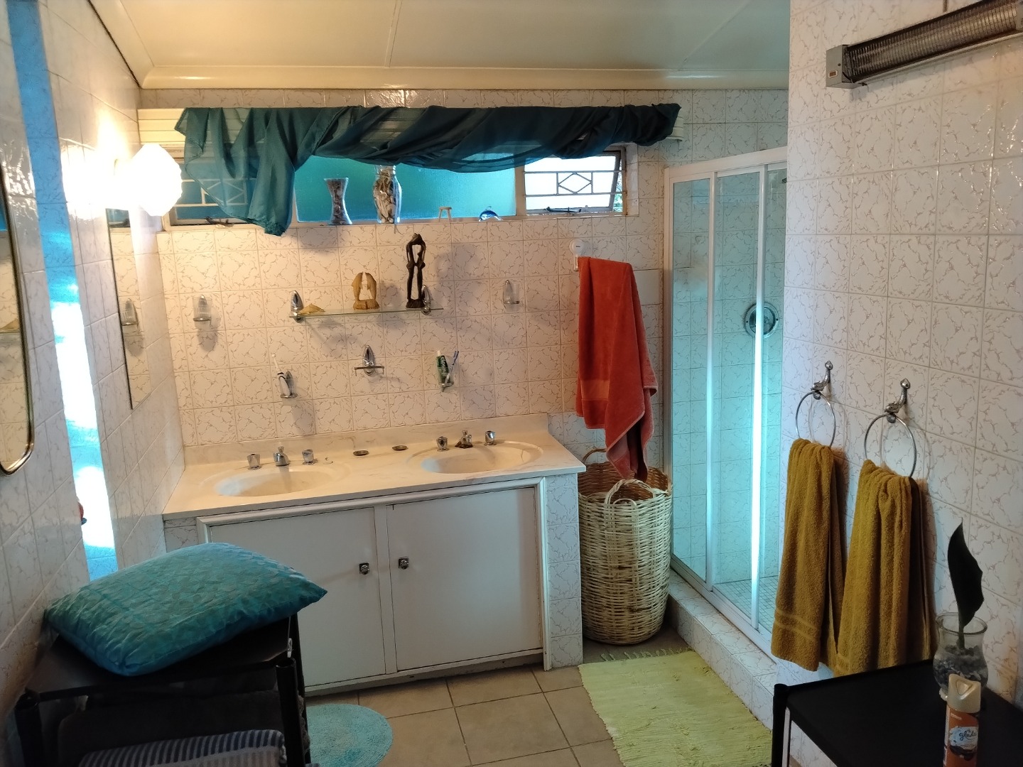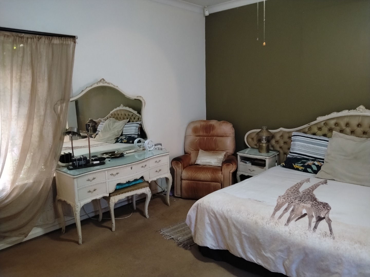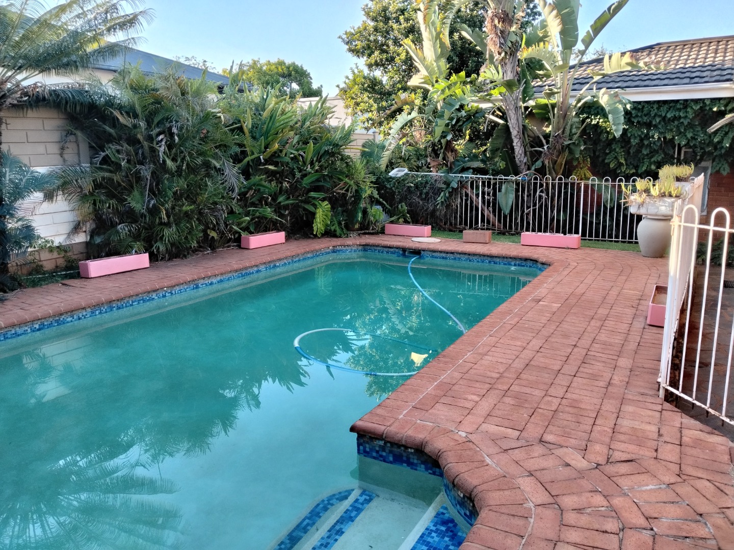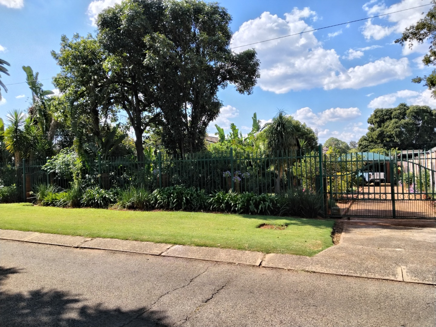 The main house offers 3 bedrooms, 2 bathrooms, guest toilette, large lounge with a stone fireplace, separate dining room, kitchen, laundry room and an enclosed veranda. Outbuildings consist of a single garage, 2 carports in the front of the garage and additional 2 carports on the western side of the property. Staff quarters with own electric geyser are situated behind the garage. The well maintained garden has several larger trees, many shrubs and plants and manicured grass. Well maintained swimming pool is located on the western side of the house. Large thatched roof lapa with built-in braai and a bar counter is situated in the northern side of the garden.