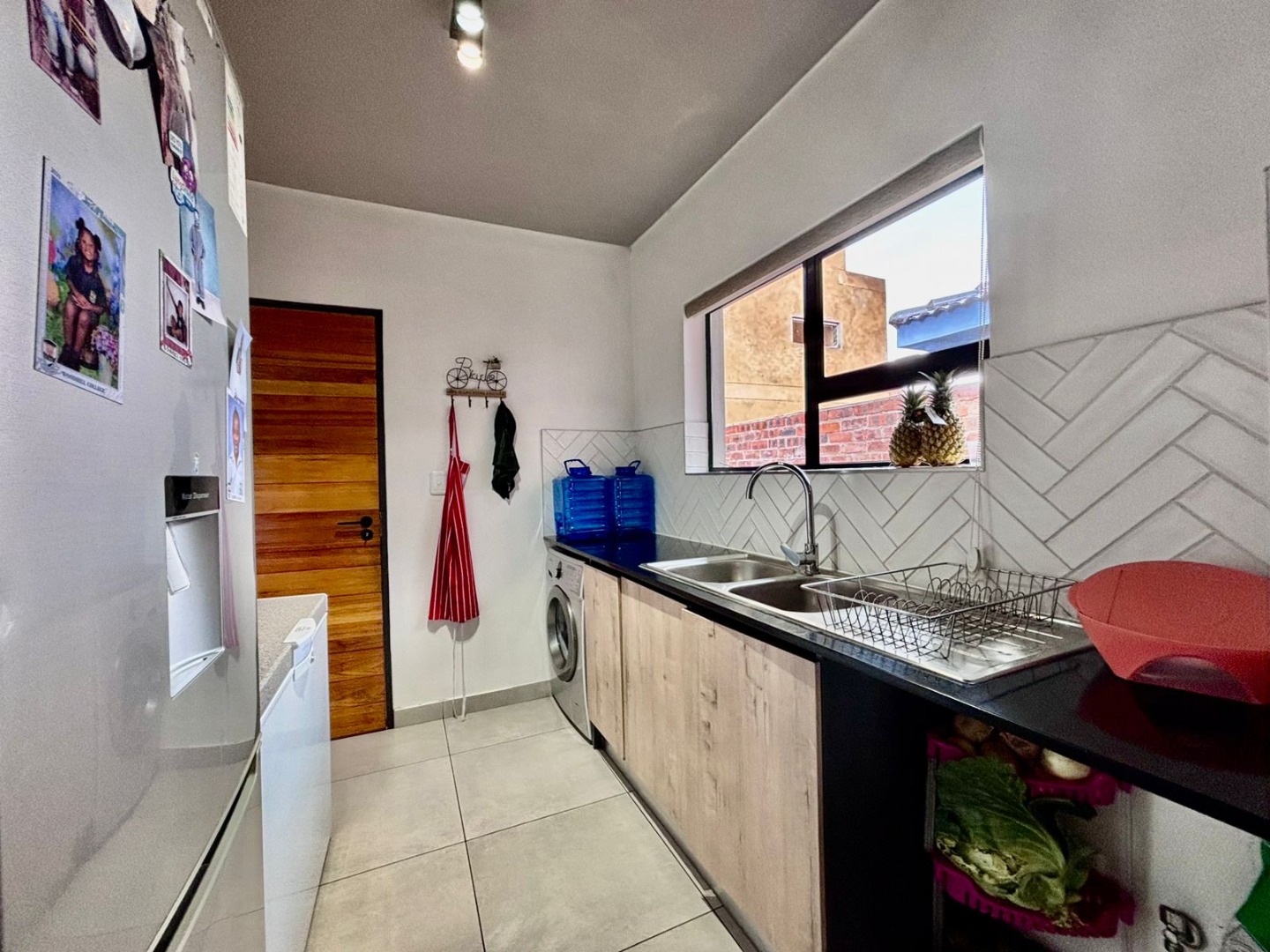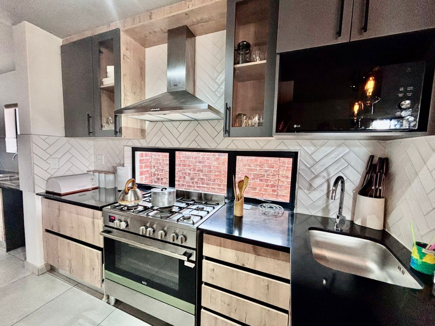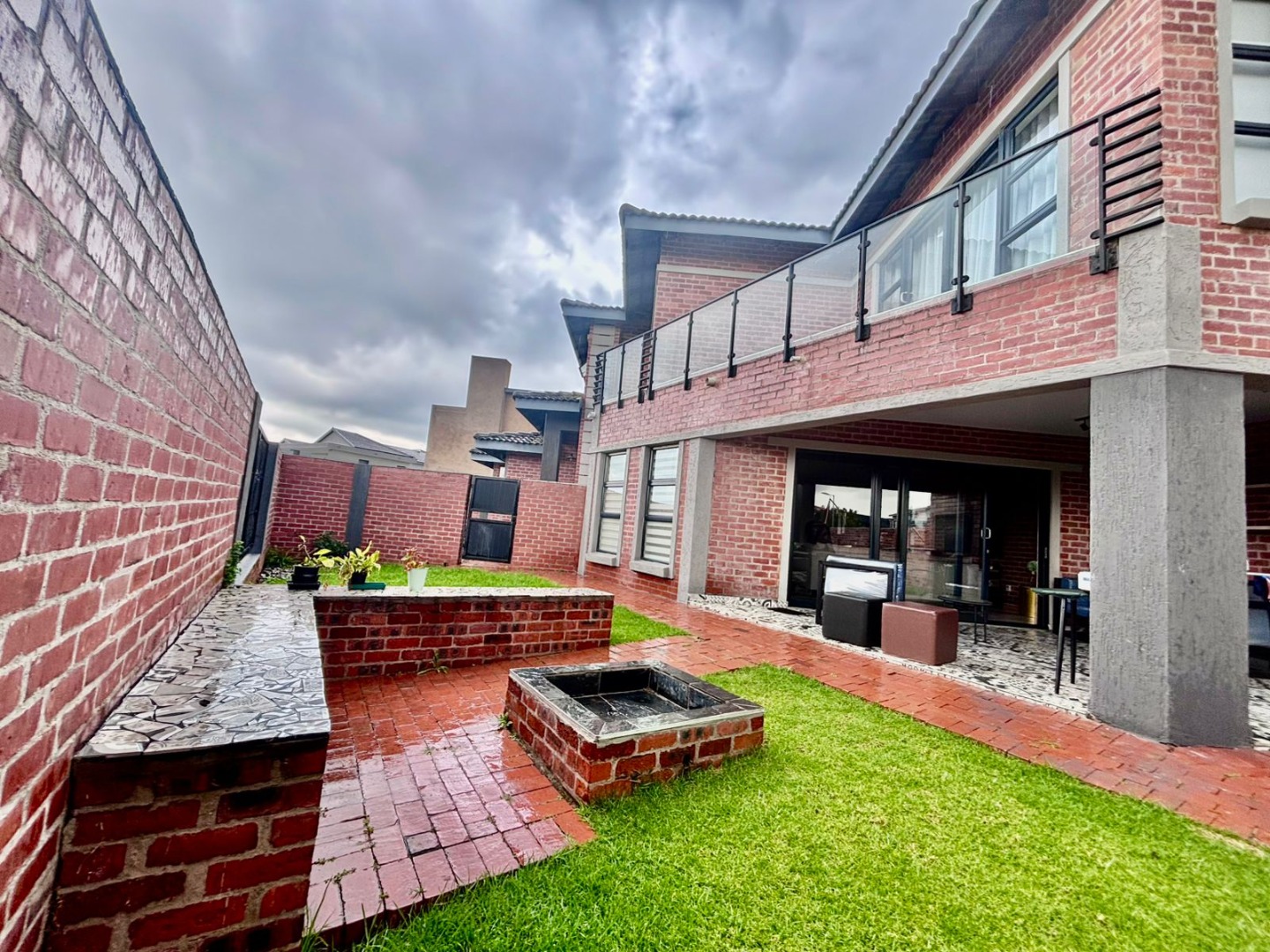 Nestled within a prestigious security estate, this magnificent residence presents an architectural masterpiece, seamlessly blending modern design with sophisticated functionality. The striking facade, characterized by its elegant brickwork and dark, contemporary accents, immediately captivates, offering a glimpse into the refined living experience within. A meticulously maintained front lawn and a paved driveway lead to a spacious double garage, providing ample secure parking for two vehicles. Multiple private balconies adorn the exterior, promising serene outdoor retreats and enhancing the property's distinguished kerb appeal, all set within the tranquil embrace of a well-managed estate. Step inside to discover an expansive open-plan living and dining area, a testament to contemporary design and effortless flow. This vibrant heart of the home is bathed in abundant natural light, streaming through large, multi-paned glass doors that invite the outdoors in. The aesthetic is defined by a chic industrial-inspired design, prominently featuring stylish exposed brick accent walls that add character and warmth. Sleek, large-format tiled flooring extends throughout, ensuring both elegance and ease of maintenance. Modern lighting fixtures, including a captivating chandelier and versatile track lighting, illuminate the space, creating an inviting ambiance for both grand entertaining and intimate family moments. The gourmet kitchen, a culinary haven, is seamlessly integrated into the open-plan layout, boasting dark, sophisticated cabinetry and sleek black countertops that exude modern luxury. A striking black island with comfortable seating serves as both a practical workspace and a casual dining spot, complete with an integrated wine rack for the connoisseur. High-end stainless steel appliances, including a range hood and stove, are complemented by a tasteful herringbone tile backsplash. A well-appointed pantry ensures ample storage, while sliding doors provide direct access to a private patio and garden, perfect for al fresco dining and relaxation. The thoughtful inclusion of a built-in braai further elevates the outdoor entertaining possibilities. Ascend to the upper level where three generously proportioned bedrooms await, each a private sanctuary designed for ultimate comfort and repose. A hallmark of this exquisite home is the provision of three luxurious en-suite bathrooms, ensuring unparalleled privacy and convenience for every resident. Each bathroom is appointed with modern fixtures and finishes, reflecting the property's overall commitment to quality. Furthermore, a stylish guest toilet on the main level caters to visitors with grace. The presence of multiple balconies offers residents personal outdoor spaces to enjoy the fresh air and views, adding another layer of luxury to these private quarters. Beyond its aesthetic appeal, this residence offers a lifestyle of peace of mind within a secure estate. Comprehensive security features include 24-hour security, an access gate, security post, and robust fencing, ensuring a protected environment for your family and pets. The property also embraces sustainable living with a solar geyser, contributing to energy efficiency and reduced utility costs. With a generous Erf size of 480 sqm and a floor size of 229 sqm, this home provides ample space for comfortable living, complemented by a well-maintained garden and paved areas. Pets are welcome, making this an ideal family abode. Key Features: * Three luxurious bedrooms, all with en-suite bathrooms * 3.5 bathrooms (three en-suite, one guest toilet) * Expansive open-plan living, dining, and kitchen areas with exposed brick accents * Modern gourmet kitchen featuring a black island, integrated wine rack, and pantry * Double garage and additional secure parking * Multiple private balconies and a patio with a built-in braai * Secure estate living with 24-hour security, access gate, and security post * Energy-efficient solar geyser * Pet-friendly environment * Generous Erf Size of 480 sqm and Floor Size of 229 sqm