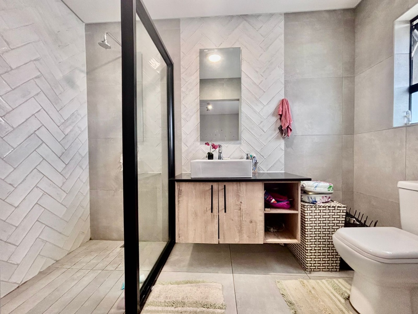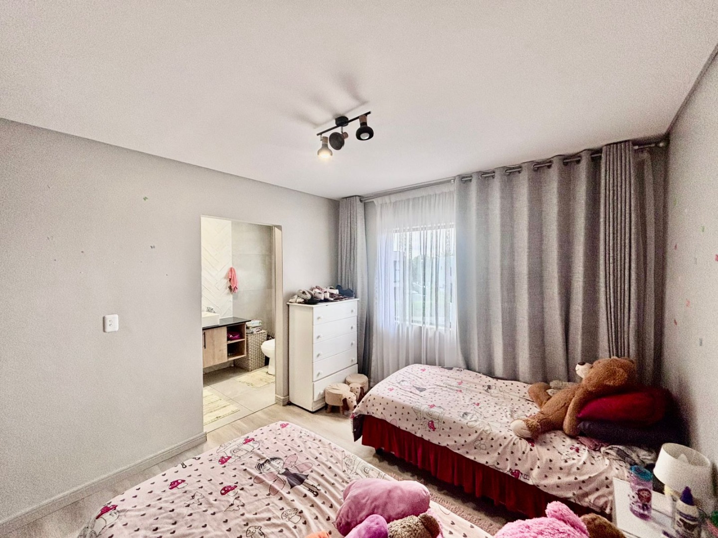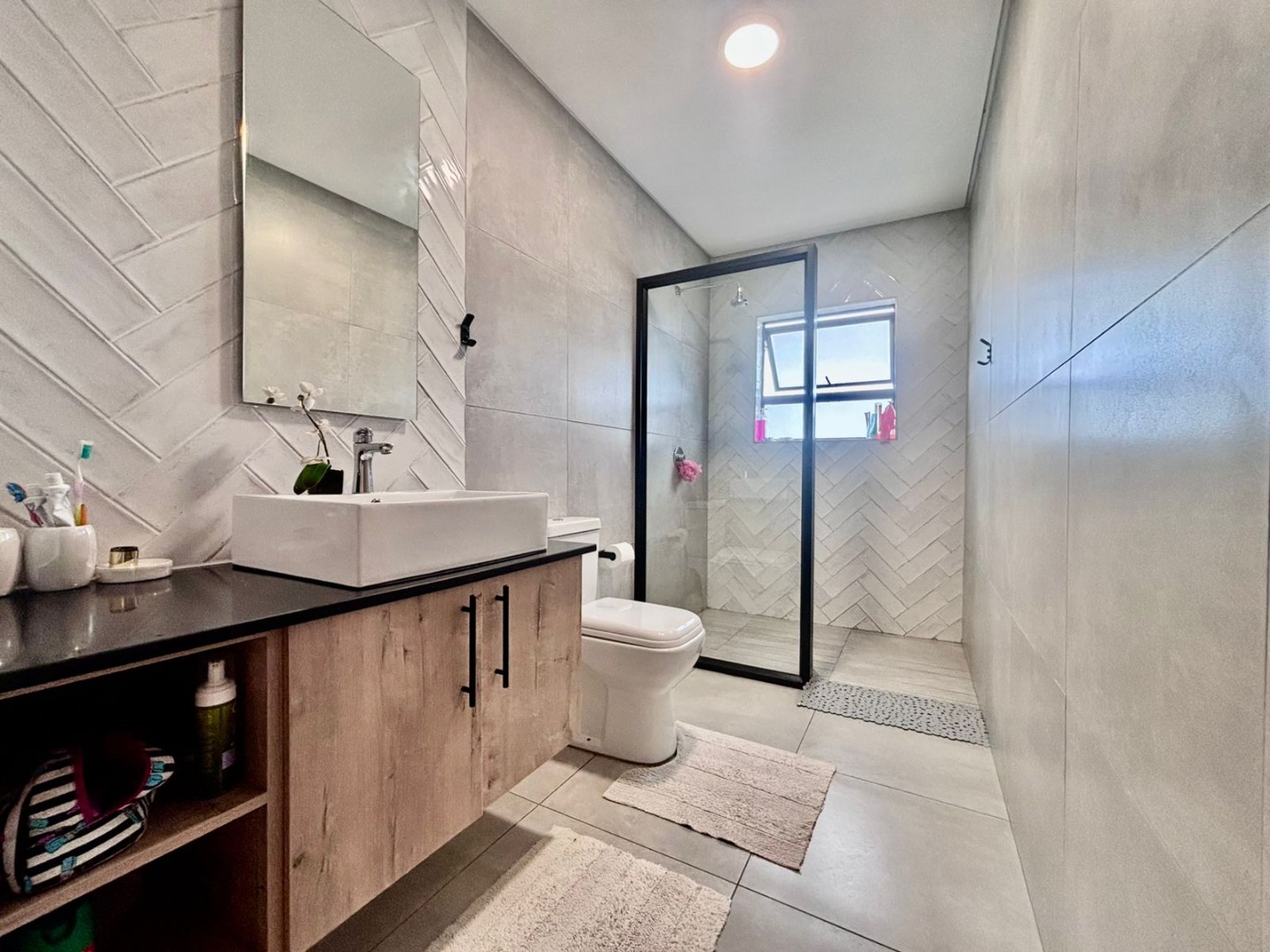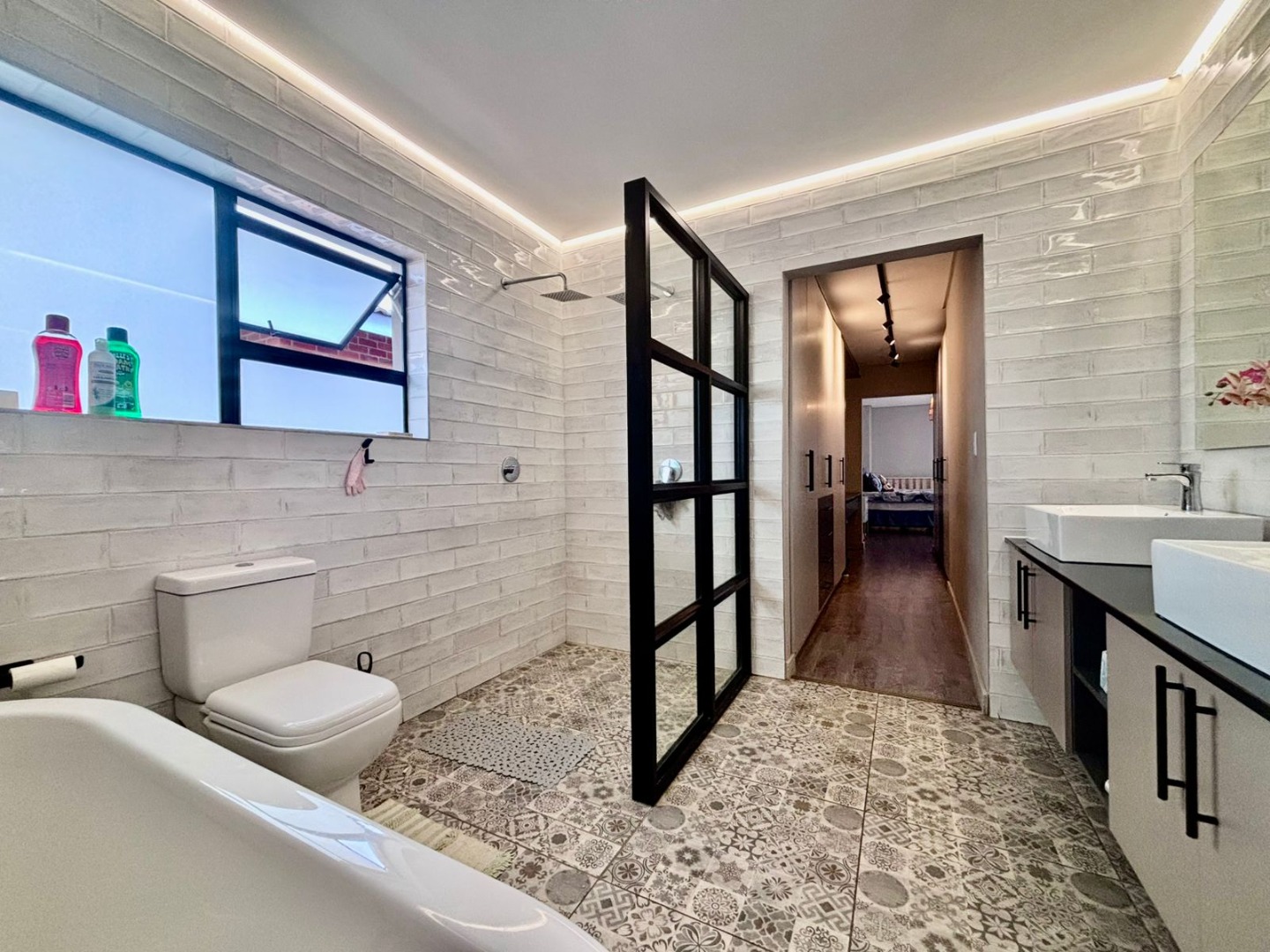 Nestled within a prestigious security estate, this magnificent residence presents an architectural masterpiece, seamlessly blending modern design with sophisticated functionality. The striking facade, characterized by its elegant brickwork and dark, contemporary accents, immediately captivates, offering a glimpse into the refined living experience within. A meticulously maintained front lawn and a paved driveway lead to a spacious double garage, providing ample secure parking for two vehicles. Multiple private balconies adorn the exterior, promising serene outdoor retreats and enhancing the property's distinguished kerb appeal, all set within the tranquil embrace of a well-managed estate. Step inside to discover an expansive open-plan living and dining area, a testament to contemporary design and effortless flow. This vibrant heart of the home is bathed in abundant natural light, streaming through large, multi-paned glass doors that invite the outdoors in. The aesthetic is defined by a chic industrial-inspired design, prominently featuring stylish exposed brick accent walls that add character and warmth. Sleek, large-format tiled flooring extends throughout, ensuring both elegance and ease of maintenance. Modern lighting fixtures, including a captivating chandelier and versatile track lighting, illuminate the space, creating an inviting ambiance for both grand entertaining and intimate family moments. The gourmet kitchen, a culinary haven, is seamlessly integrated into the open-plan layout, boasting dark, sophisticated cabinetry and sleek black countertops that exude modern luxury. A striking black island with comfortable seating serves as both a practical workspace and a casual dining spot, complete with an integrated wine rack for the connoisseur. High-end stainless steel appliances, including a range hood and stove, are complemented by a tasteful herringbone tile backsplash. A well-appointed pantry ensures ample storage, while sliding doors provide direct access to a private patio and garden, perfect for al fresco dining and relaxation. The thoughtful inclusion of a built-in braai further elevates the outdoor entertaining possibilities. Ascend to the upper level where three generously proportioned bedrooms await, each a private sanctuary designed for ultimate comfort and repose. A hallmark of this exquisite home is the provision of three luxurious en-suite bathrooms, ensuring unparalleled privacy and convenience for every resident. Each bathroom is appointed with modern fixtures and finishes, reflecting the property's overall commitment to quality. Furthermore, a stylish guest toilet on the main level caters to visitors with grace. The presence of multiple balconies offers residents personal outdoor spaces to enjoy the fresh air and views, adding another layer of luxury to these private quarters. Beyond its aesthetic appeal, this residence offers a lifestyle of peace of mind within a secure estate. Comprehensive security features include 24-hour security, an access gate, security post, and robust fencing, ensuring a protected environment for your family and pets. The property also embraces sustainable living with a solar geyser, contributing to energy efficiency and reduced utility costs. With a generous Erf size of 480 sqm and a floor size of 229 sqm, this home provides ample space for comfortable living, complemented by a well-maintained garden and paved areas. Pets are welcome, making this an ideal family abode. Key Features: * Three luxurious bedrooms, all with en-suite bathrooms * 3.5 bathrooms (three en-suite, one guest toilet) * Expansive open-plan living, dining, and kitchen areas with exposed brick accents * Modern gourmet kitchen featuring a black island, integrated wine rack, and pantry * Double garage and additional secure parking * Multiple private balconies and a patio with a built-in braai * Secure estate living with 24-hour security, access gate, and security post * Energy-efficient solar geyser * Pet-friendly environment * Generous Erf Size of 480 sqm and Floor Size of 229 sqm