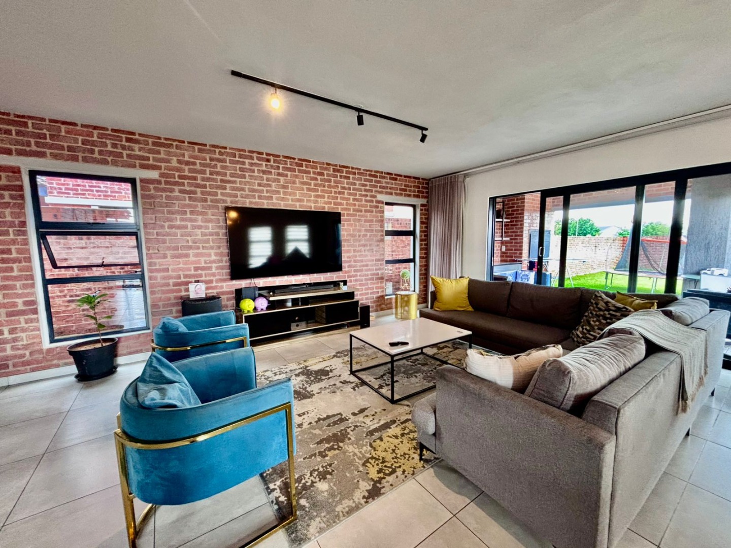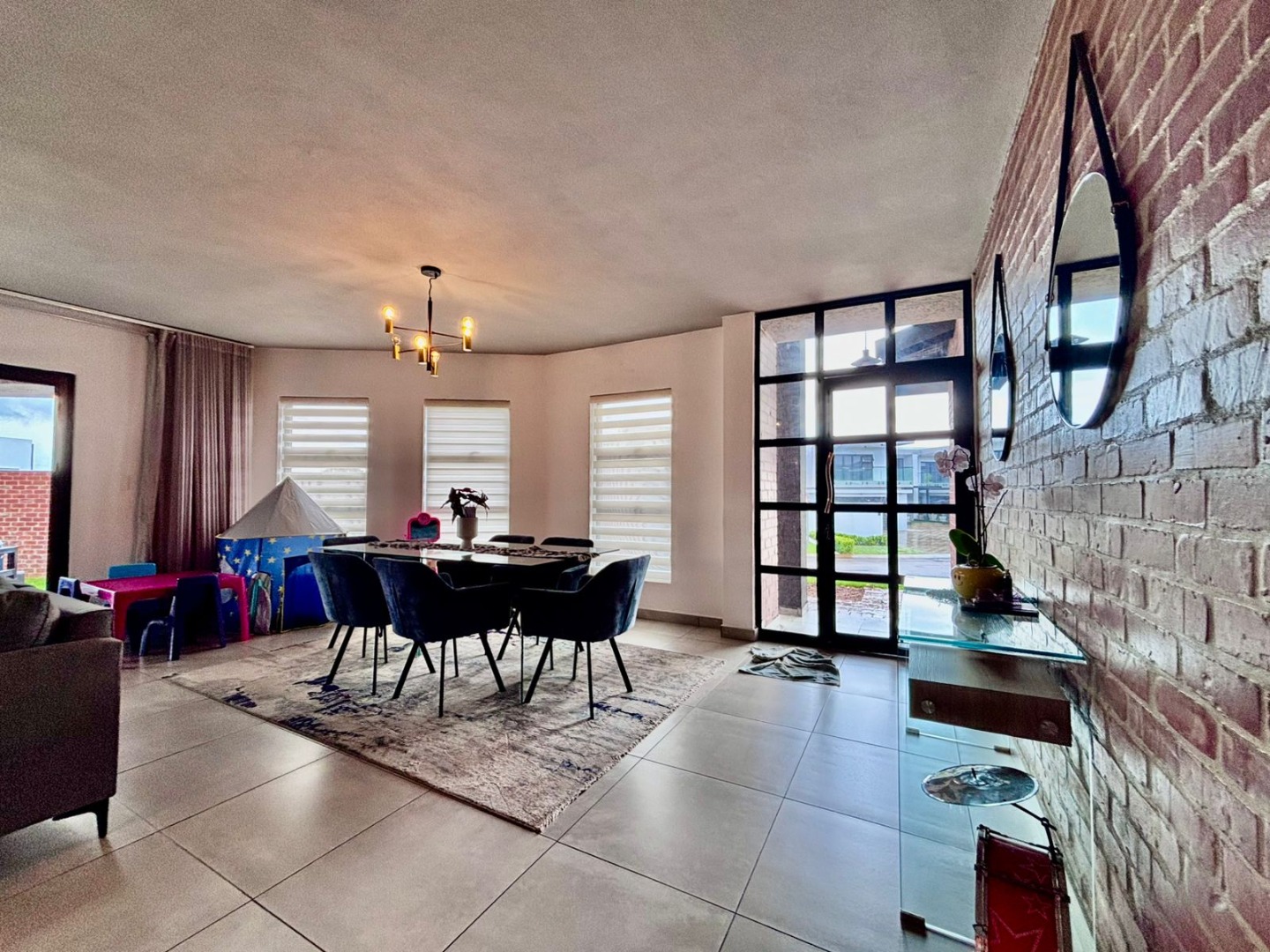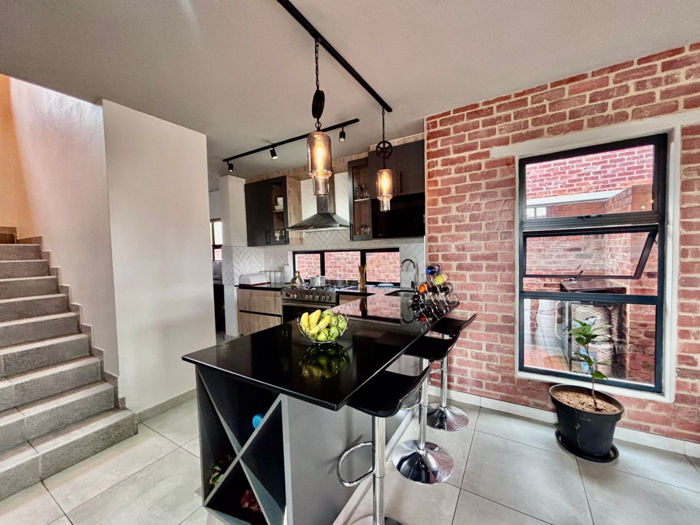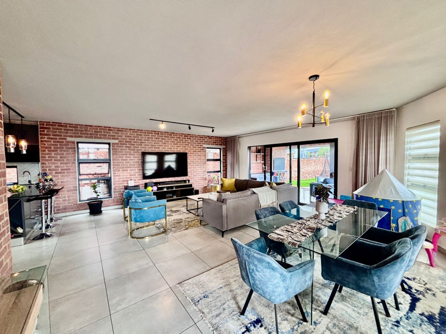 Nestled within a prestigious security estate, this magnificent residence presents an architectural masterpiece, seamlessly blending modern design with sophisticated functionality. The striking facade, characterized by its elegant brickwork and dark, contemporary accents, immediately captivates, offering a glimpse into the refined living experience within. A meticulously maintained front lawn and a paved driveway lead to a spacious double garage, providing ample secure parking for two vehicles. Multiple private balconies adorn the exterior, promising serene outdoor retreats and enhancing the property's distinguished kerb appeal, all set within the tranquil embrace of a well-managed estate. Step inside to discover an expansive open-plan living and dining area, a testament to contemporary design and effortless flow. This vibrant heart of the home is bathed in abundant natural light, streaming through large, multi-paned glass doors that invite the outdoors in. The aesthetic is defined by a chic industrial-inspired design, prominently featuring stylish exposed brick accent walls that add character and warmth. Sleek, large-format tiled flooring extends throughout, ensuring both elegance and ease of maintenance. Modern lighting fixtures, including a captivating chandelier and versatile track lighting, illuminate the space, creating an inviting ambiance for both grand entertaining and intimate family moments. The gourmet kitchen, a culinary haven, is seamlessly integrated into the open-plan layout, boasting dark, sophisticated cabinetry and sleek black countertops that exude modern luxury. A striking black island with comfortable seating serves as both a practical workspace and a casual dining spot, complete with an integrated wine rack for the connoisseur. High-end stainless steel appliances, including a range hood and stove, are complemented by a tasteful herringbone tile backsplash. A well-appointed pantry ensures ample storage, while sliding doors provide direct access to a private patio and garden, perfect for al fresco dining and relaxation. The thoughtful inclusion of a built-in braai further elevates the outdoor entertaining possibilities. Ascend to the upper level where three generously proportioned bedrooms await, each a private sanctuary designed for ultimate comfort and repose. A hallmark of this exquisite home is the provision of three luxurious en-suite bathrooms, ensuring unparalleled privacy and convenience for every resident. Each bathroom is appointed with modern fixtures and finishes, reflecting the property's overall commitment to quality. Furthermore, a stylish guest toilet on the main level caters to visitors with grace. The presence of multiple balconies offers residents personal outdoor spaces to enjoy the fresh air and views, adding another layer of luxury to these private quarters. Beyond its aesthetic appeal, this residence offers a lifestyle of peace of mind within a secure estate. Comprehensive security features include 24-hour security, an access gate, security post, and robust fencing, ensuring a protected environment for your family and pets. The property also embraces sustainable living with a solar geyser, contributing to energy efficiency and reduced utility costs. With a generous Erf size of 480 sqm and a floor size of 229 sqm, this home provides ample space for comfortable living, complemented by a well-maintained garden and paved areas. Pets are welcome, making this an ideal family abode. Key Features: * Three luxurious bedrooms, all with en-suite bathrooms * 3.5 bathrooms (three en-suite, one guest toilet) * Expansive open-plan living, dining, and kitchen areas with exposed brick accents * Modern gourmet kitchen featuring a black island, integrated wine rack, and pantry * Double garage and additional secure parking * Multiple private balconies and a patio with a built-in braai * Secure estate living with 24-hour security, access gate, and security post * Energy-efficient solar geyser * Pet-friendly environment * Generous Erf Size of 480 sqm and Floor Size of 229 sqm