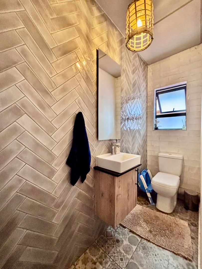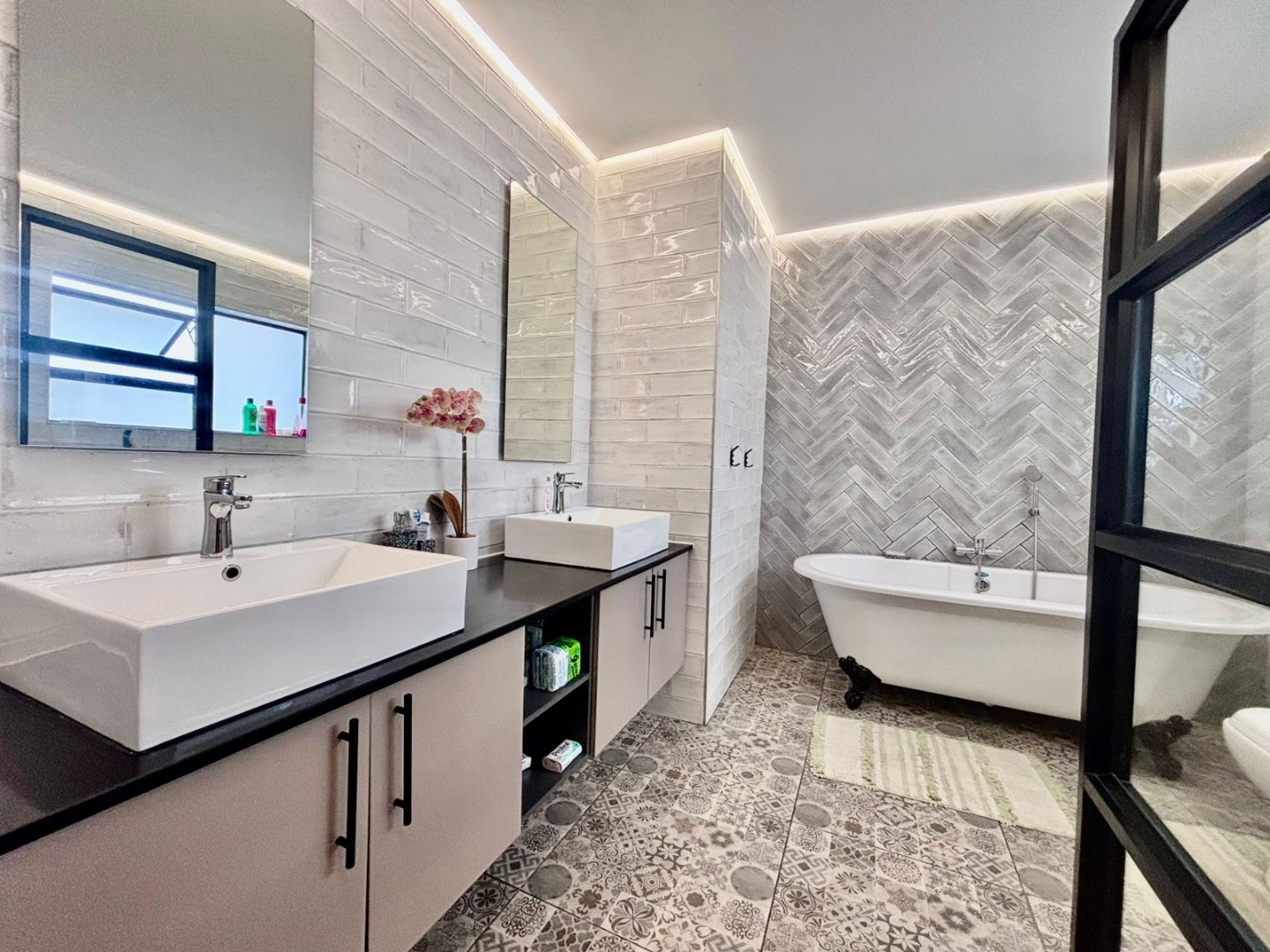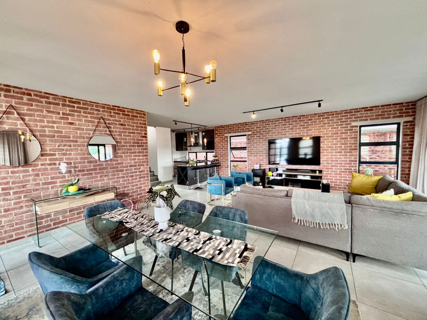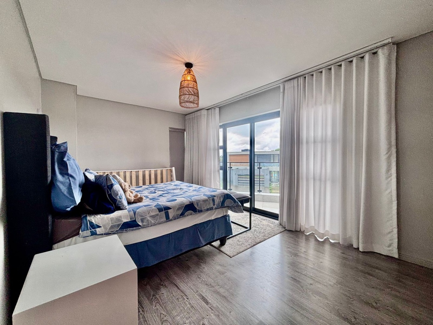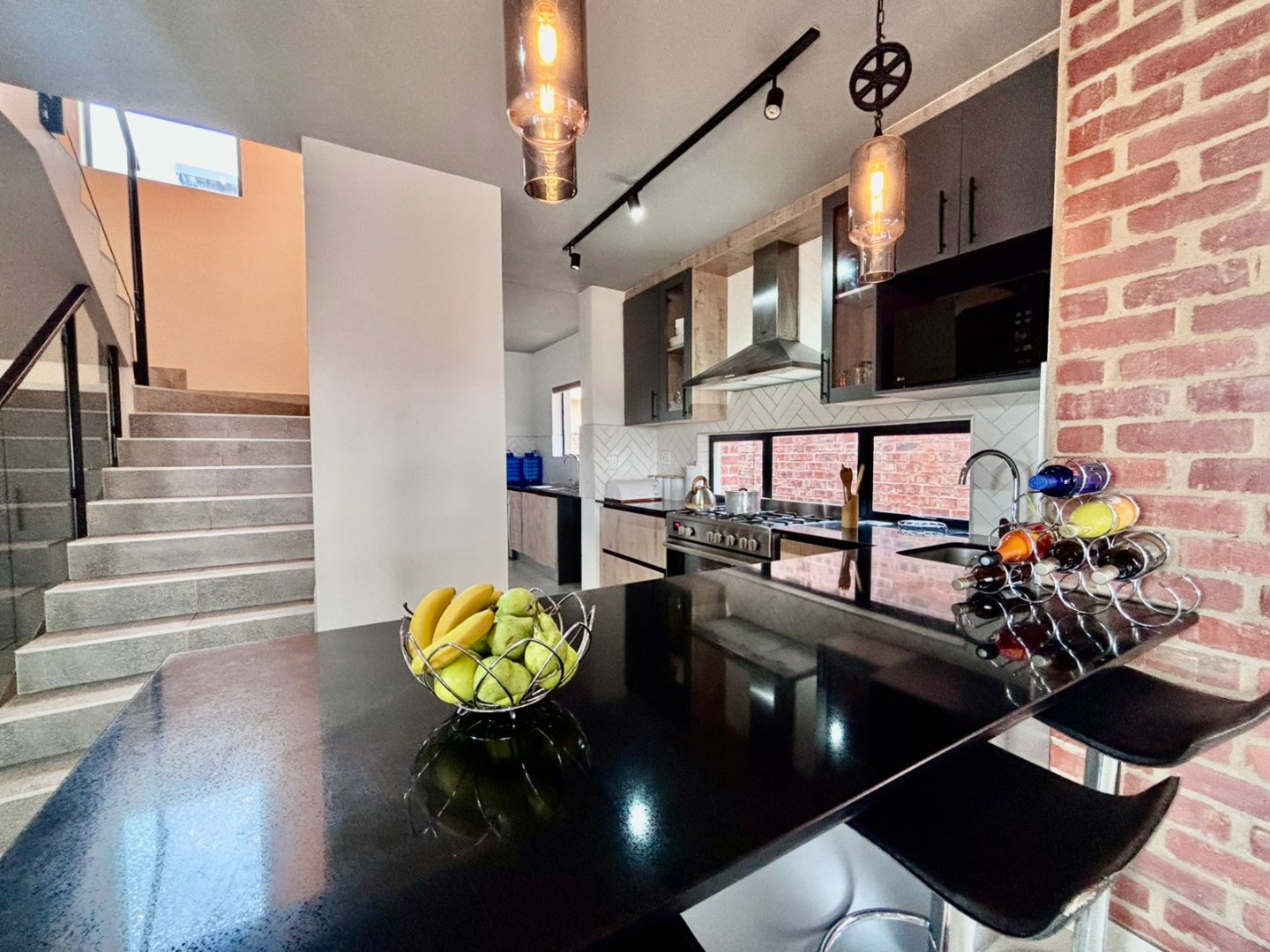 Nestled within a prestigious security estate, this magnificent residence presents an architectural masterpiece, seamlessly blending modern design with sophisticated functionality. The striking facade, characterized by its elegant brickwork and dark, contemporary accents, immediately captivates, offering a glimpse into the refined living experience within. A meticulously maintained front lawn and a paved driveway lead to a spacious double garage, providing ample secure parking for two vehicles. Multiple private balconies adorn the exterior, promising serene outdoor retreats and enhancing the property's distinguished kerb appeal, all set within the tranquil embrace of a well-managed estate. Step inside to discover an expansive open-plan living and dining area, a testament to contemporary design and effortless flow. This vibrant heart of the home is bathed in abundant natural light, streaming through large, multi-paned glass doors that invite the outdoors in. The aesthetic is defined by a chic industrial-inspired design, prominently featuring stylish exposed brick accent walls that add character and warmth. Sleek, large-format tiled flooring extends throughout, ensuring both elegance and ease of maintenance. Modern lighting fixtures, including a captivating chandelier and versatile track lighting, illuminate the space, creating an inviting ambiance for both grand entertaining and intimate family moments. The gourmet kitchen, a culinary haven, is seamlessly integrated into the open-plan layout, boasting dark, sophisticated cabinetry and sleek black countertops that exude modern luxury. A striking black island with comfortable seating serves as both a practical workspace and a casual dining spot, complete with an integrated wine rack for the connoisseur. High-end stainless steel appliances, including a range hood and stove, are complemented by a tasteful herringbone tile backsplash. A well-appointed pantry ensures ample storage, while sliding doors provide direct access to a private patio and garden, perfect for al fresco dining and relaxation. The thoughtful inclusion of a built-in braai further elevates the outdoor entertaining possibilities. Ascend to the upper level where three generously proportioned bedrooms await, each a private sanctuary designed for ultimate comfort and repose. A hallmark of this exquisite home is the provision of three luxurious en-suite bathrooms, ensuring unparalleled privacy and convenience for every resident. Each bathroom is appointed with modern fixtures and finishes, reflecting the property's overall commitment to quality. Furthermore, a stylish guest toilet on the main level caters to visitors with grace. The presence of multiple balconies offers residents personal outdoor spaces to enjoy the fresh air and views, adding another layer of luxury to these private quarters. Beyond its aesthetic appeal, this residence offers a lifestyle of peace of mind within a secure estate. Comprehensive security features include 24-hour security, an access gate, security post, and robust fencing, ensuring a protected environment for your family and pets. The property also embraces sustainable living with a solar geyser, contributing to energy efficiency and reduced utility costs. With a generous Erf size of 480 sqm and a floor size of 229 sqm, this home provides ample space for comfortable living, complemented by a well-maintained garden and paved areas. Pets are welcome, making this an ideal family abode. Key Features: * Three luxurious bedrooms, all with en-suite bathrooms * 3.5 bathrooms (three en-suite, one guest toilet) * Expansive open-plan living, dining, and kitchen areas with exposed brick accents * Modern gourmet kitchen featuring a black island, integrated wine rack, and pantry * Double garage and additional secure parking * Multiple private balconies and a patio with a built-in braai * Secure estate living with 24-hour security, access gate, and security post * Energy-efficient solar geyser * Pet-friendly environment * Generous Erf Size of 480 sqm and Floor Size of 229 sqm