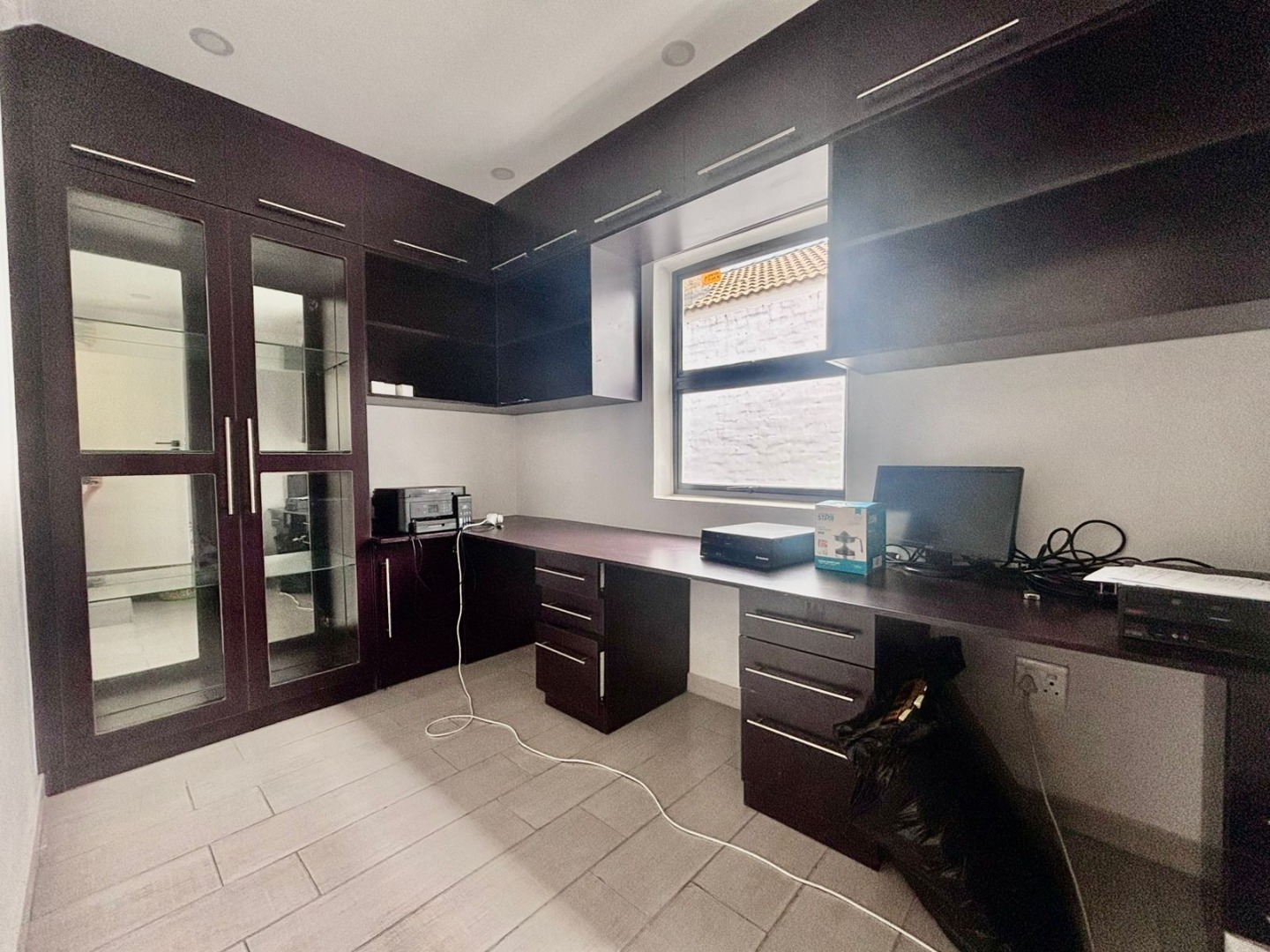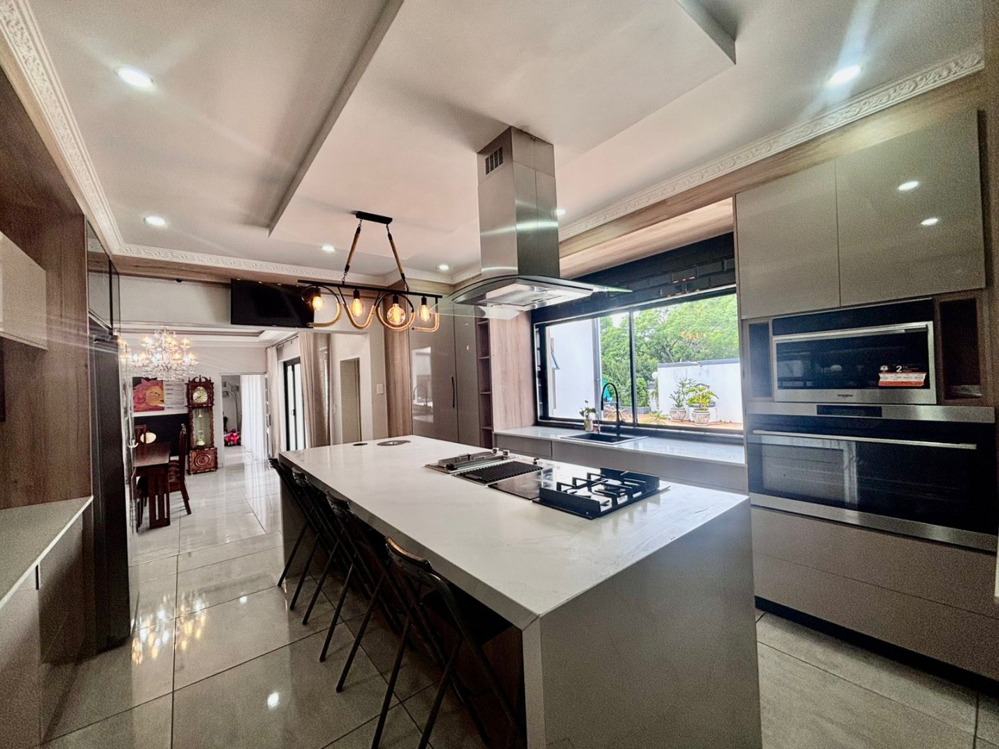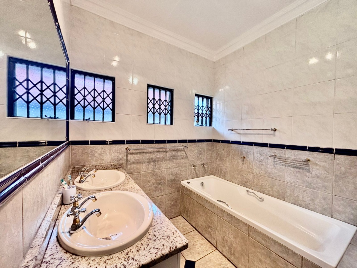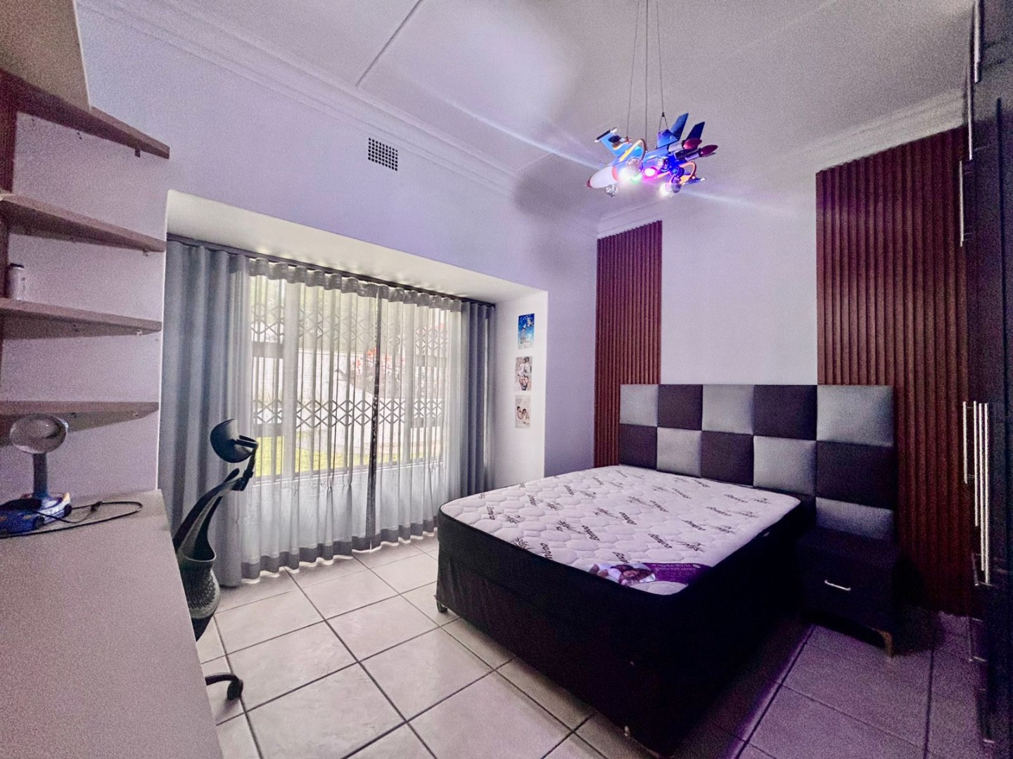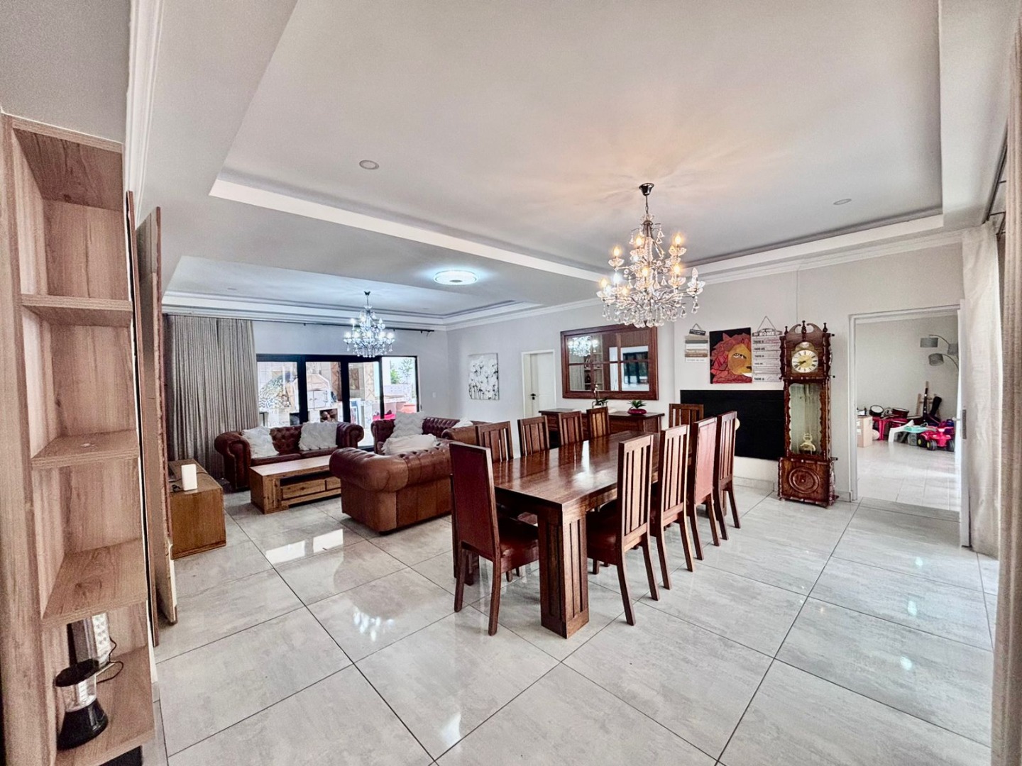 This distinguished residence, situated in the esteemed Waterkloof Ridge suburb of Pretoria, presents an imposing kerb appeal. A high, white perimeter wall, complemented by a decorative dark brown entrance gate, ensures privacy and security, setting a sophisticated tone upon arrival. Mature trees flank the entrance, providing both shade and an established aesthetic, while a meticulously maintained front lawn and brick-paved driveway enhance the property's welcoming facade. The property is nestled within a gated community, offering an elevated sense of security and exclusivity within this desirable suburban locale. Upon entering through the grand entrance hall, one is immediately struck by the expansive and versatile interior spaces. The residence boasts a generous configuration of seven bedrooms and four bathrooms, including two en-suite facilities, providing ample accommodation for a large family or for hosting guests. The main living areas feature clean, light-coloured tiled flooring and freshly painted white walls, creating a bright and airy ambiance that serves as a neutral canvas for personal customisation. A dedicated lounge, a formal dining room, and a family TV room offer distinct zones for relaxation and entertainment. The property further includes a functional kitchen, a convenient pantry, and a guest toilet, ensuring comprehensive amenities for daily living. The seven bedrooms are designed for comfort and privacy. One notable bedroom features light grey walls, durable tiled flooring, and a practical built-in wardrobe, offering efficient storage solutions. This particular bedroom benefits from an en-suite shower bathroom, providing direct and convenient access. The overall design ethos prioritises functionality and ease of maintenance, with tiled flooring prevalent throughout the sleeping quarters and bathrooms. While some elements may present an opportunity for aesthetic updates, the foundational structure is robust and well-maintained. The outdoor living spaces are a significant highlight of this property, designed for both relaxation and entertainment. A private courtyard features a large, clean swimming pool adorned with a charming dolphin mosaic, creating an inviting focal point. Extensive paved outdoor entertainment areas and a spacious tiled patio provide ample room for al fresco dining and social gatherings. A covered veranda overlooks the pool, offering a shaded retreat. The property is complemented by a well-maintained garden with an irrigation system and paving, enhancing its aesthetic appeal. For vehicle accommodation, a substantial garage provides space for three vehicles, supplemented by three additional parking bays. Further practical amenities include a dedicated laundry room, domestic rooms, a built-in braai, and a fireplace, catering to diverse lifestyle requirements. The presence of a borehole ensures water resilience for the garden. Security is paramount, with the property benefiting from its location within a gated community. Enhanced security features include an alarm system, electric fencing, and an access gate, providing residents with peace of mind. The residence is equipped with air conditioning for climate control and a solar geyser, contributing to energy efficiency and reduced utility costs. These provisions underscore a commitment to both safety and sustainable living within this suburban setting. Waterkloof Ridge is a highly sought-after residential area in Pretoria, renowned for its tranquil environment and convenient access to essential amenities. This suburban enclave offers a desirable lifestyle, combining peaceful living with proximity to urban conveniences. Its established character and community focus make it an ideal location for discerning homeowners. Key Features: * Seven Bedrooms and Four Bathrooms (Two En-suite) * Three Garages and Three Additional Parking Bays * Private Swimming Pool with Dolphin Mosaic * Expansive Paved Patio and Covered Veranda * Dedicated Lounge, Dining Room, Family TV Room, and Study * Gated Community with Alarm System and Electric Fencing * Air Conditioning and Solar Geyser * Borehole and Irrigation System * Domestic Rooms and Laundry Facilities * Built-in Braai and Fireplace