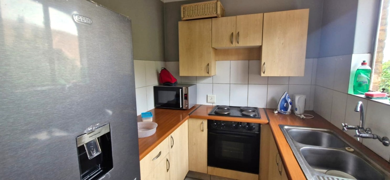 U-shaped kitchen with space for a fridge and washing machine, or dishwasher, if one adds plumbing in the lockup garage for the washing machine. The footboards do need attention.