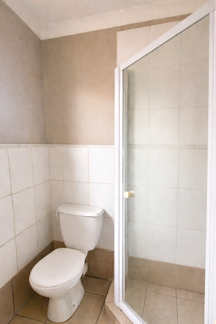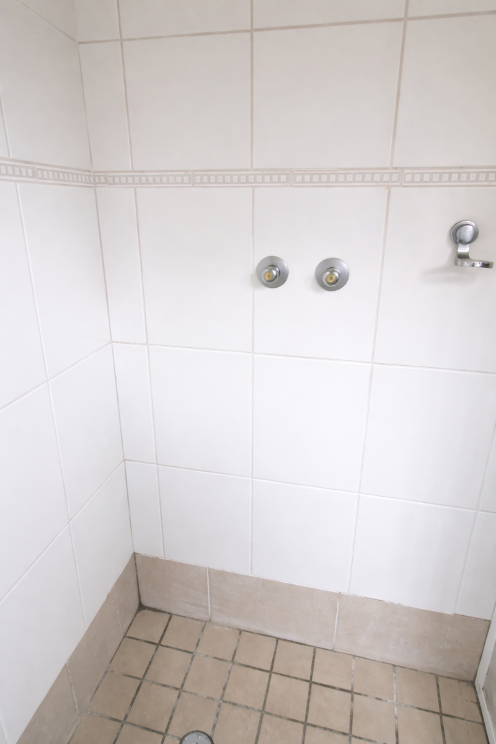 1 bathroom with shower, basin and toilet. The tile grout in the shower may need replacement.
