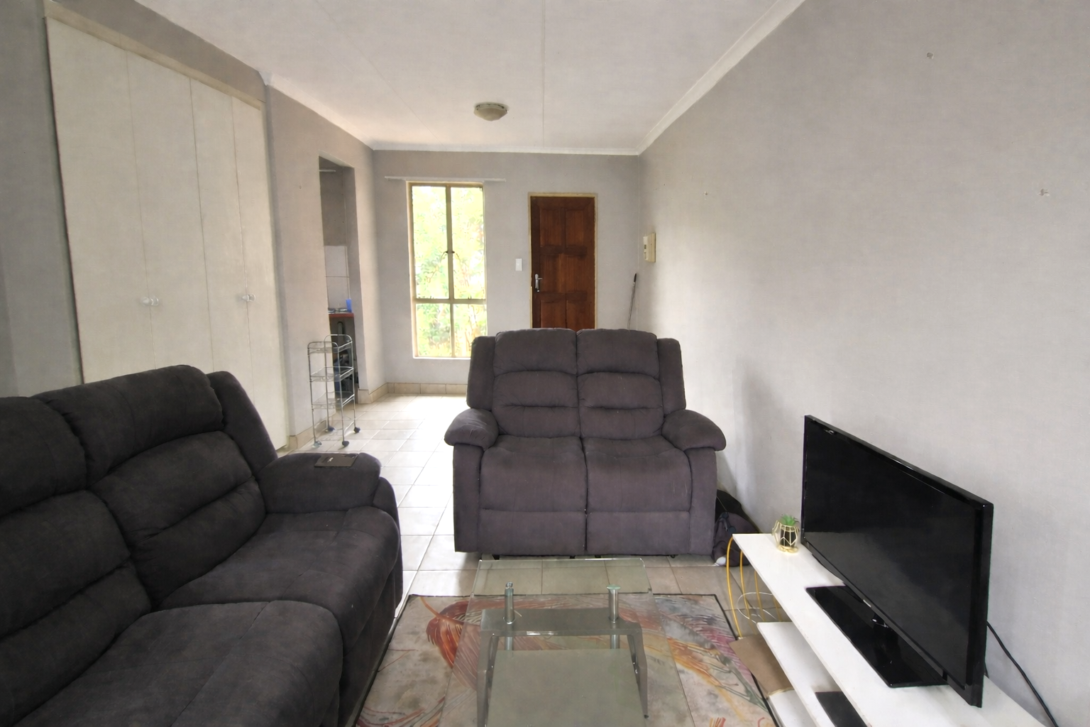 The lounge has built-in cupboards and leads out to a balcony and a bit of a view.