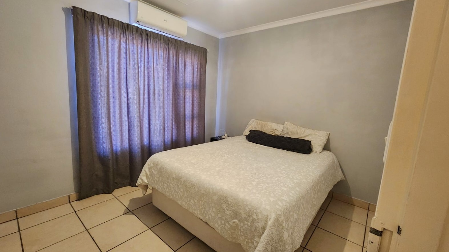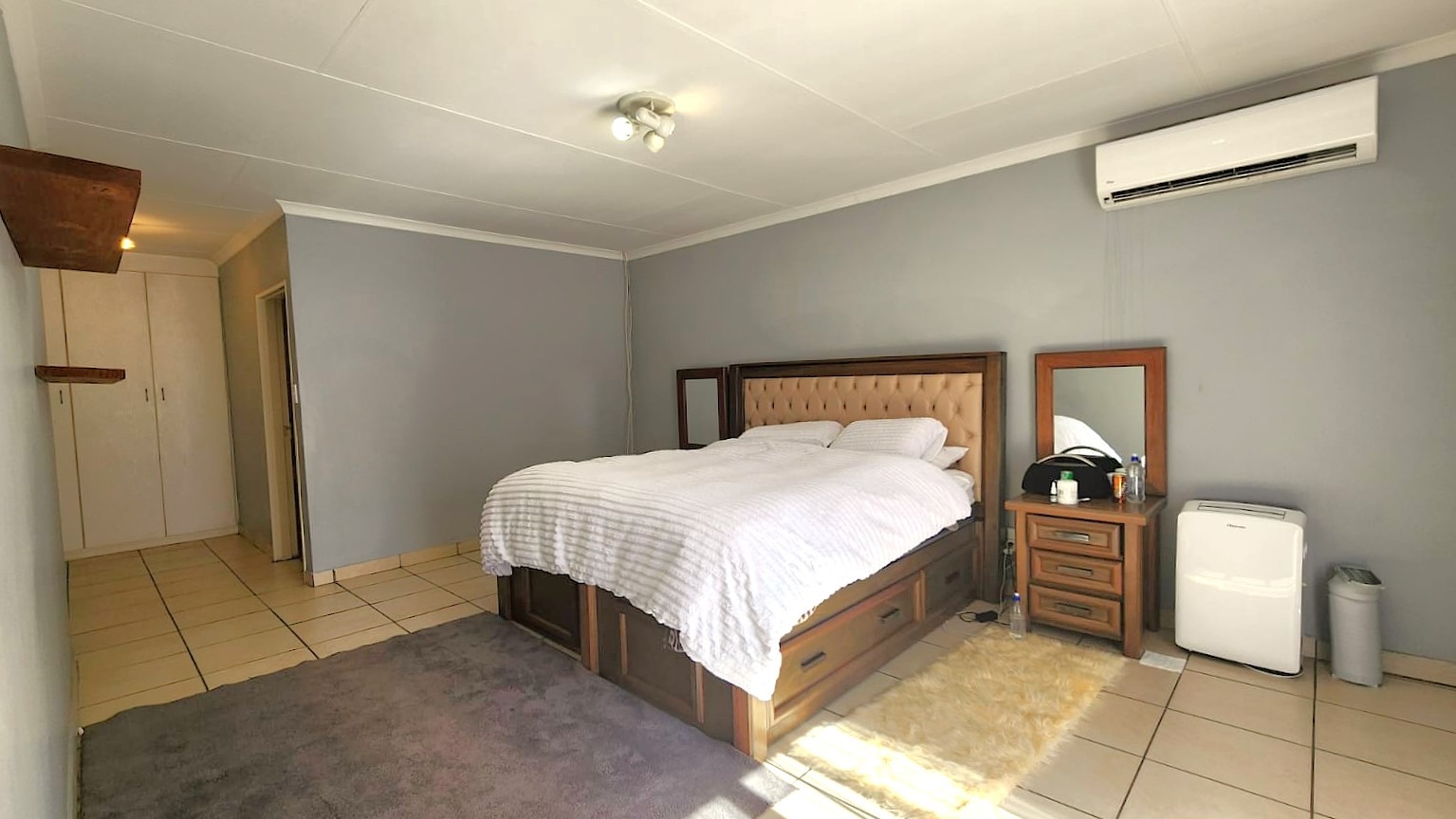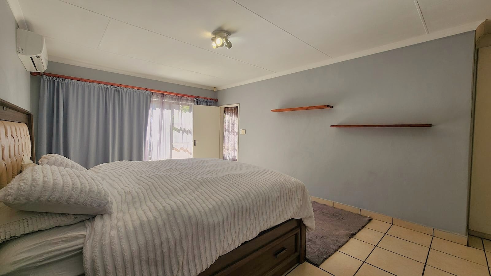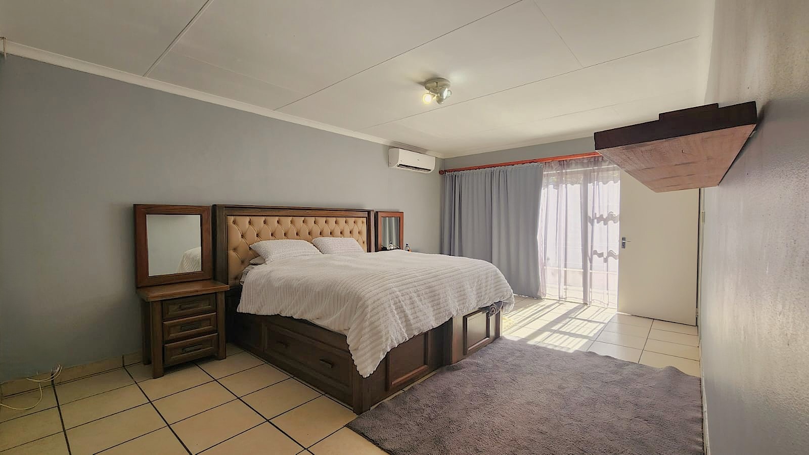 Upstairs, the home offers a generously proportioned main bedroom, also fitted with air conditioning, with ample built-in cupboard space and a full en-suite bathroom. This private retreat opens onto a balcony, providing a quiet space to relax and unwind.