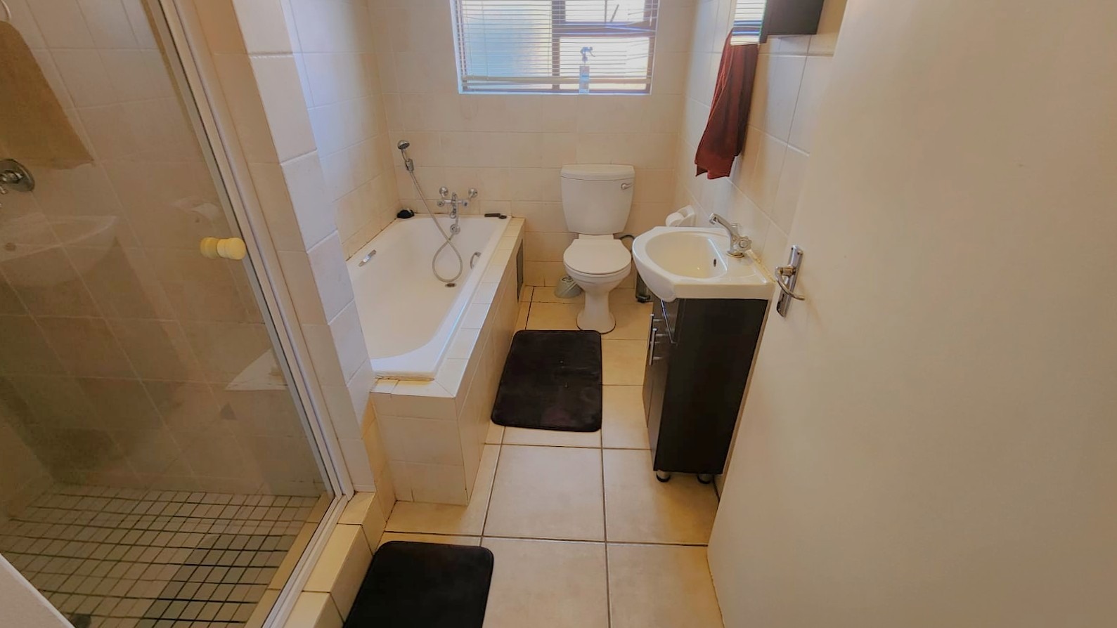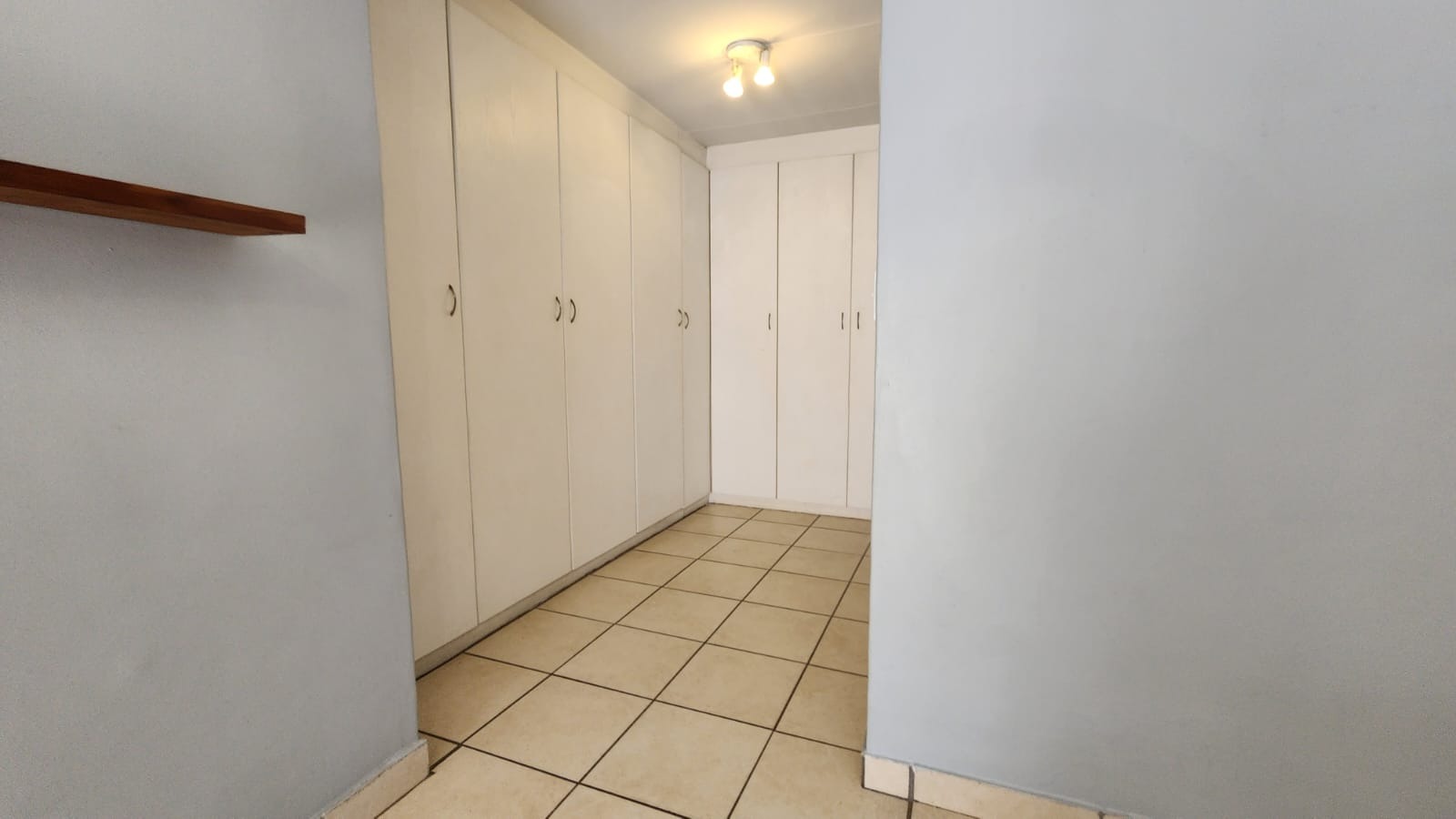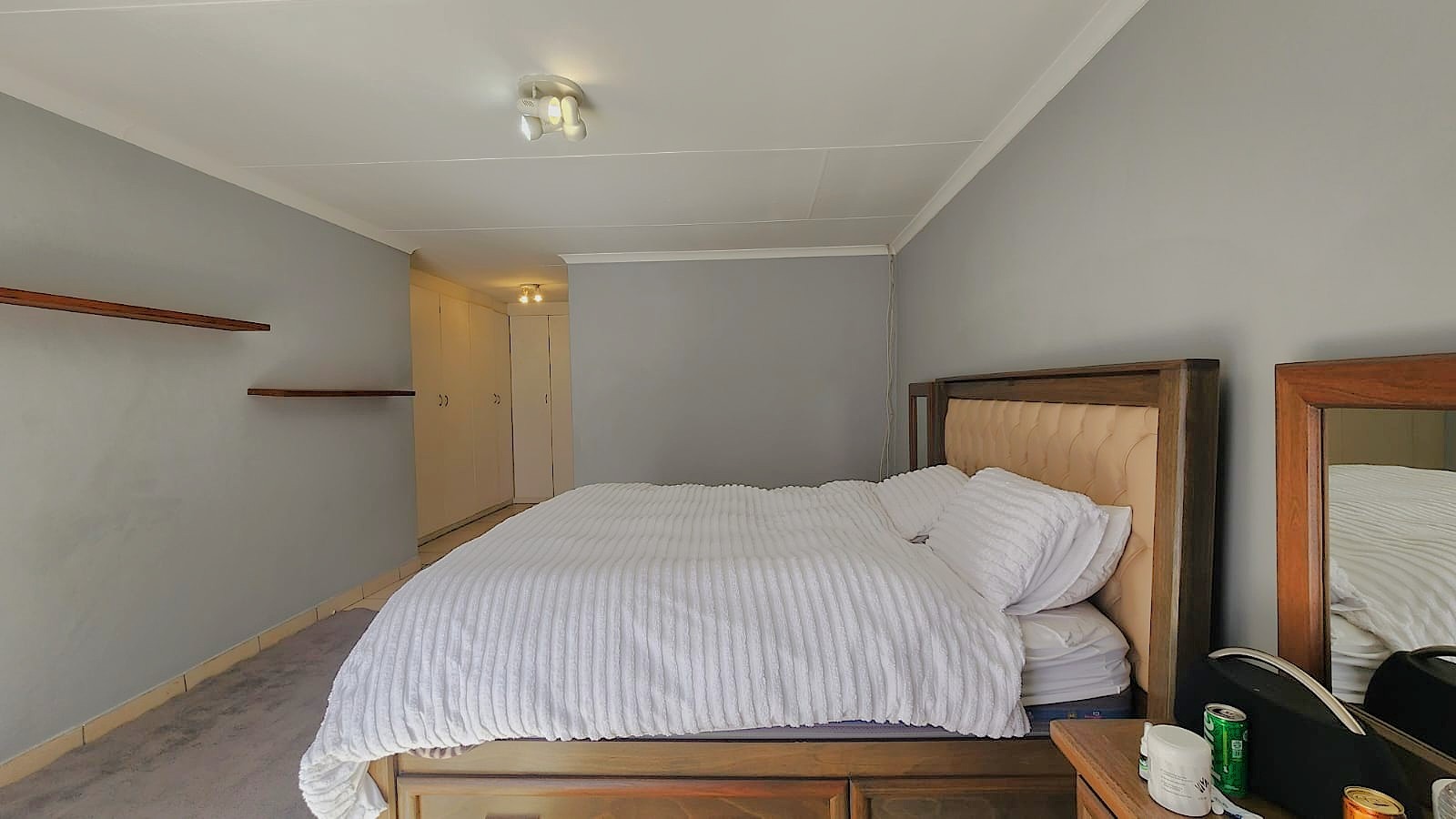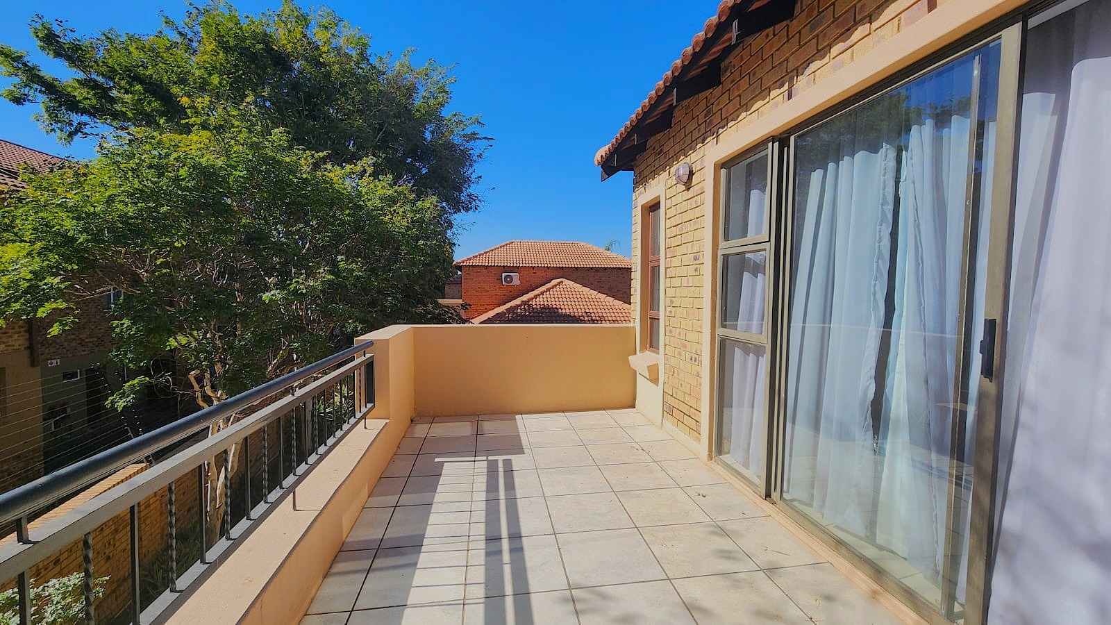 Upstairs, the home offers a generously proportioned main bedroom, also fitted with air conditioning, with ample built-in cupboard space and a full en-suite bathroom. This private retreat opens onto a balcony, providing a quiet space to relax and unwind.