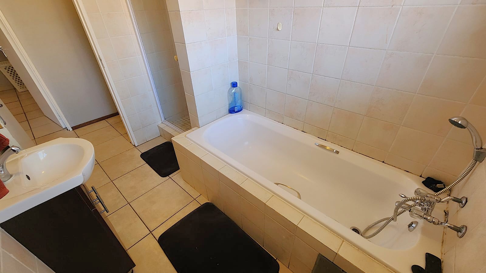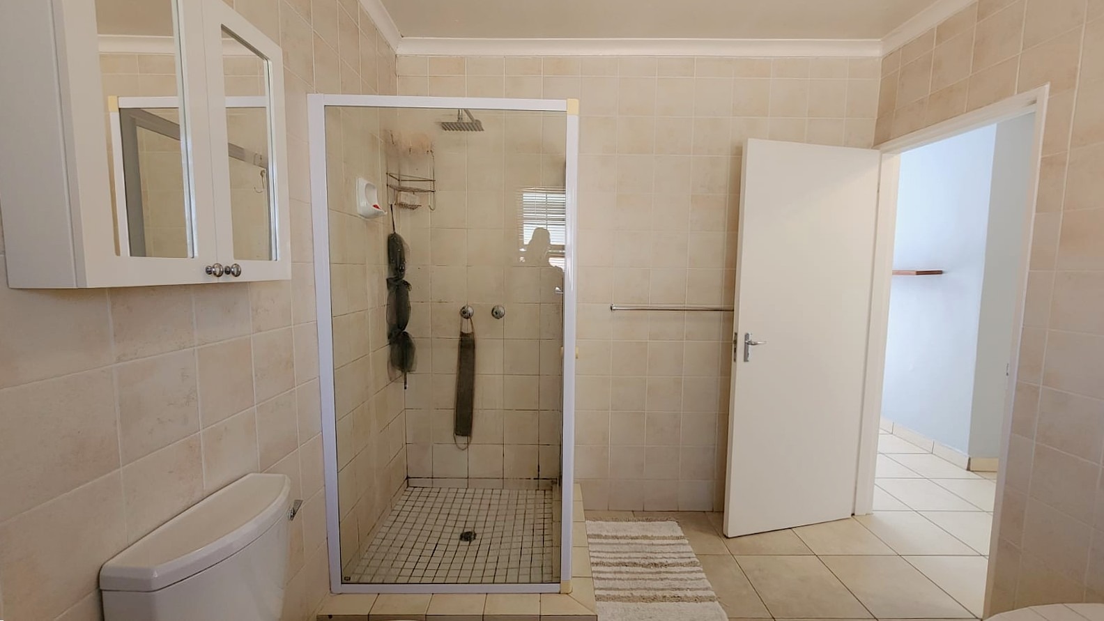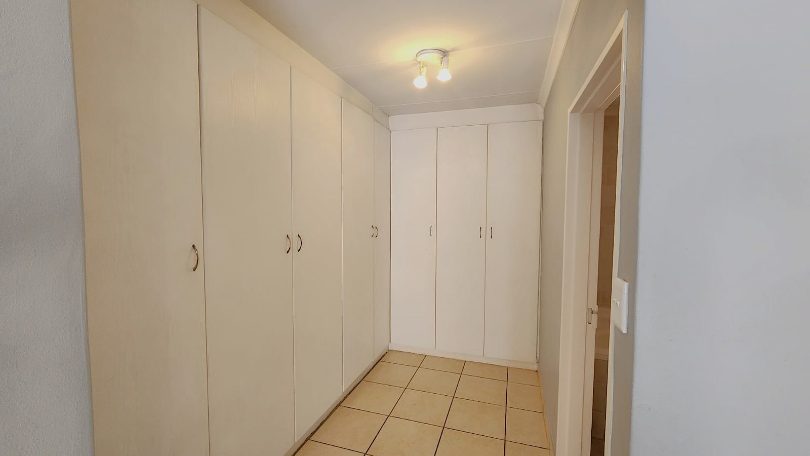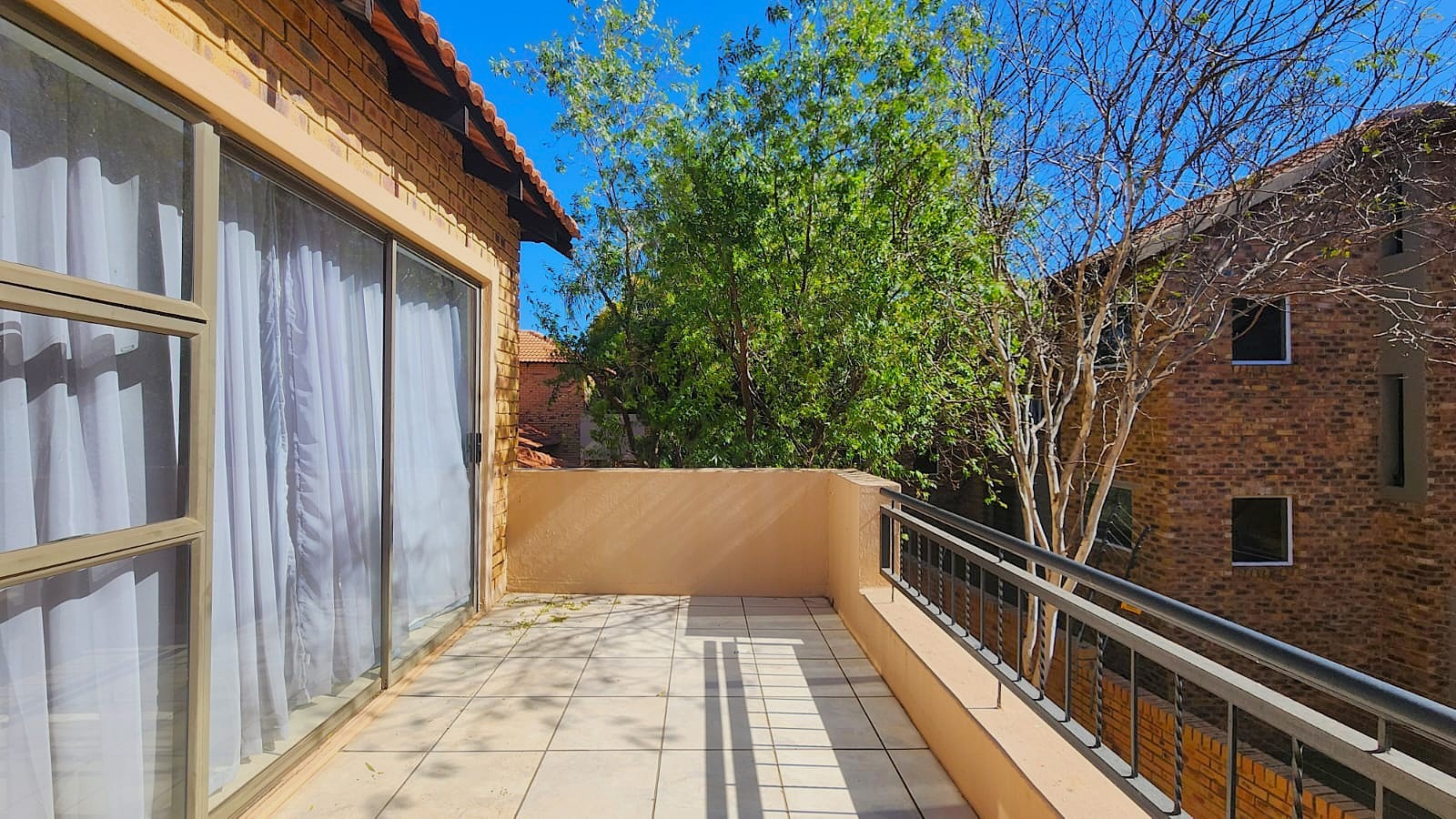 Upstairs, the home offers a generously proportioned main bedroom, also fitted with air conditioning, with ample built-in cupboard space and a full en-suite bathroom. This private retreat opens onto a balcony, providing a quiet space to relax and unwind.
