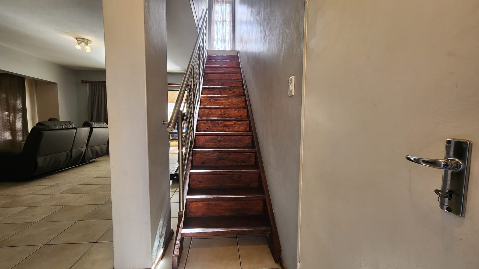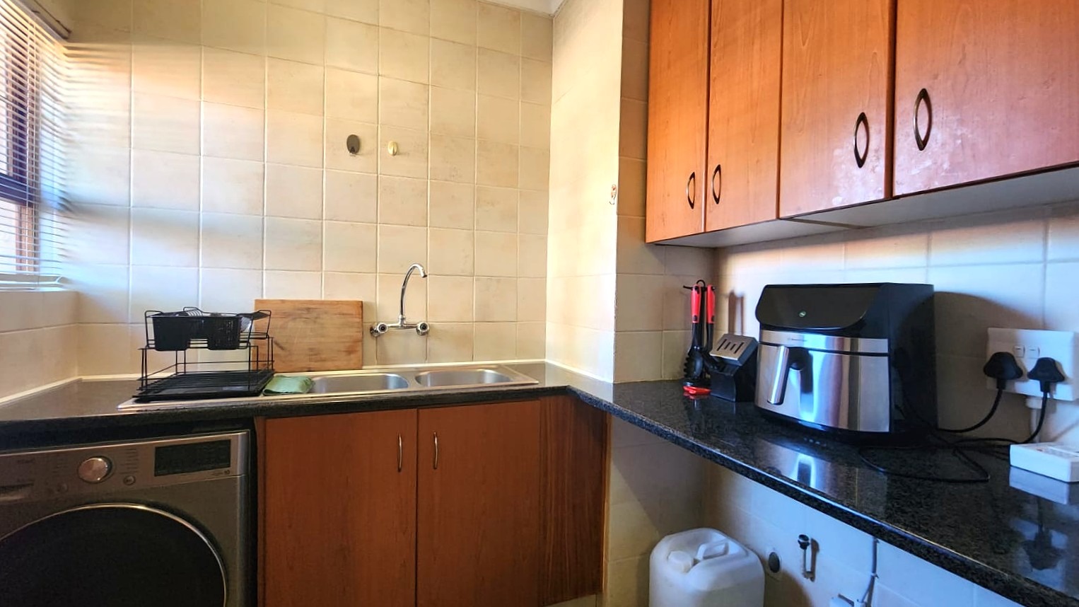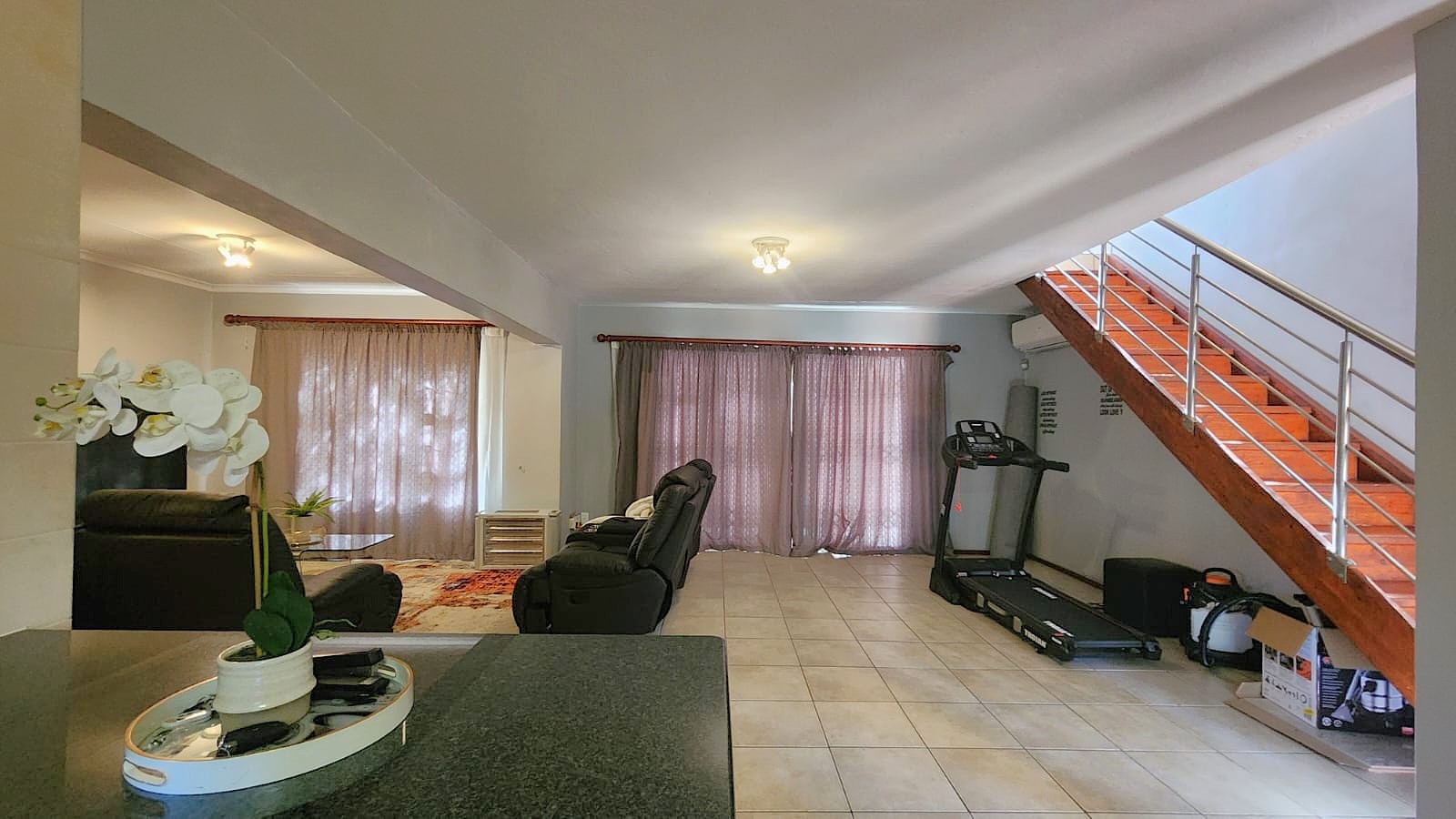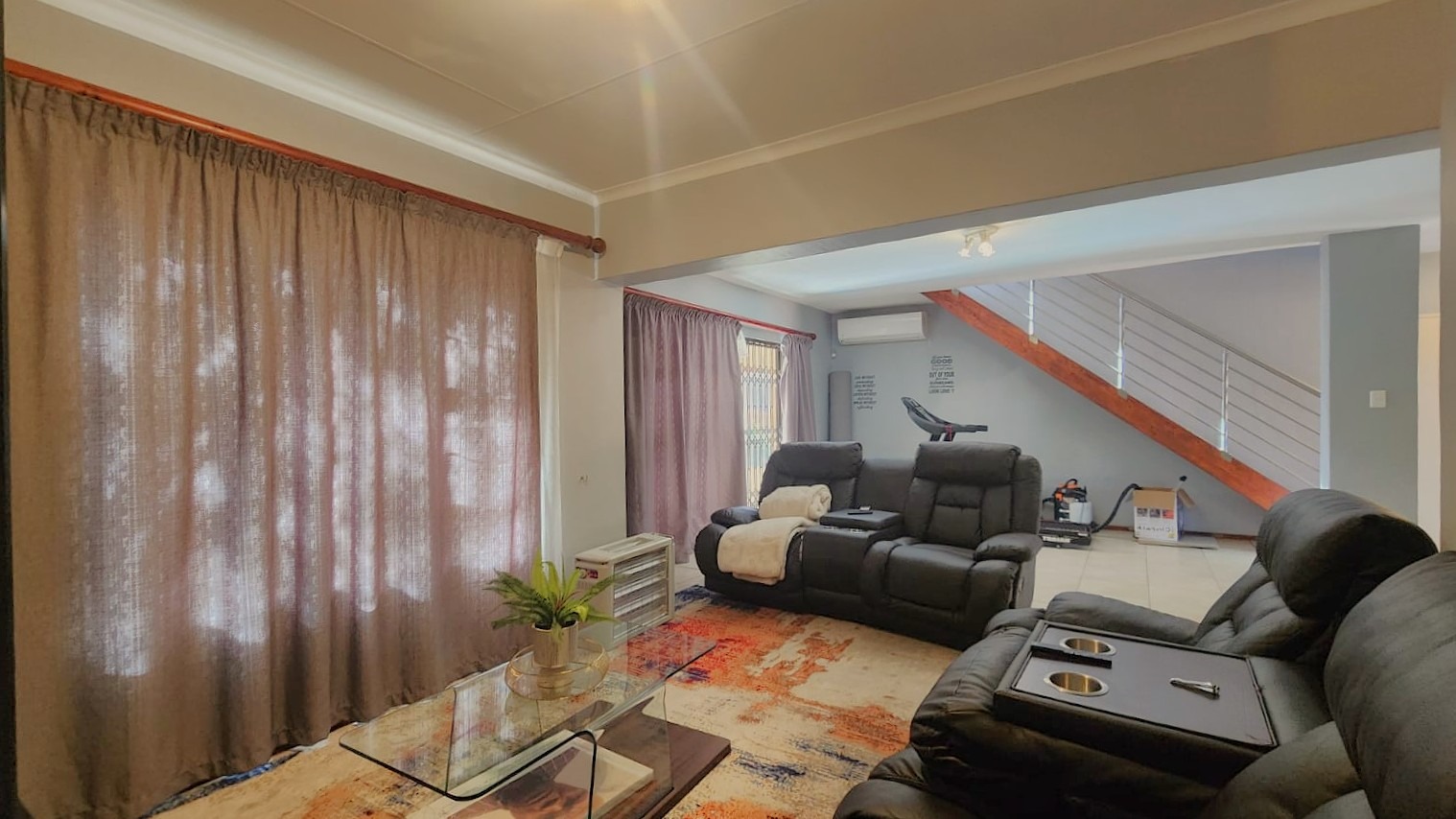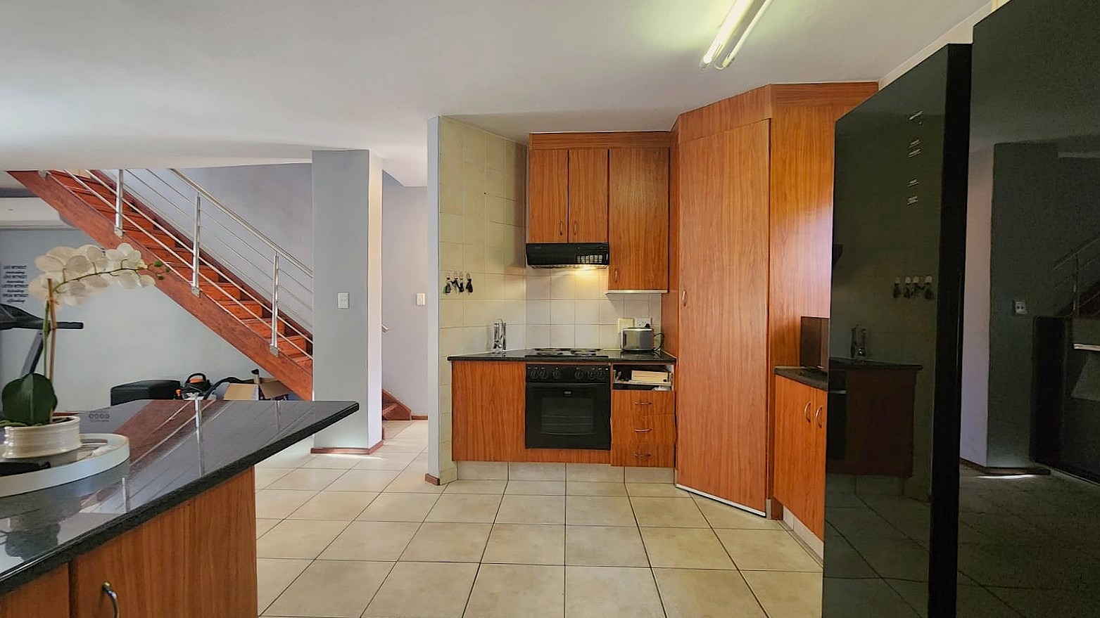 The ground floor features a bright open-plan living and dining area, fitted with air conditioning, and tiled floors throughout, flowing seamlessly into an open-plan kitchen designed for practicality and ease of use. The kitchen offers ample cupboard space, granite countertops, a breakfast nook, and the added benefit of a separate scullery/laundry area, keeping the main living space neat and uncluttered.