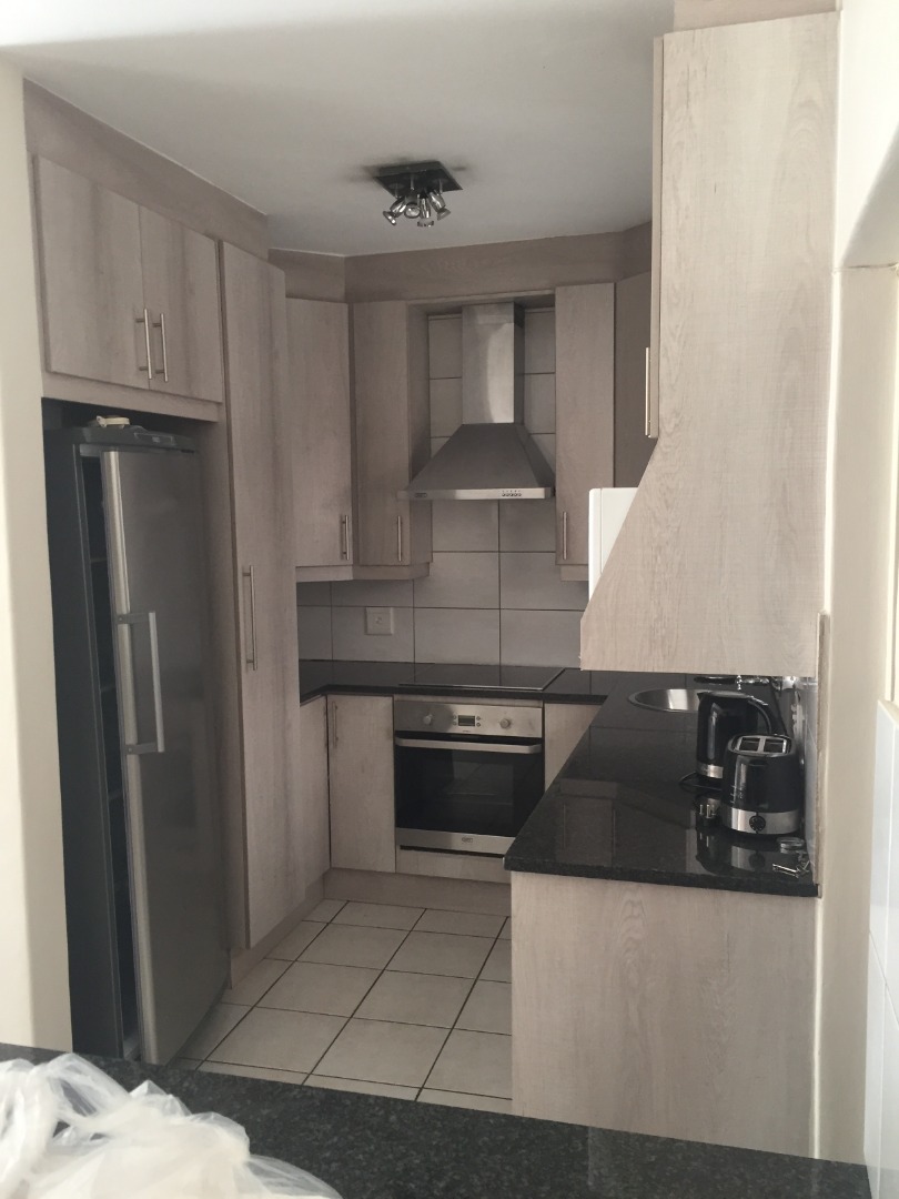 Discover this inviting 174 sqm residence located in the prestigious Woodhill Golf Estate, Pretoria. The home features a spacious living room, perfect for relaxation and entertaining, complete with tiled flooring and neutral walls that offer a versatile canvas for your personal style. An integrated entertainment setup enhances the living experience, while stairs lead to additional levels within the property. The modern, compact kitchen is a highlight, boasting light wood-grain cabinetry, sleek dark granite-style countertops, and essential stainless steel appliances including an oven, hob, and extractor fan. Tiled flooring and a clean backsplash ensure easy maintenance, complemented by ample storage solutions.