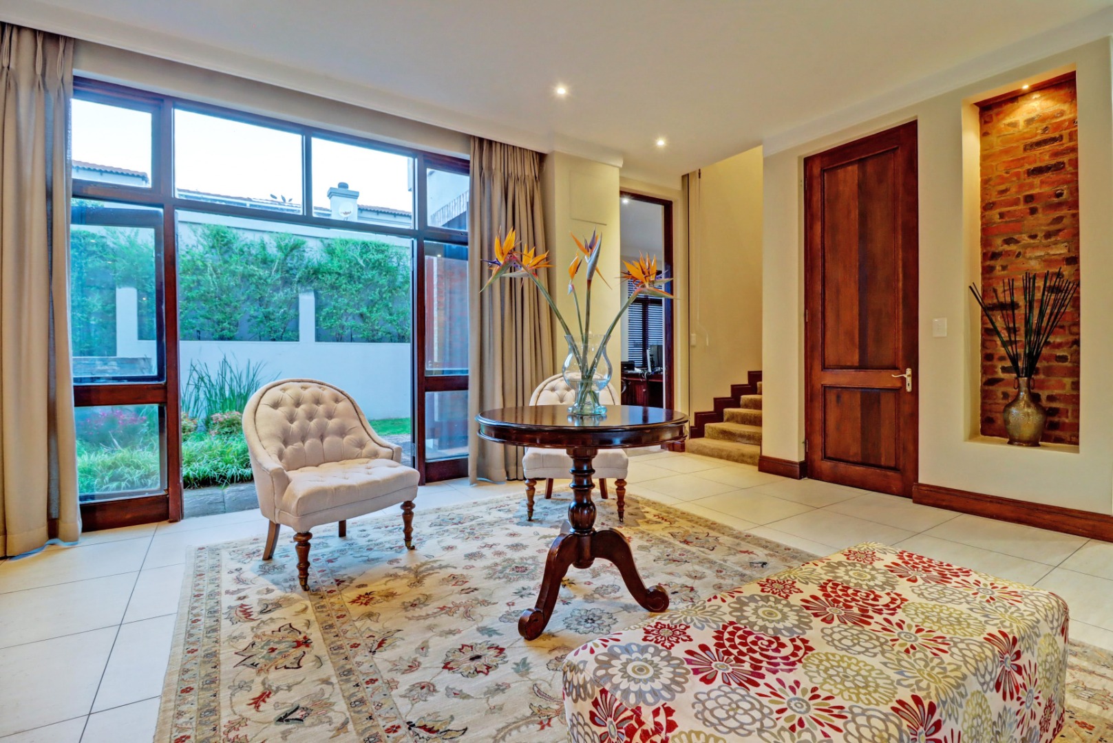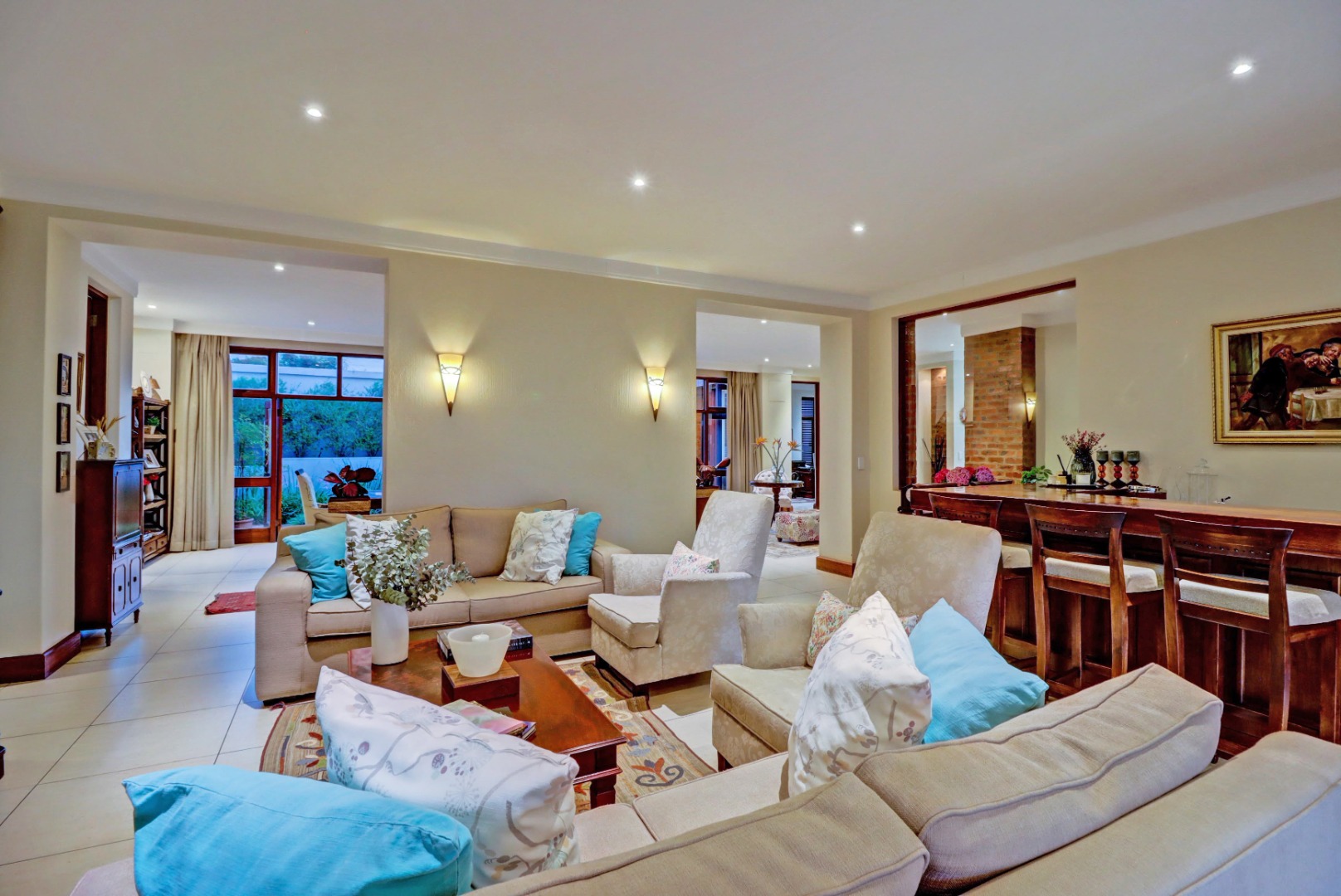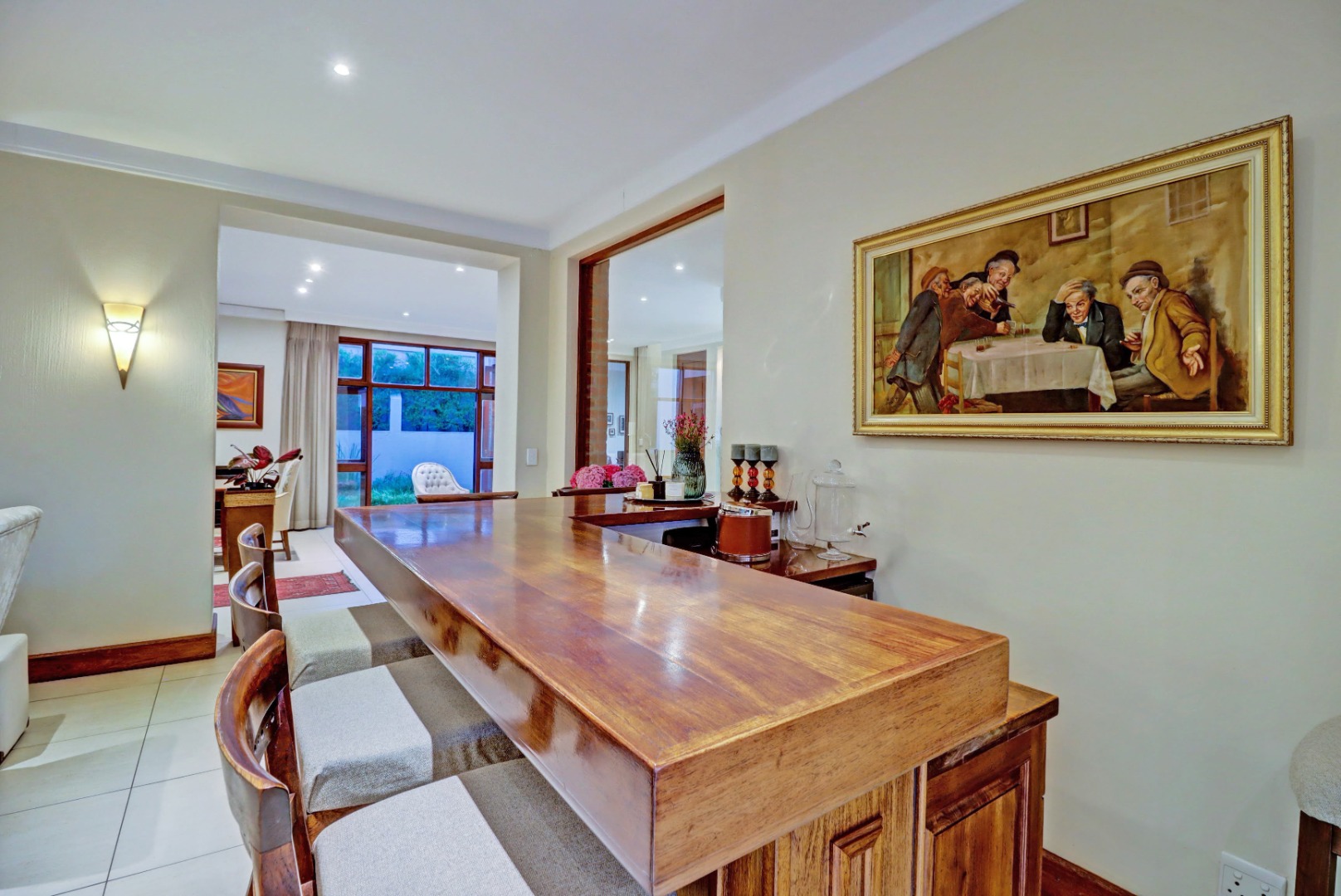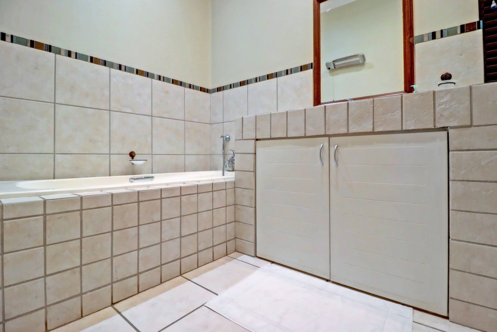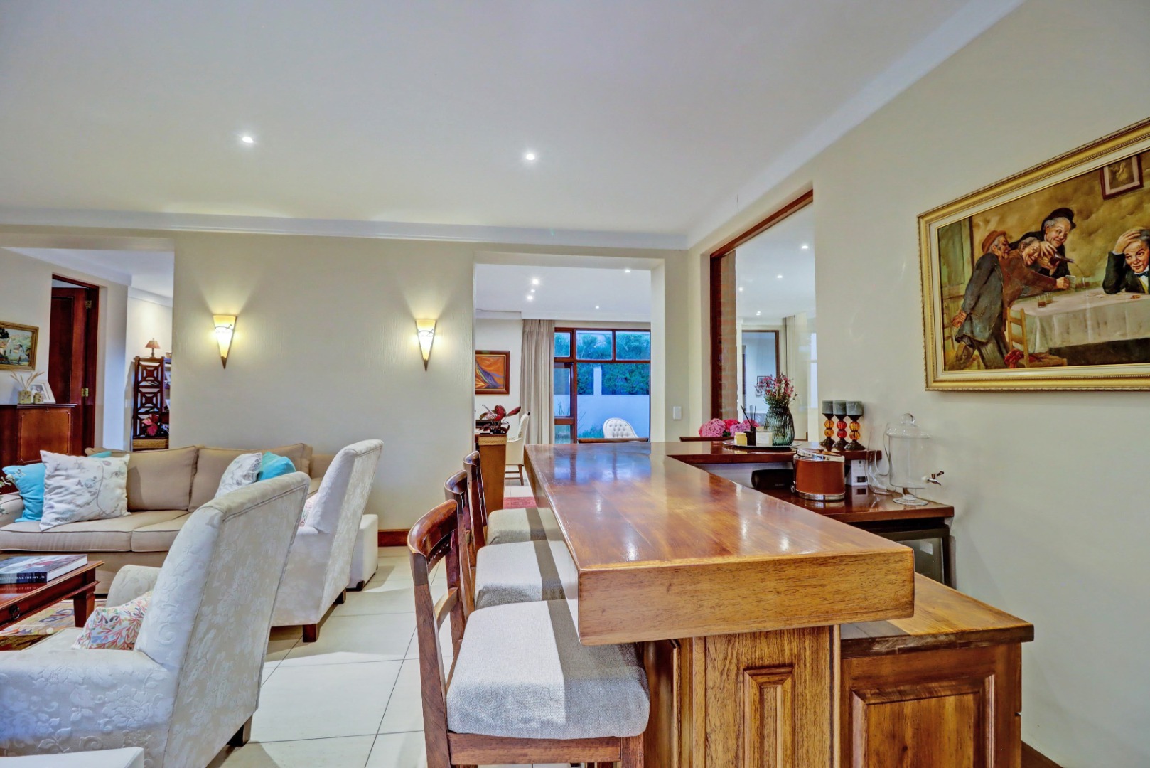 Outdoor living is a true highlight, featuring a private swimming pool, a welcoming patio, and a balcony for enjoying the serene surroundings. The established garden, complete with an irrigation system, provides a beautiful backdrop for outdoor activities. Entertain guests effortlessly with a built-in braai and a dedicated braai room, perfect for year-round enjoyment. Additional practical amenities include staff quarters, ample storage, a cosy fireplace, and a built-in bar.