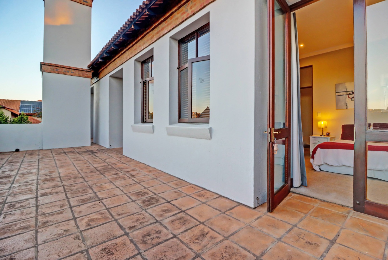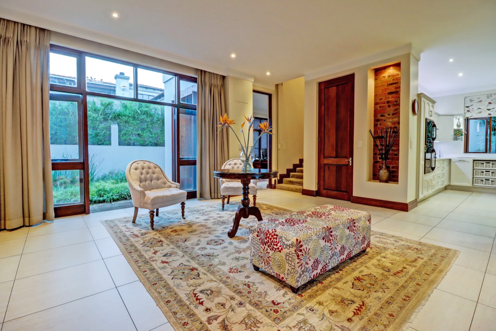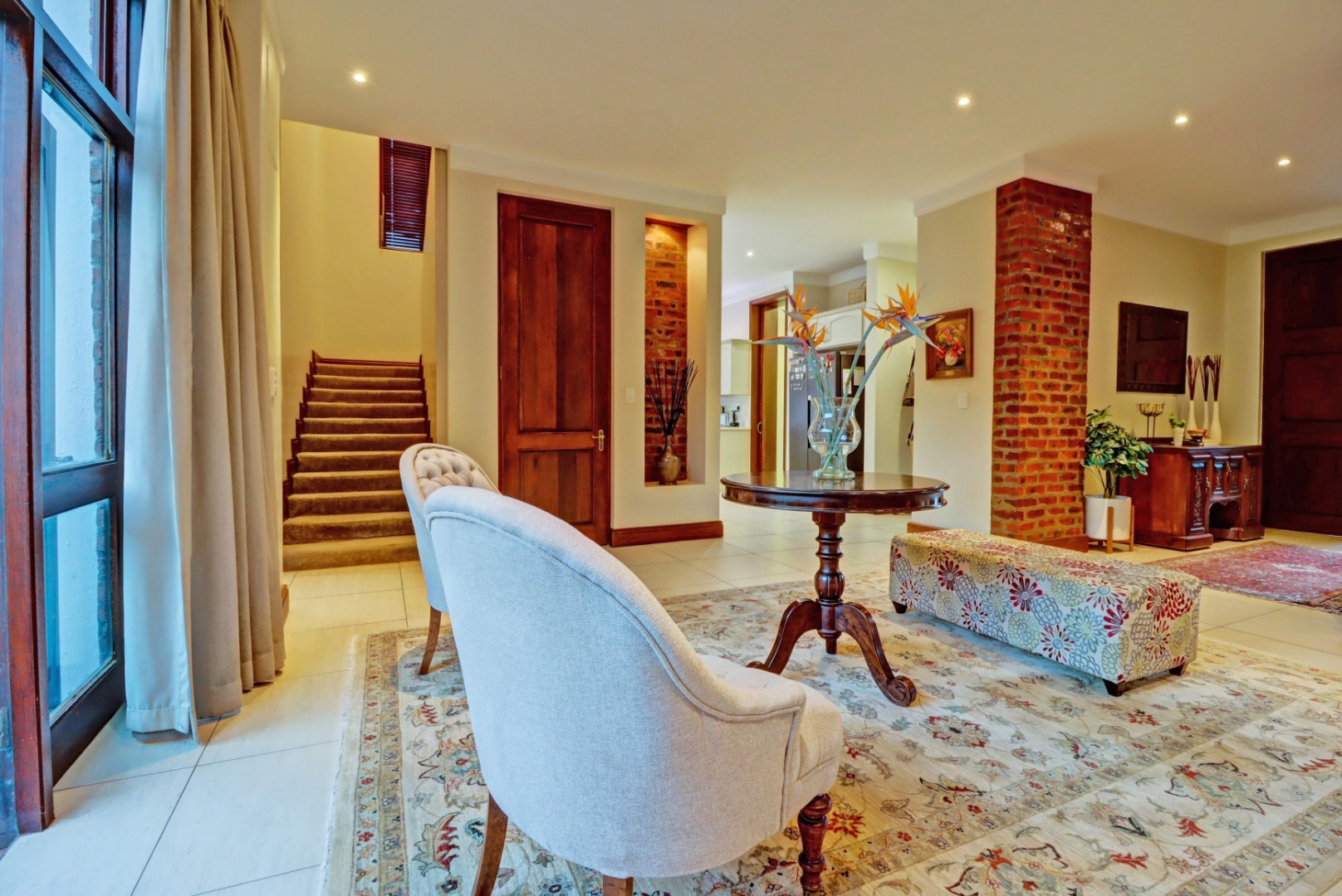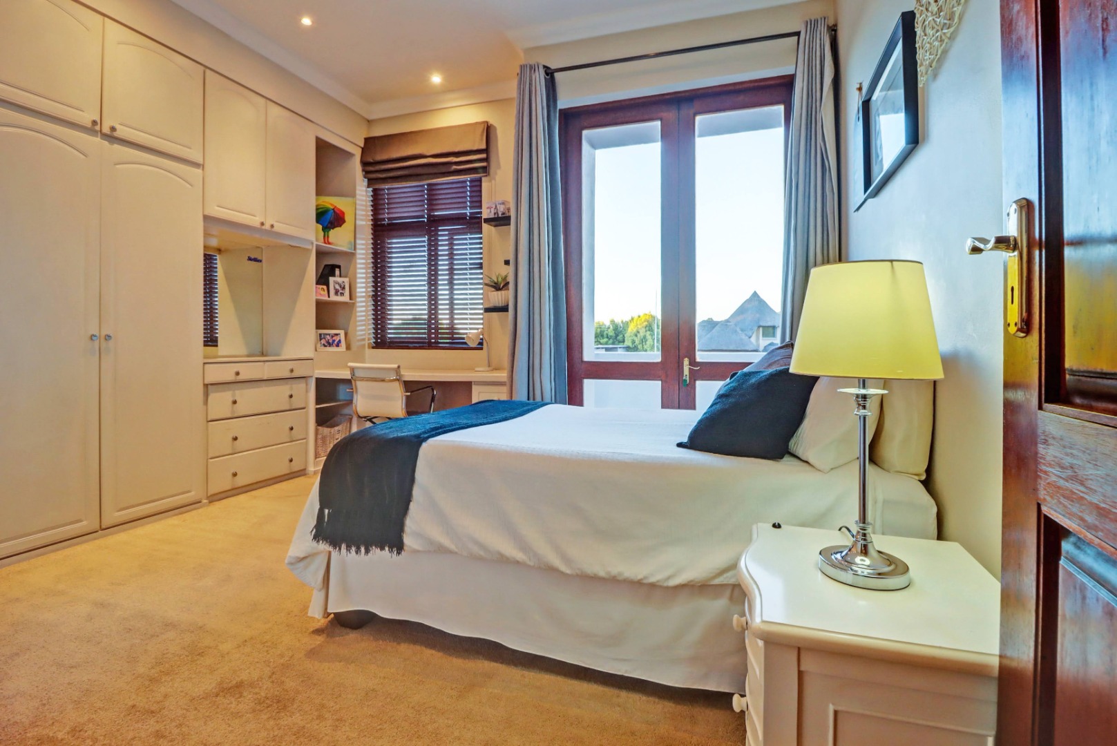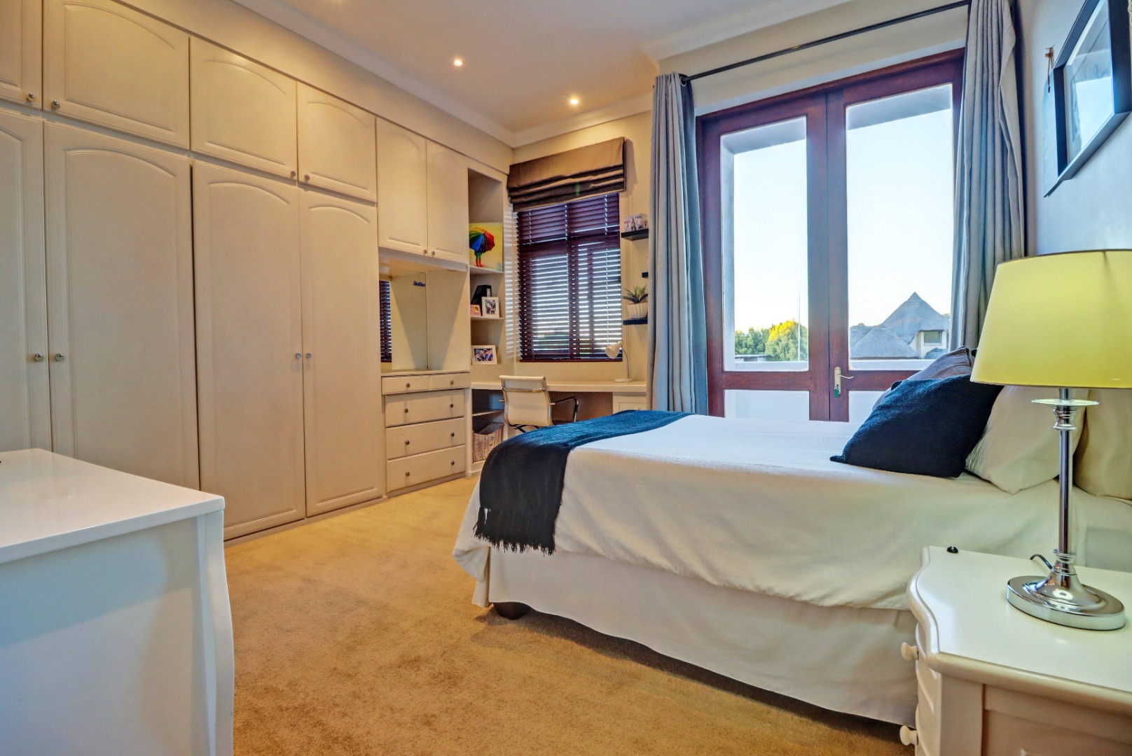Outdoor living is a true highlight, featuring a private swimming pool, a welcoming patio, and a balcony for enjoying the serene surroundings. The established garden, complete with an irrigation system, provides a beautiful backdrop for outdoor activities. Entertain guests effortlessly with a built-in braai and a dedicated braai room, perfect for year-round enjoyment. Additional practical amenities include staff quarters, ample storage, a cosy fireplace, and a built-in bar.