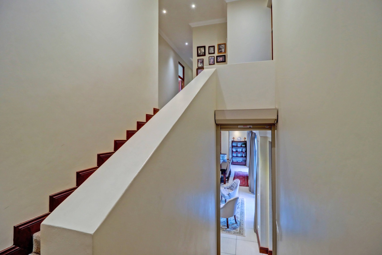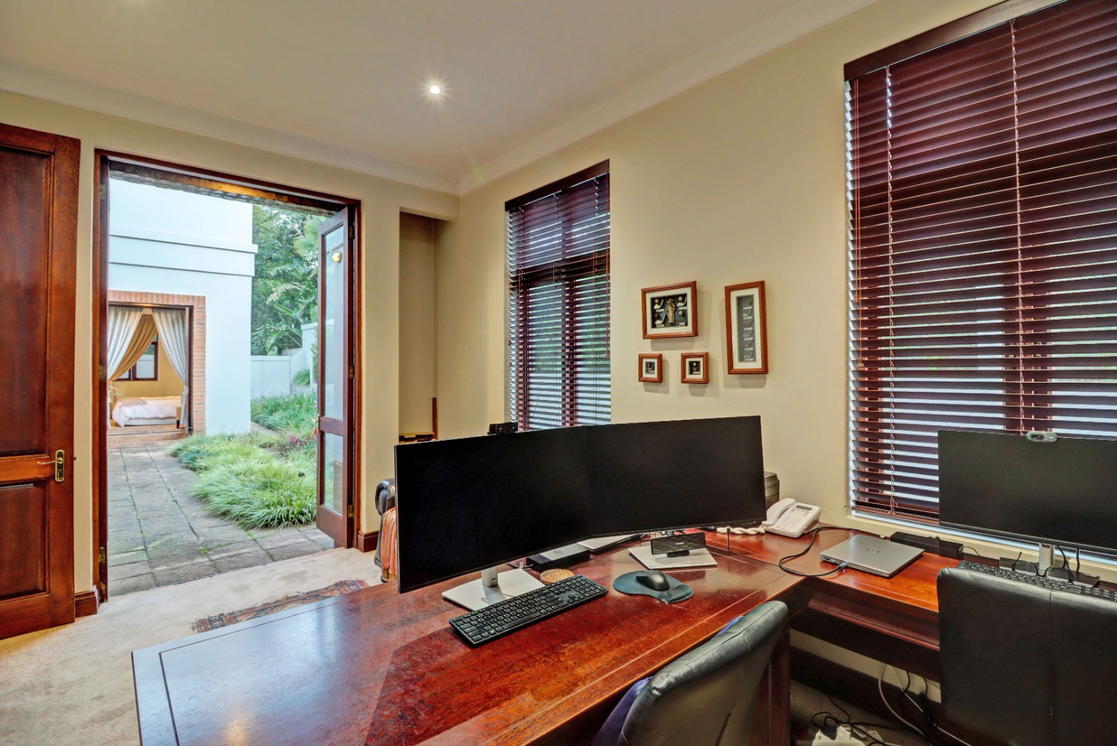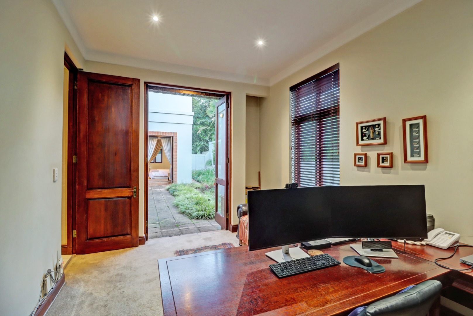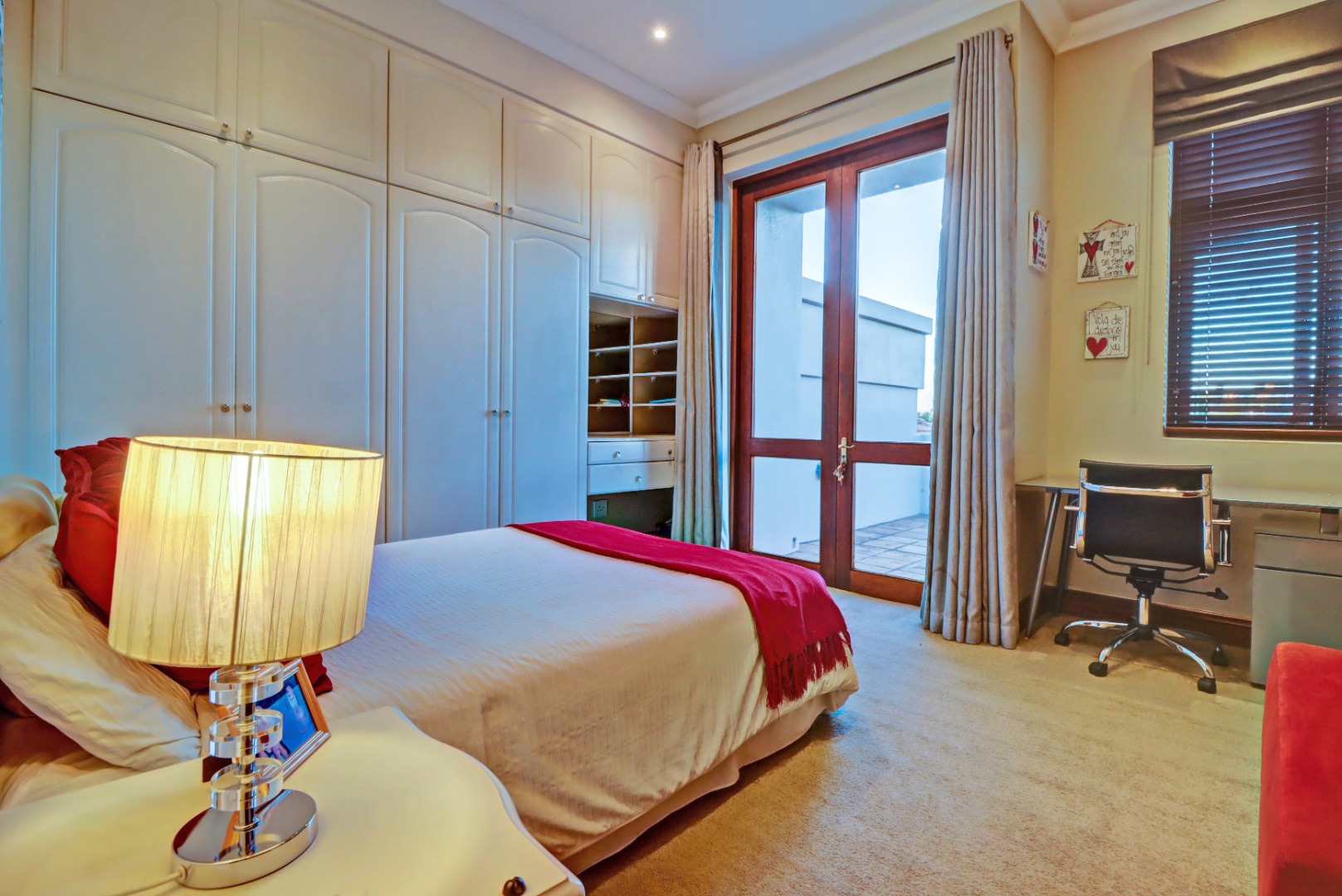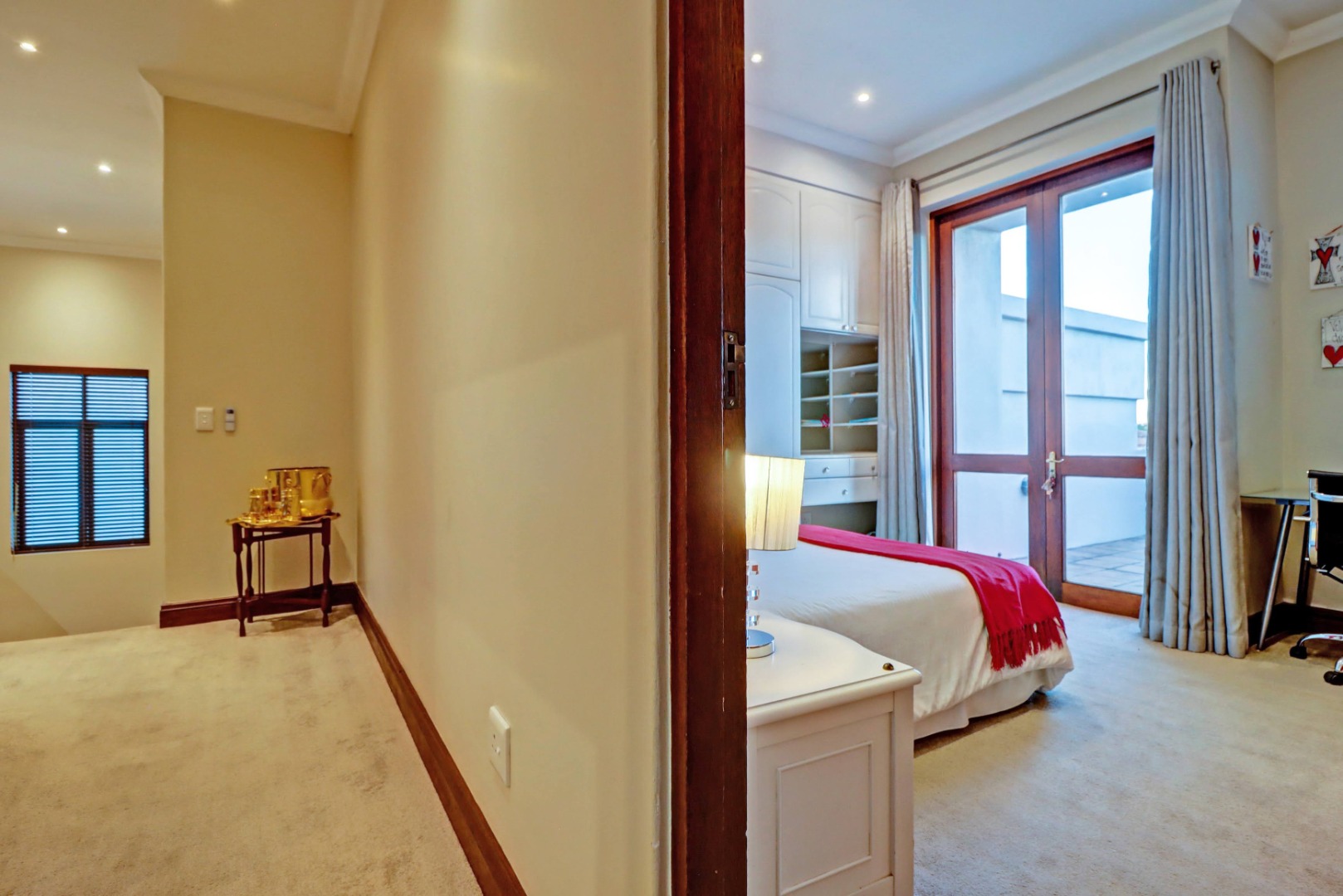 Outdoor living is a true highlight, featuring a private swimming pool, a welcoming patio, and a balcony for enjoying the serene surroundings. The established garden, complete with an irrigation system, provides a beautiful backdrop for outdoor activities. Entertain guests effortlessly with a built-in braai and a dedicated braai room, perfect for year-round enjoyment. Additional practical amenities include staff quarters, ample storage, a cosy fireplace, and a built-in bar.