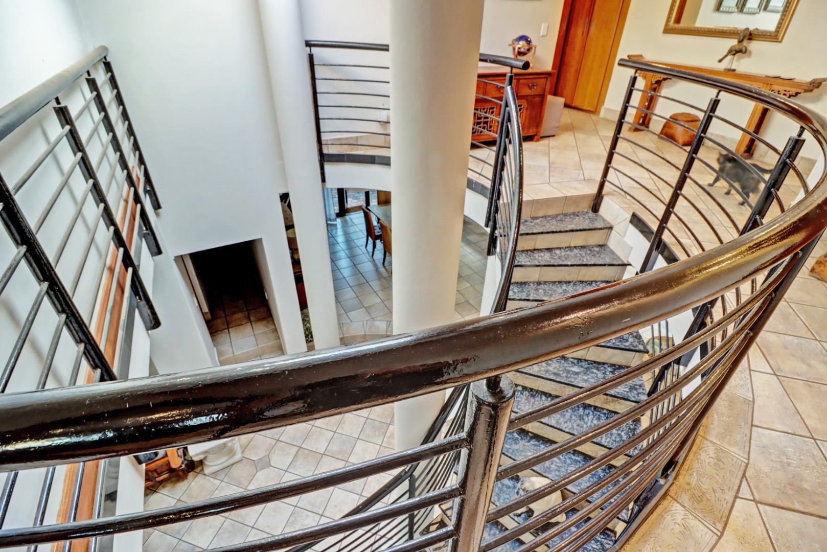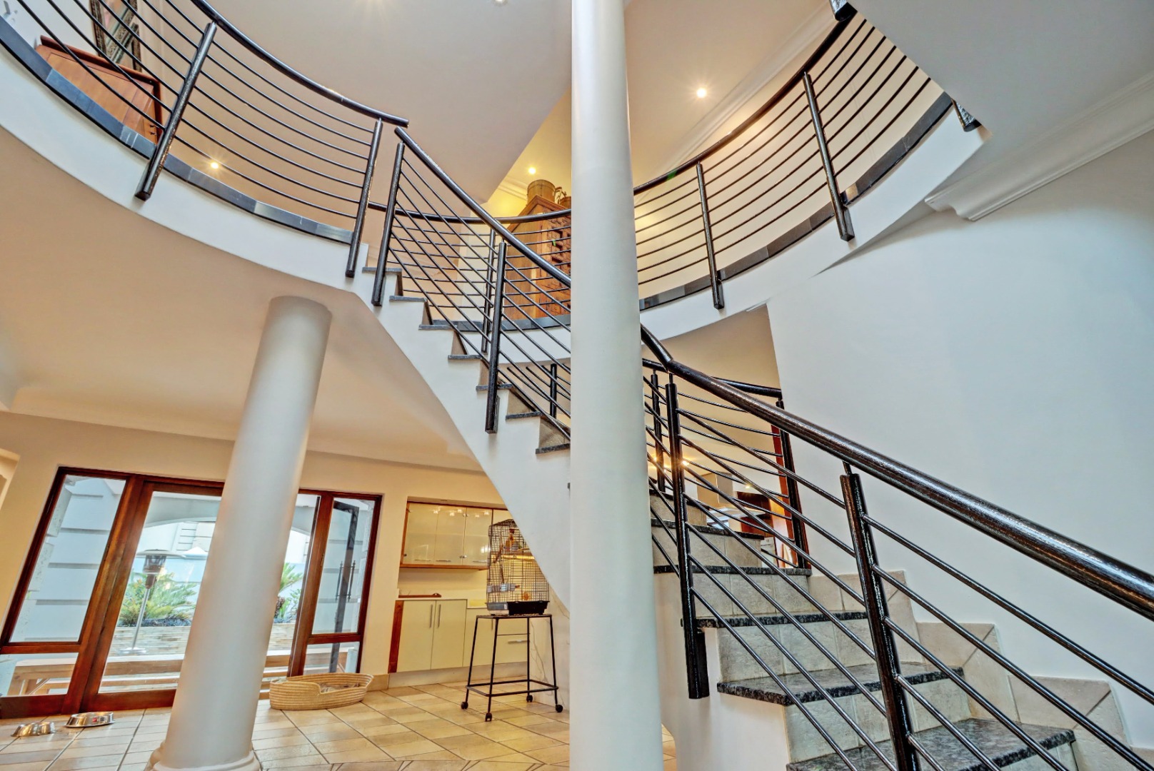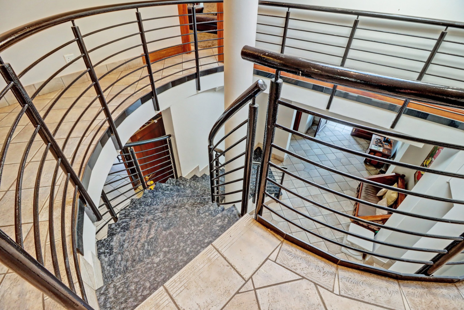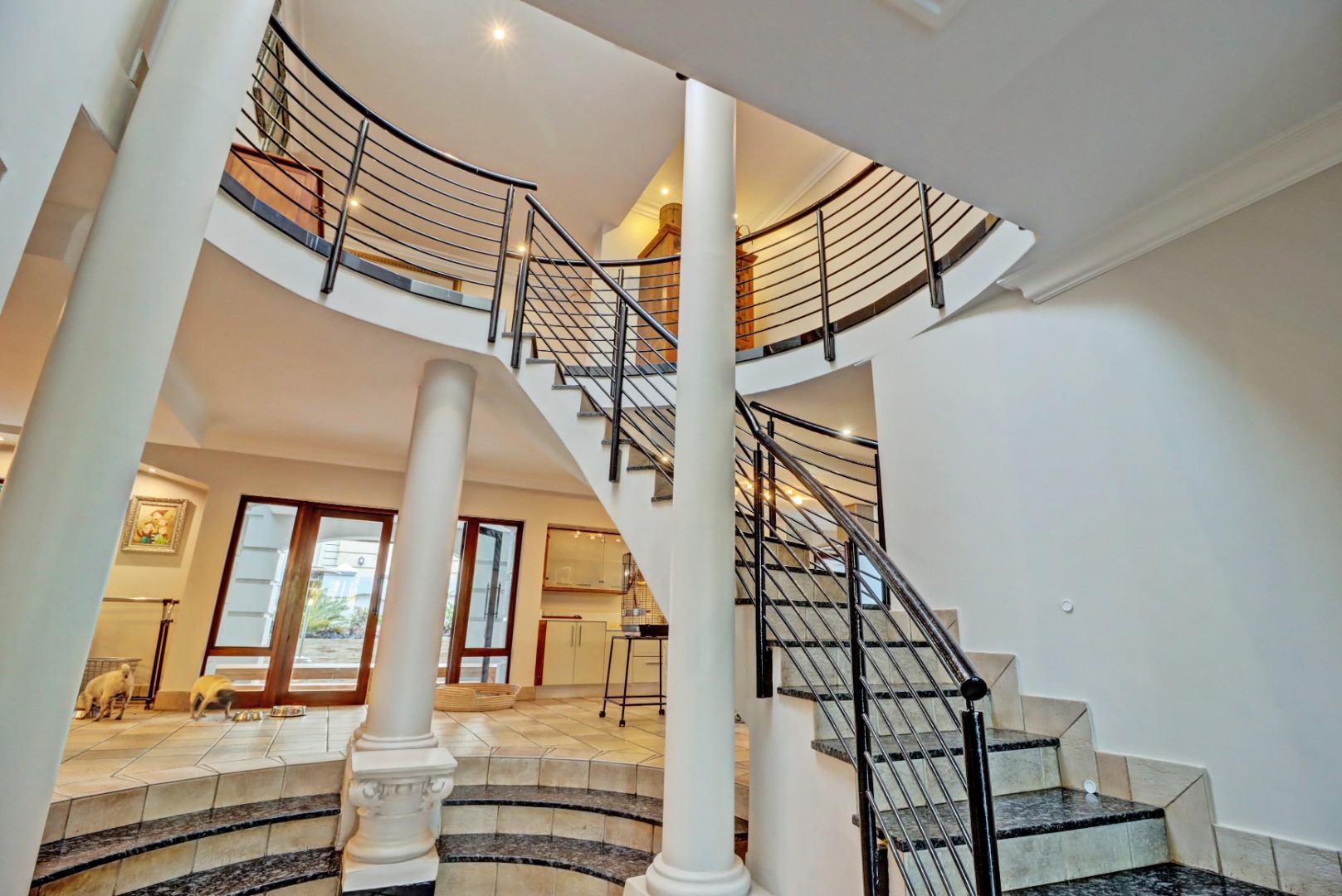 Step inside to a grand, multi-level foyer showcasing an impressive double-curved staircase with sleek black metal railings and elegant granite steps. The bright, open-plan ground floor, finished with consistent tiled flooring, is bathed in natural light from expansive glass doors. This home offers two comfortable lounges, a dedicated dining room, and a well-appointed kitchen with a pantry, ensuring seamless flow for daily living and entertaining.