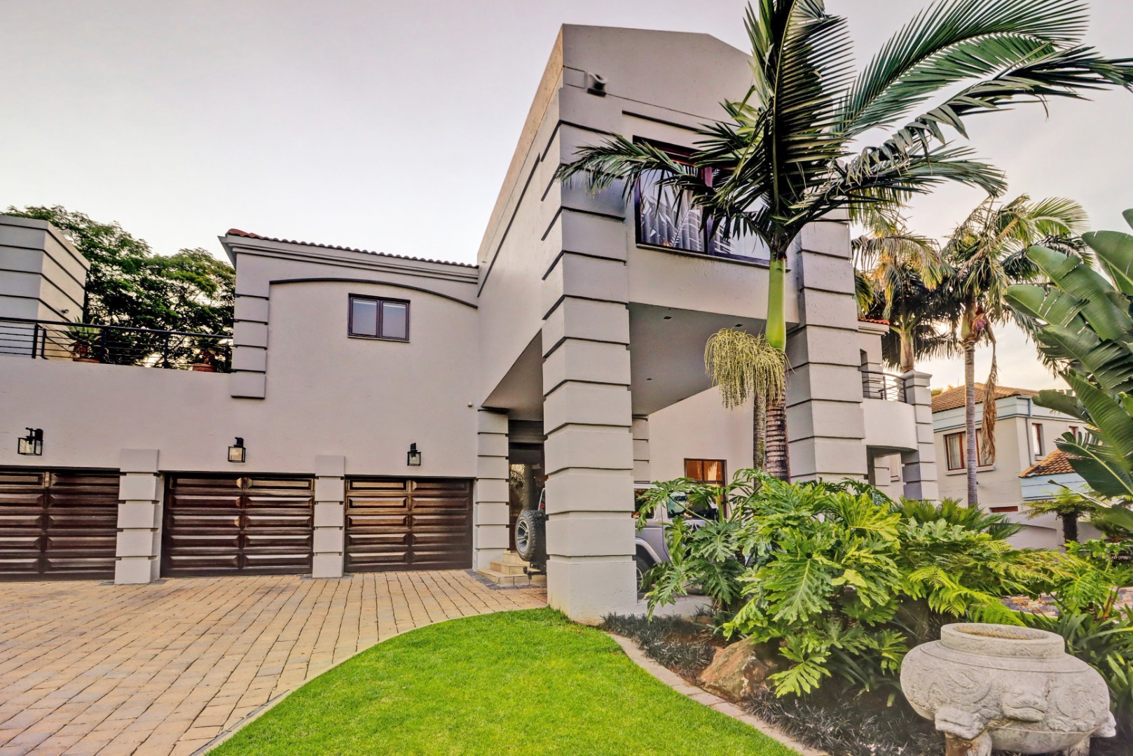 Nestled within the prestigious Woodhill Golf Estate in Pretoria, this contemporary multi-story residence presents an impressive facade. Its modern architectural design, featuring a light-colored exterior and distinctive columns, is complemented by lush tropical landscaping and mature palm trees. A spacious paved driveway leads to a triple garage, while a welcoming covered entrance and upper-level balconies enhance its sophisticated curb appeal.