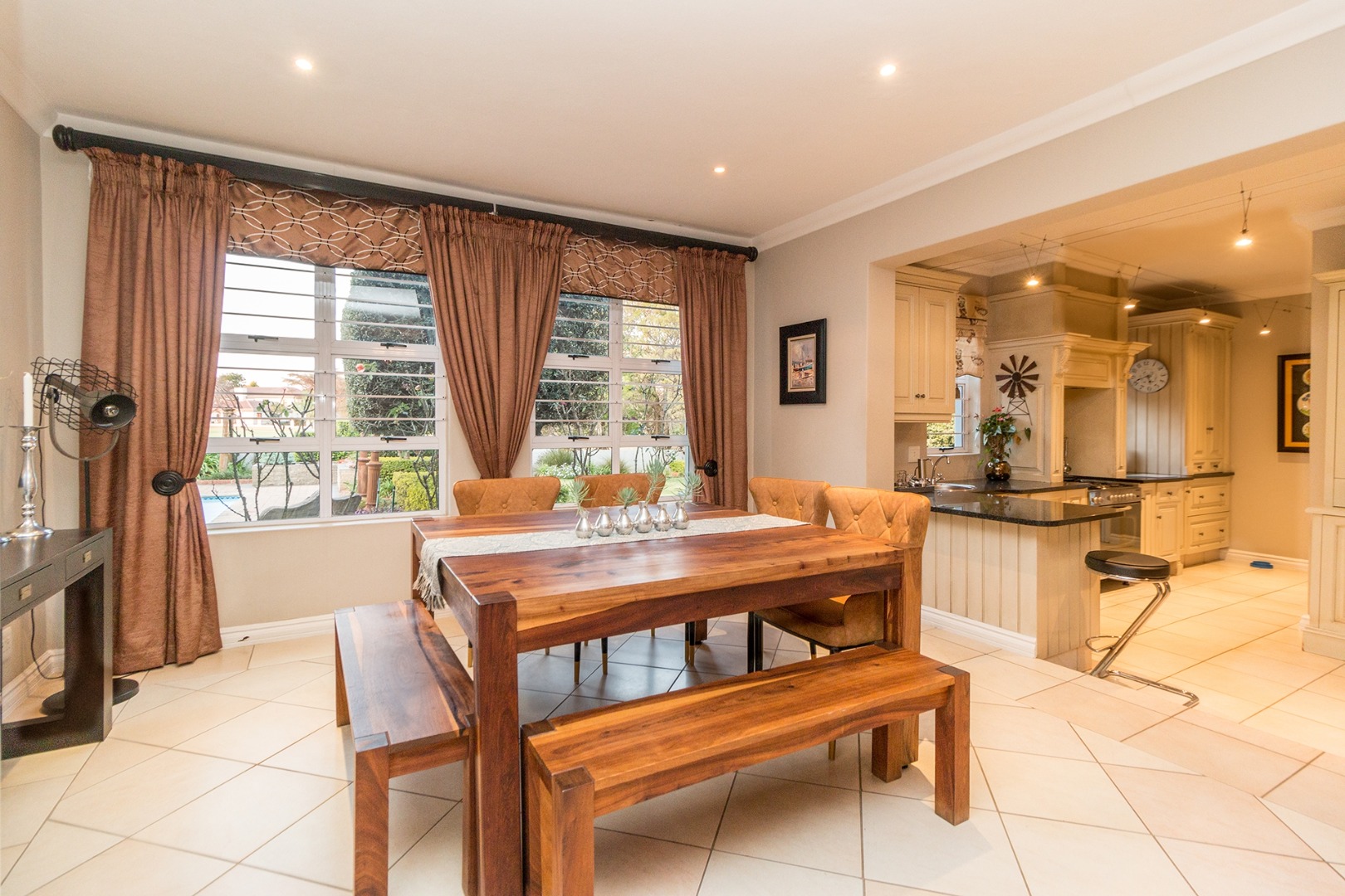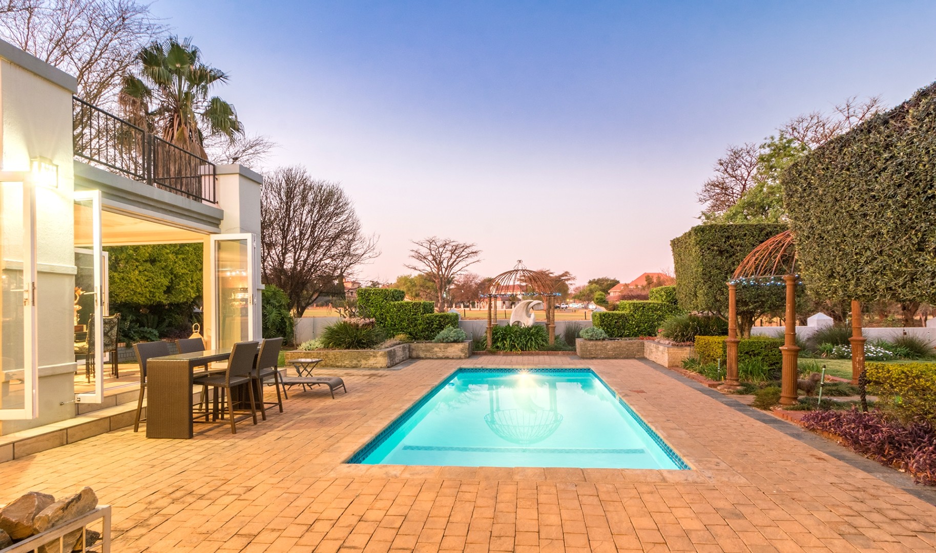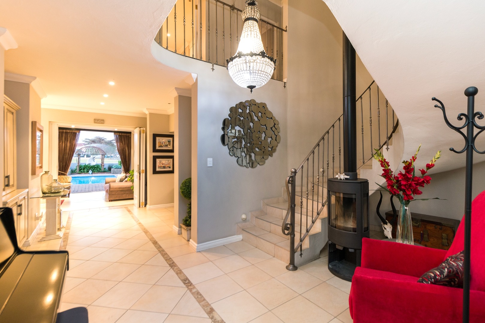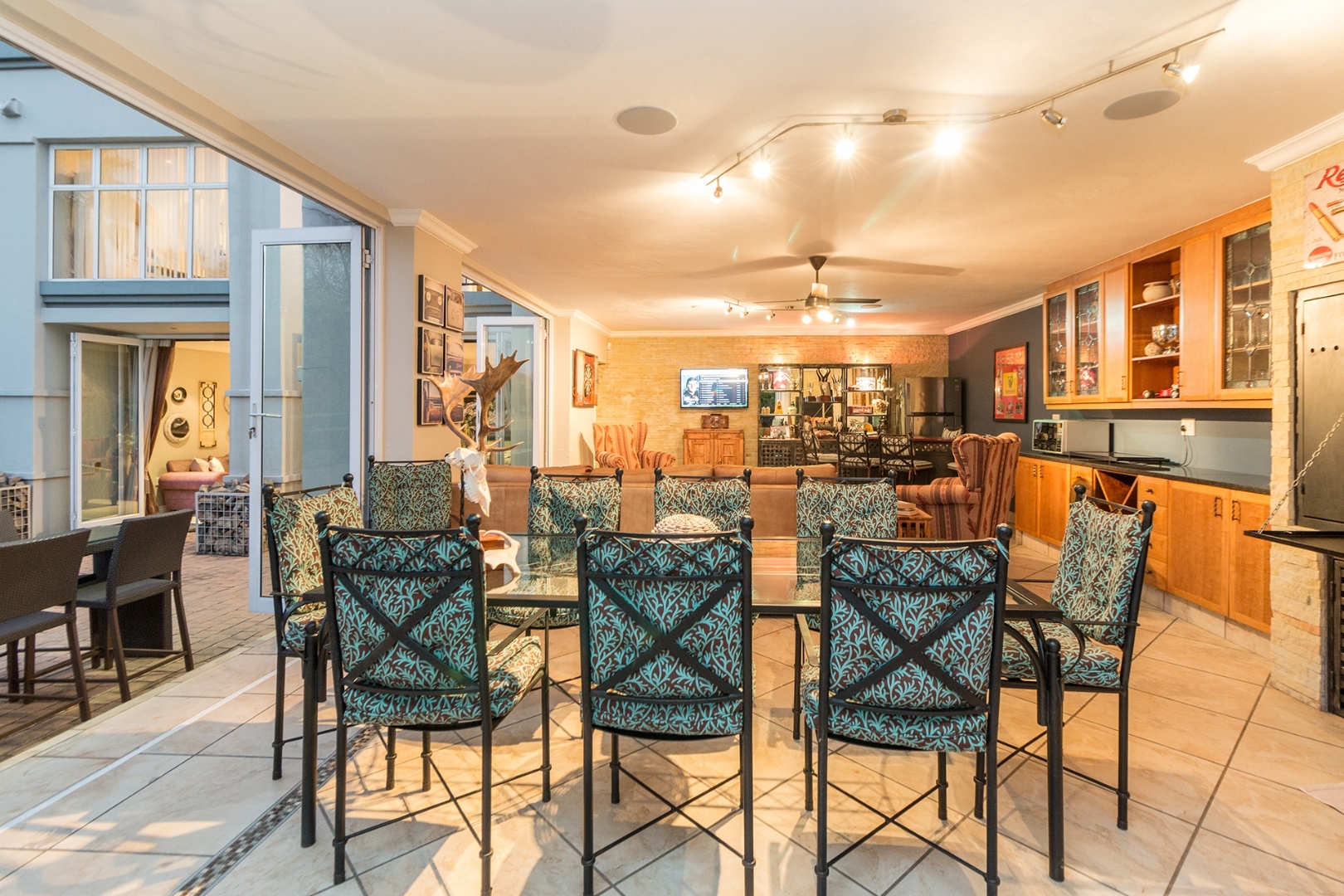 A grand entrance welcomes you to a light and inviting family home. Four living areas and a spacious entertainment area, all open onto a porch and/or the pool & manicured garden, to enjoy the areas to the fullest. The 65sqm entertainment area offers a large braai with rotisserie, a second gas braai, build-in sound system & cupboards, TV & DSTV connection, prep bowl and under floor heating. Open flowing family-, dining room, private porch and French kitchen with a large walk-in pantry and separate scullery.