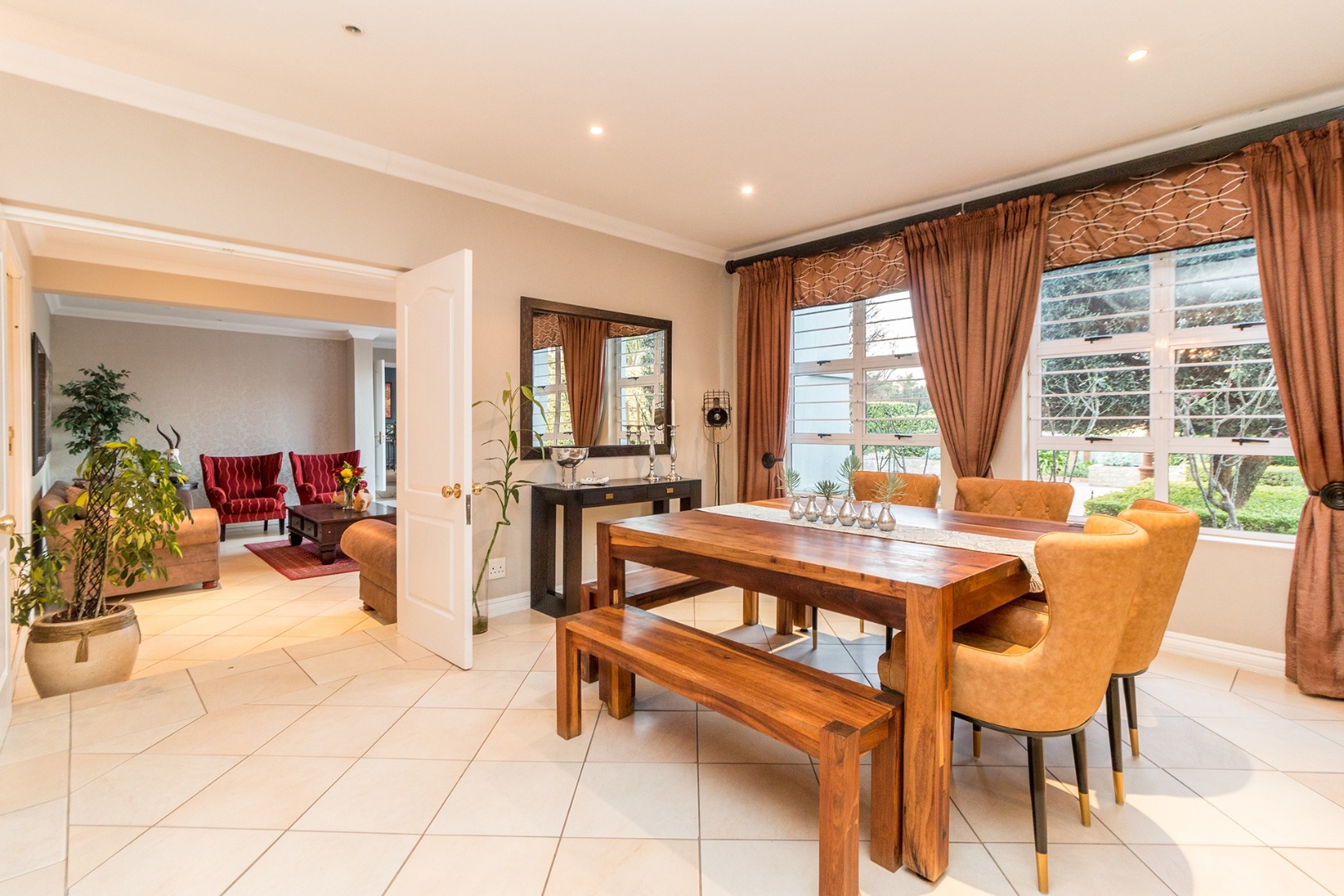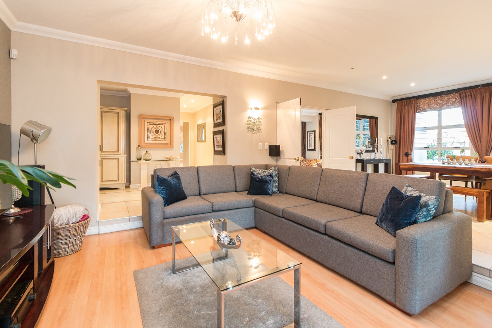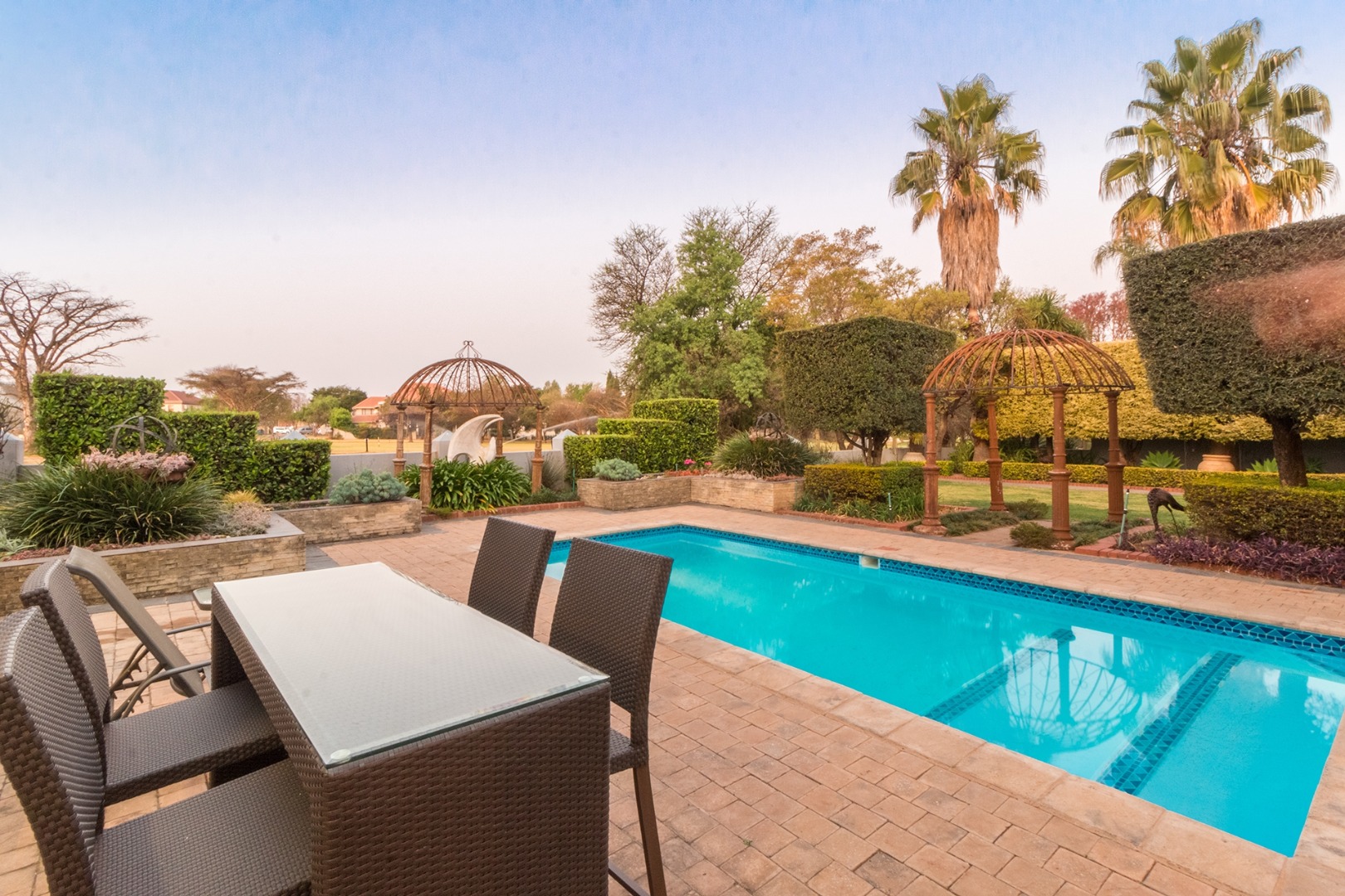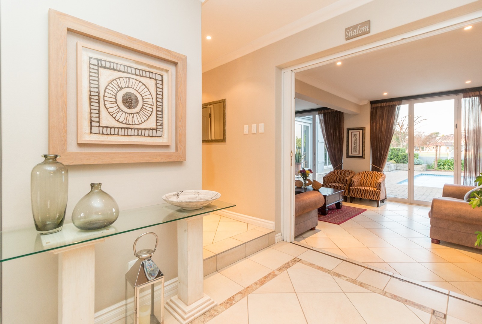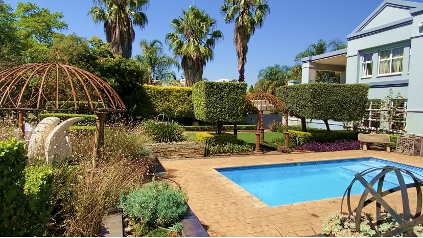 A grand entrance welcomes you to a light and inviting family home. Four living areas and a spacious entertainment area, all open onto a porch and/or the pool & manicured garden, to enjoy the areas to the fullest. The 65sqm entertainment area offers a large braai with rotisserie, a second gas braai, build-in sound system & cupboards, TV & DSTV connection, prep bowl and under floor heating. Open flowing family-, dining room, private porch and French kitchen with a large walk-in pantry and separate scullery.