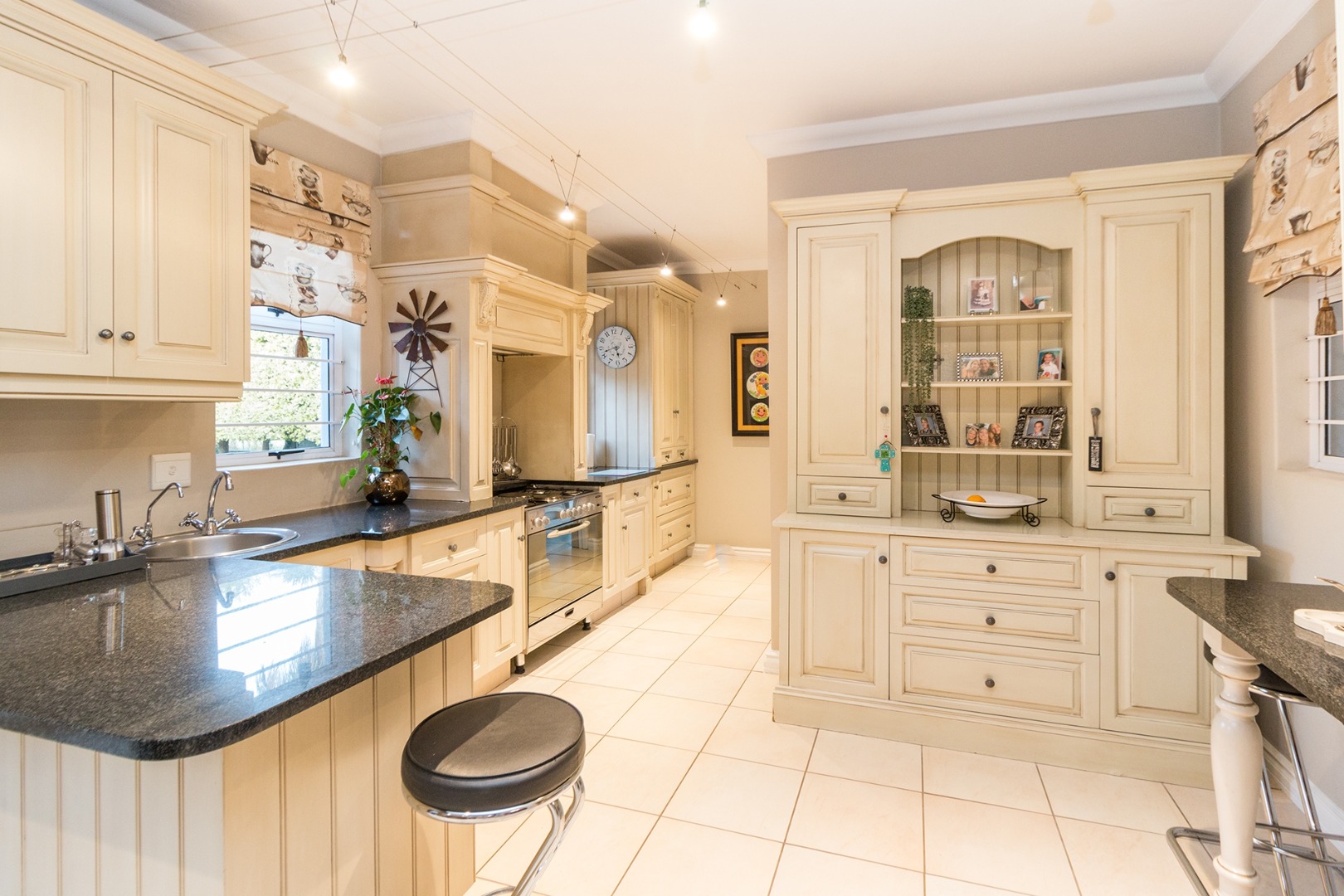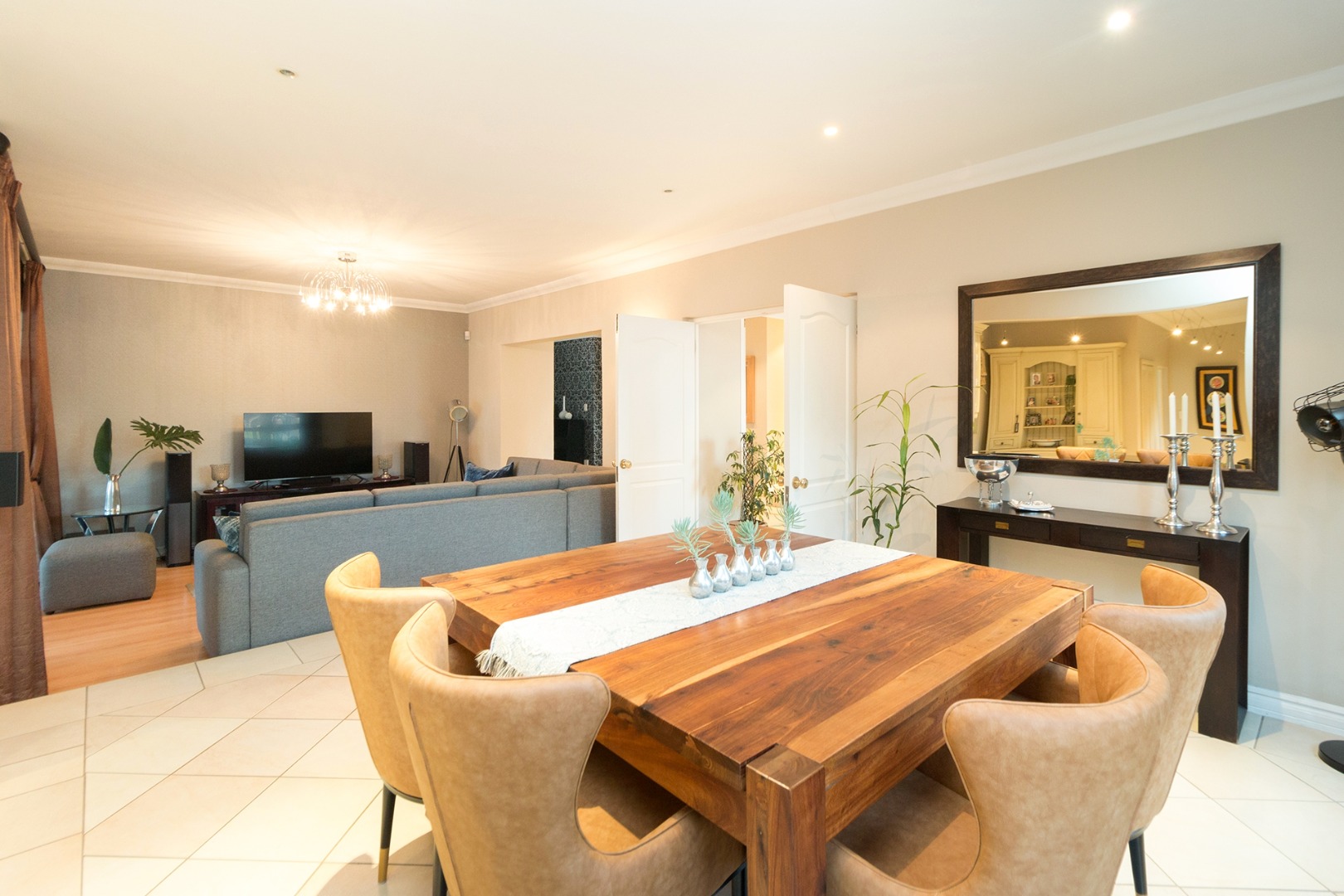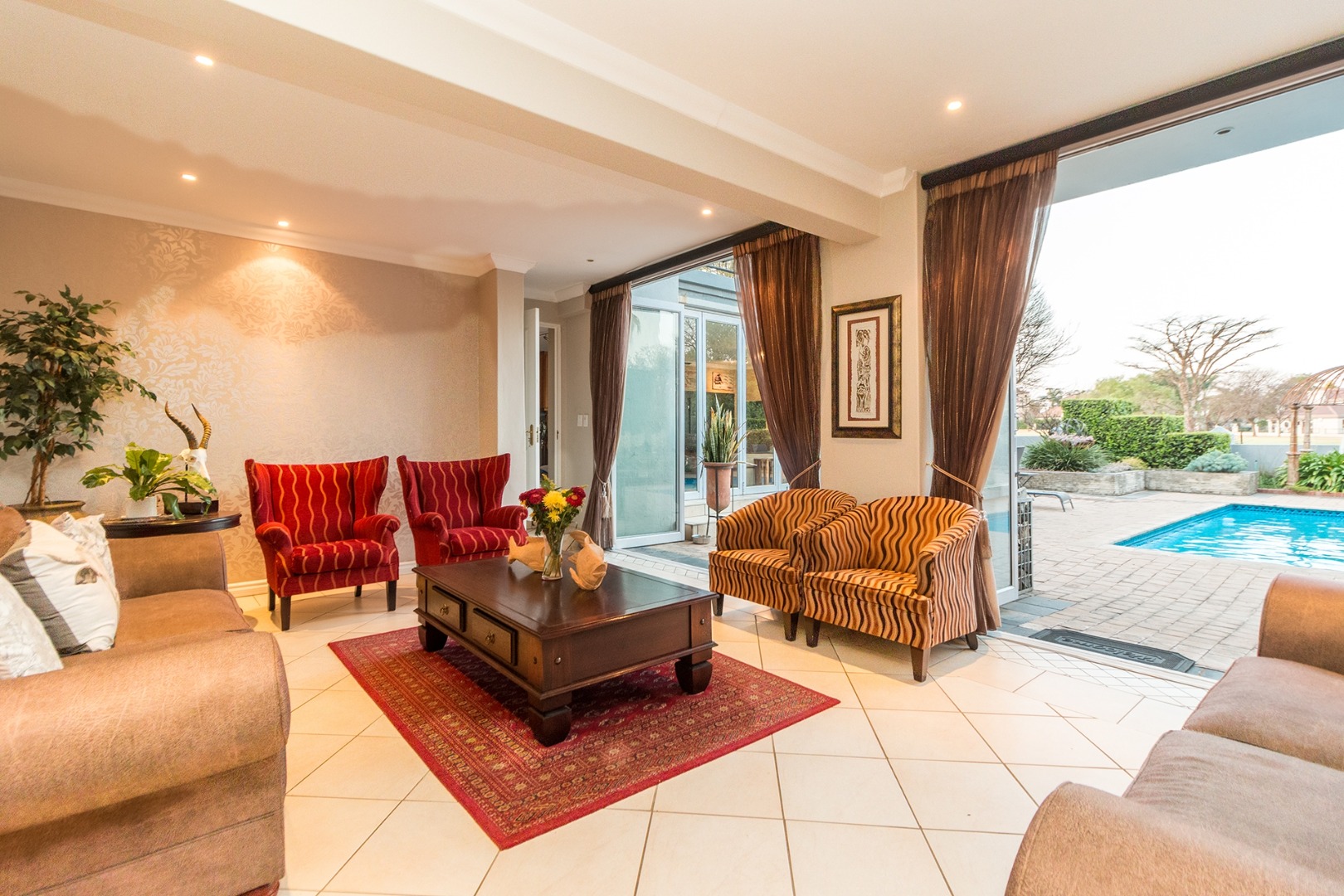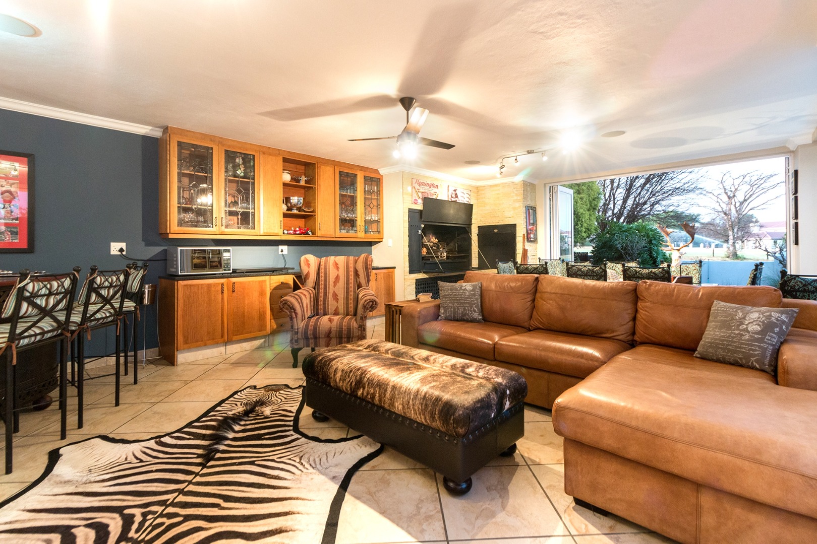 A grand entrance welcomes you to a light and inviting family home. Four living areas and a spacious entertainment area, all open onto a porch and/or the pool & manicured garden, to enjoy the areas to the fullest. The 65sqm entertainment area offers a large braai with rotisserie, a second gas braai, build-in sound system & cupboards, TV & DSTV connection, prep bowl and under floor heating. Open flowing family-, dining room, private porch and French kitchen with a large walk-in pantry and separate scullery.