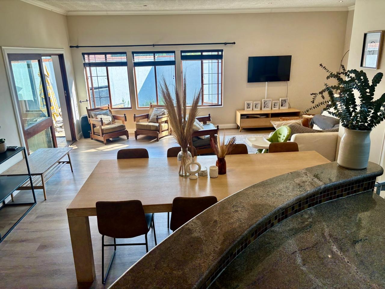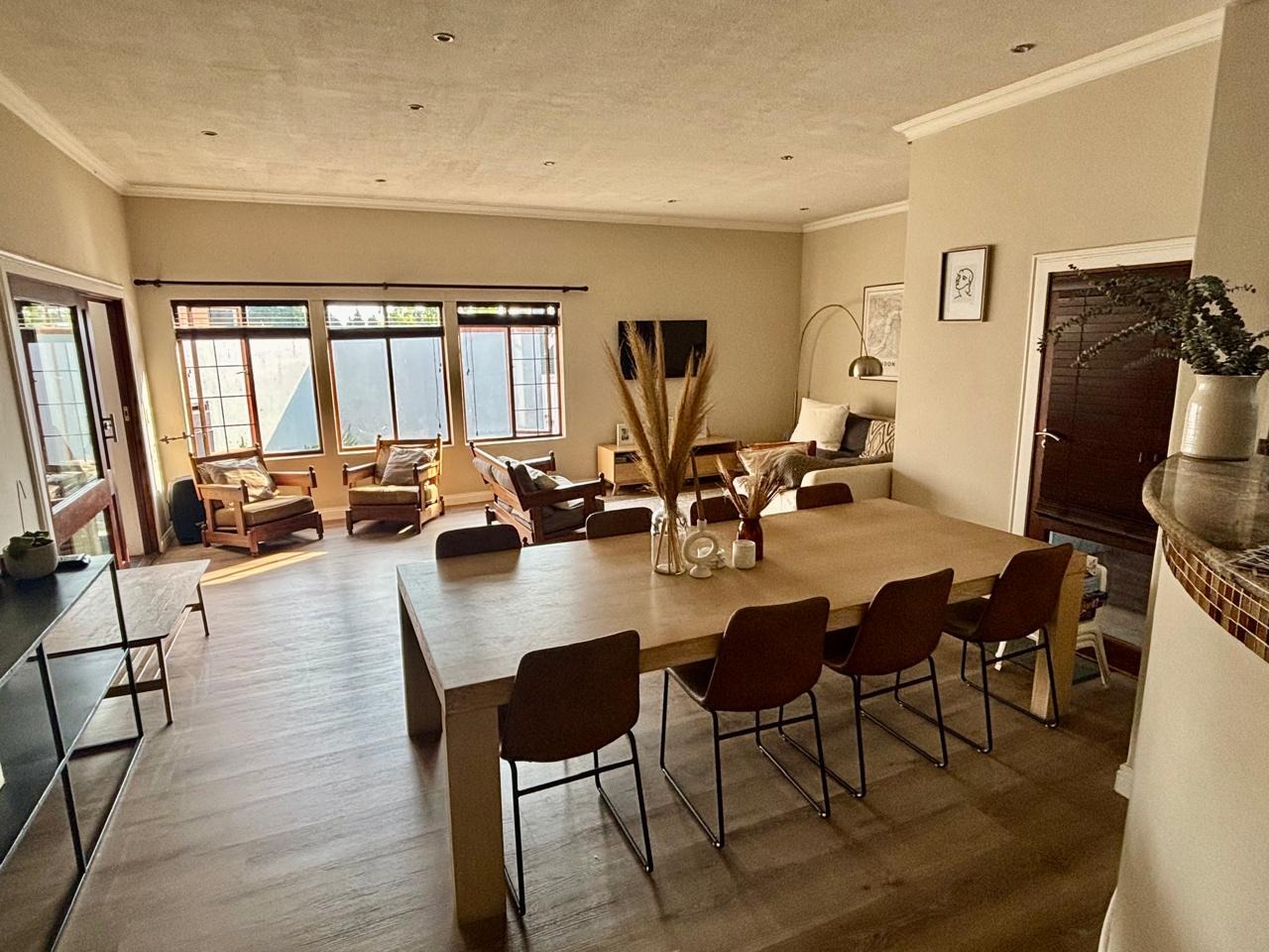 Step inside to an inviting open-plan layout, featuring two spacious lounges, one perfectly suited as a family TV room, and a dedicated dining area. A charming fireplace in an adjacent living area adds warmth and ambiance, while sliding doors seamlessly connect the interior to the outdoor living. A well-appointed kitchen with practical amenities such as a laundry and scullery and additional storage, enhance daily living, catering to all household needs.
