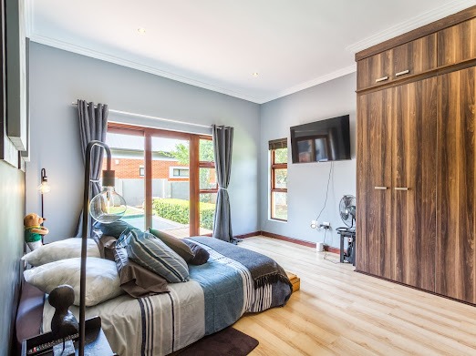 Outside, the lifestyle features continue with a large patio, perfect for outdoor dining, complemented by a built-in braai and crystal clear swimming pool to enjoy sunny days by, set within a well-maintained garden featuring an Hunter irrigation system.