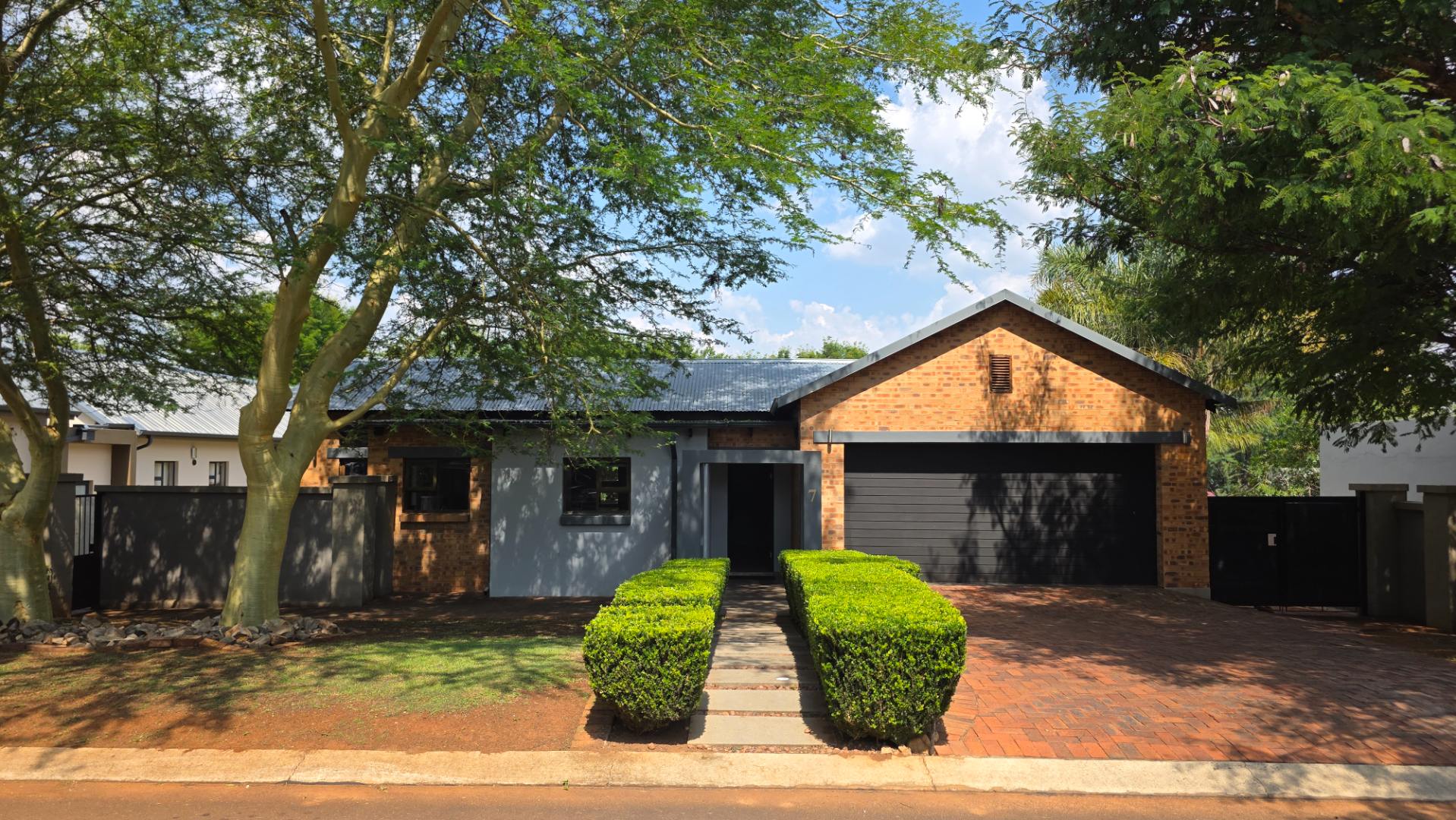 Discover modern living in this attractive 3-bedroom home situated within the highly sought-after Midlands Estate in Centurion, South Africa. The property immediately impresses with its appealing kerb appeal, featuring a blend of brick and contemporary painted finishes, a modern dark garage door, and a paved brick driveway. Well-maintained hedges and mature trees enhance the welcoming frontage, leading to an inviting entrance hall.