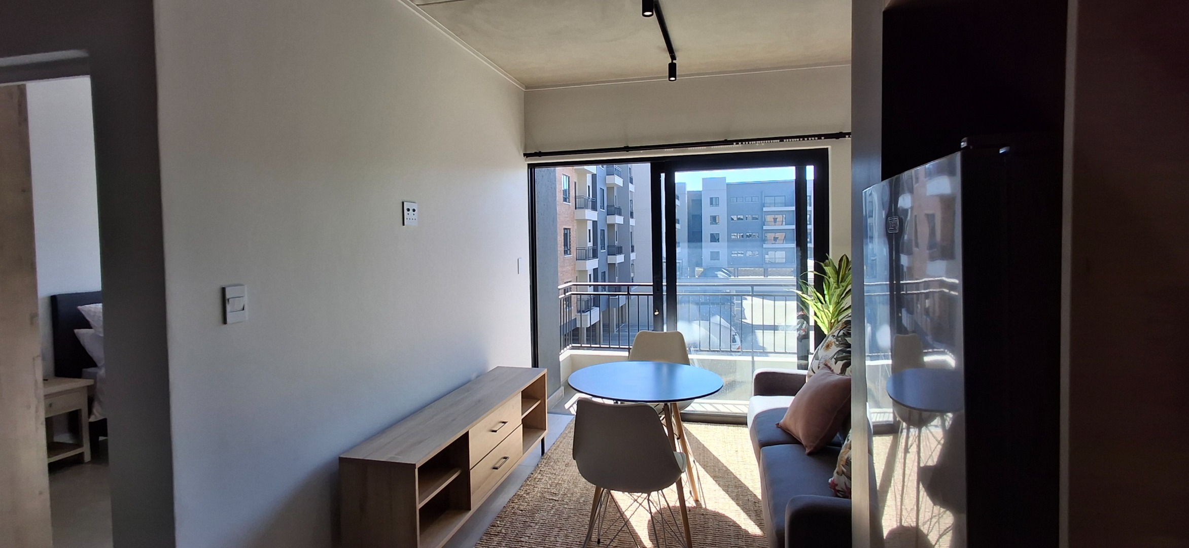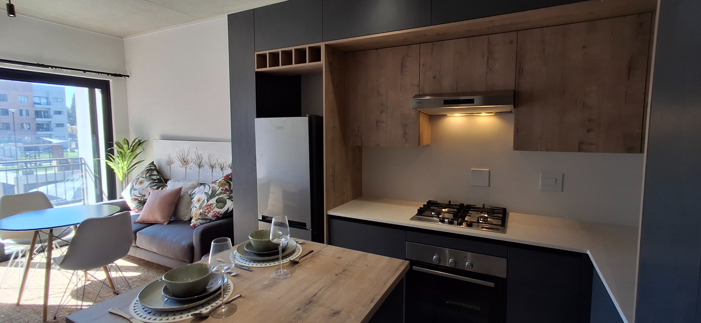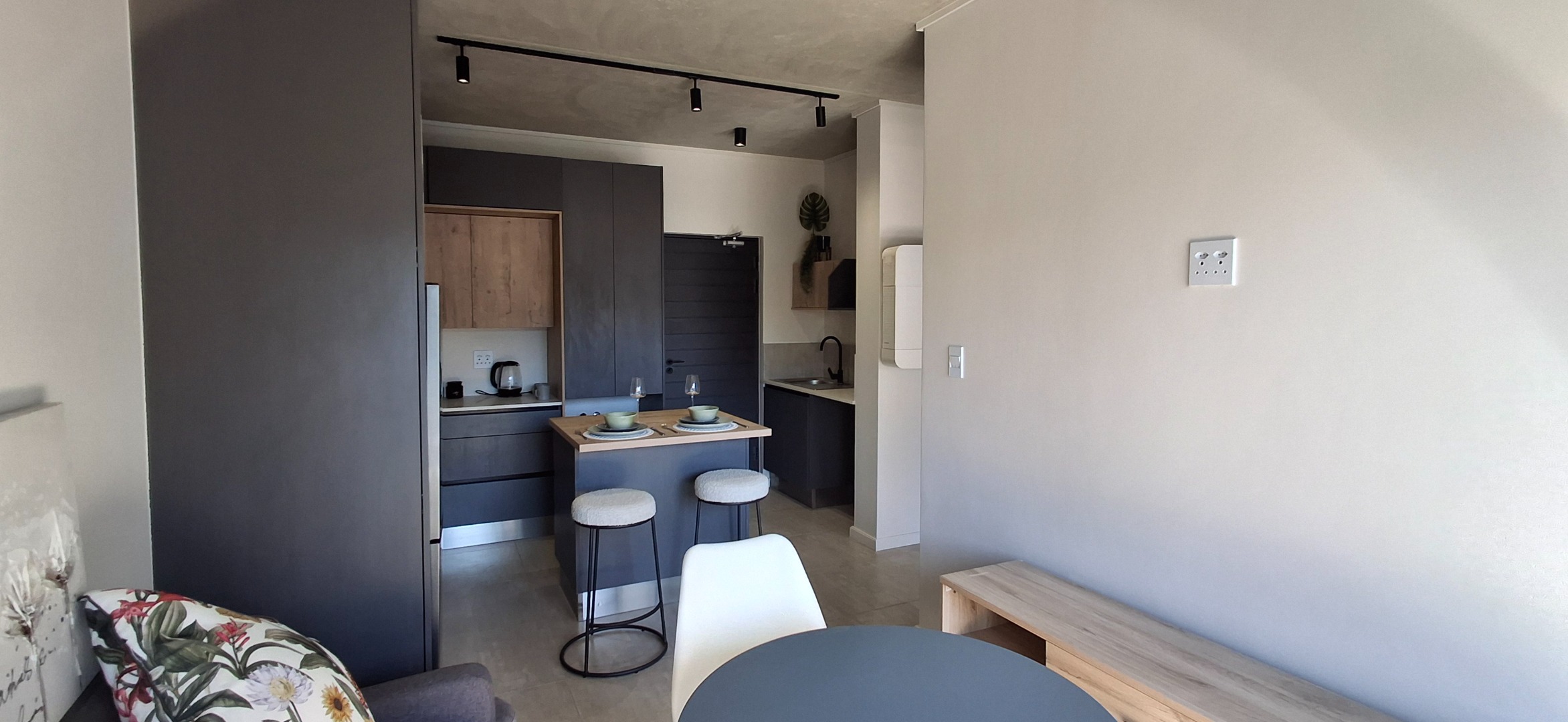 Discover an exquisite urban sanctuary in the heart of Brooklyn, Pretoria, where sophisticated design meets unparalleled convenience. This meticulously crafted 40 sqm apartment offers a singular bedroom and a luxurious bathroom, embodying modern elegance for the discerning individual or couple. The open-plan living area, bathed in natural light from expansive sliding doors, seamlessly integrates a state-of-the-art kitchen featuring sleek dark cabinetry, granite countertops and a gas hob and oven. An inviting breakfast bar provides a chic space for casual dining, while the exposed concrete ceiling with track lighting adds an industrial-chic touch. Step out onto your private balcony to enjoy the metropolitan ambiance, a perfect extension of your refined living space.