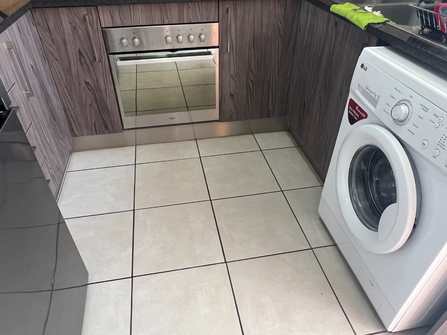 There is a modern well appointed kitchen with a fridge and washing machine.