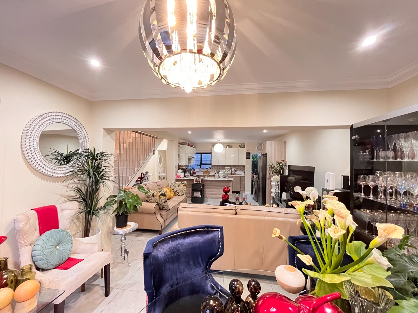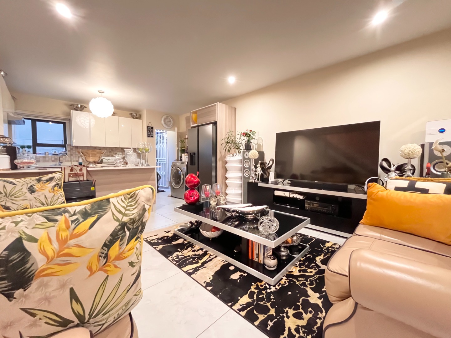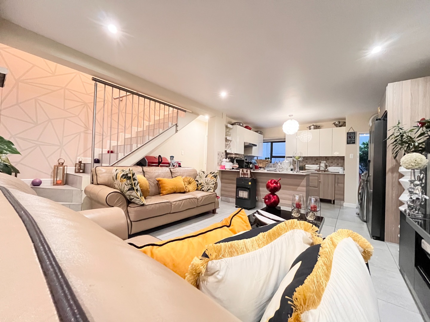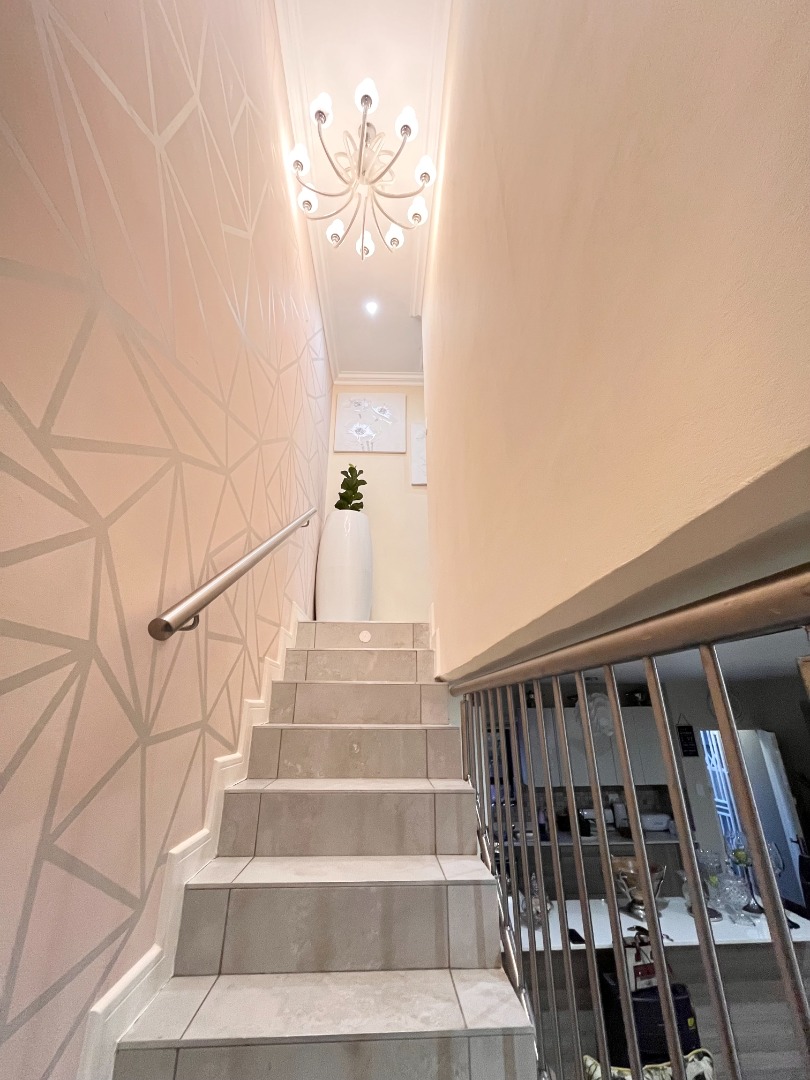 Discover modern living in this inviting 2-bedroom, 1.5-bathroom rental unit located in a secure complex in Equestria, Pretoria. Spanning 86 square metres, this property offers a contemporary open-plan layout, seamlessly connecting the lounge, dining area, and a stylish kitchen. The kitchen is a highlight, featuring modern two-tone cabinetry, ample storage including an oven and hob, and sleek tiled flooring. Special lighting throughout the living spaces enhances the sophisticated ambiance, complemented by a striking staircase that adds architectural interest.