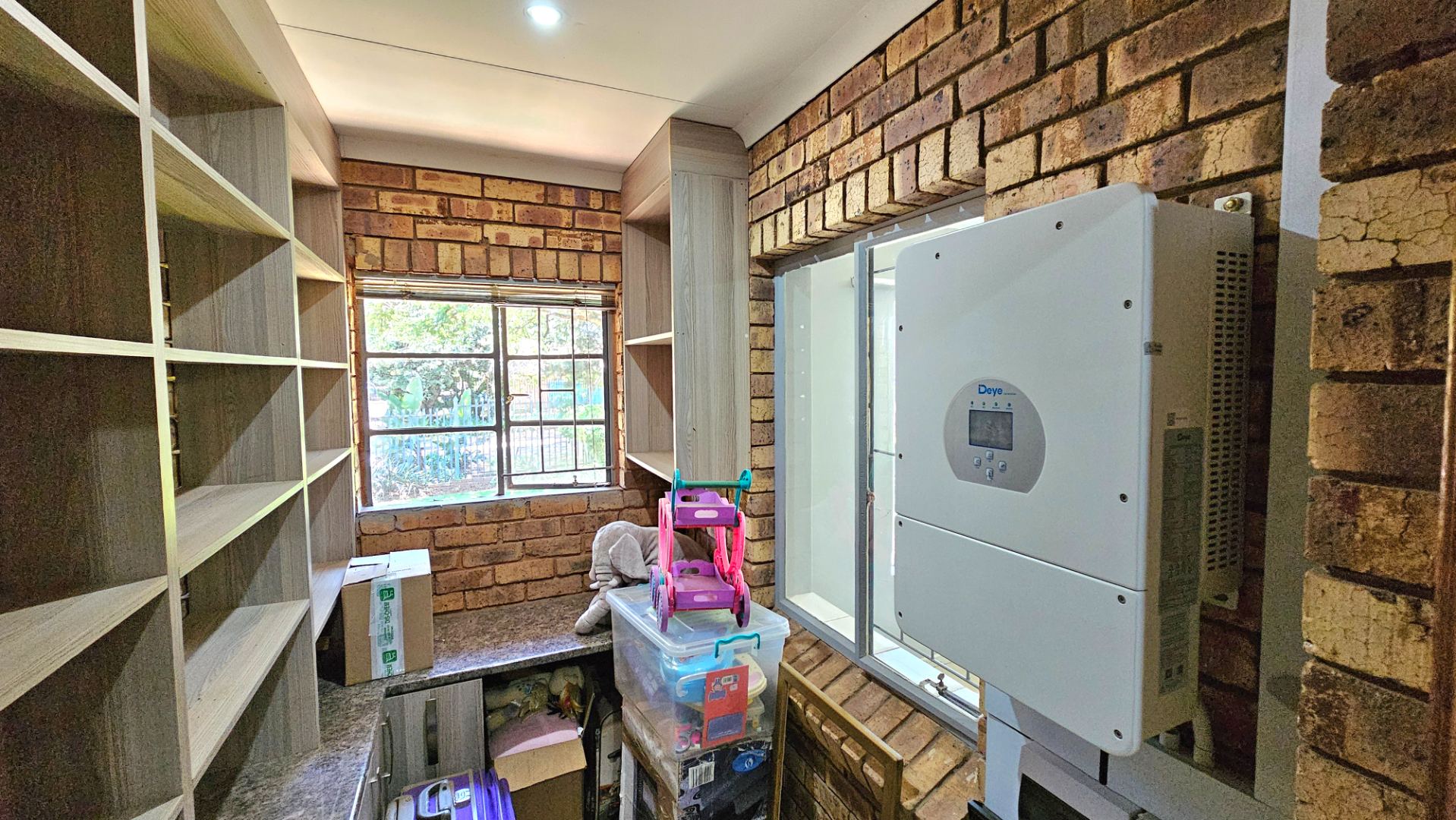 The former entrance of the house was converted in a storage room, with a work desk. It could be used as a very small study. The inverter and battery is also installed in this room.