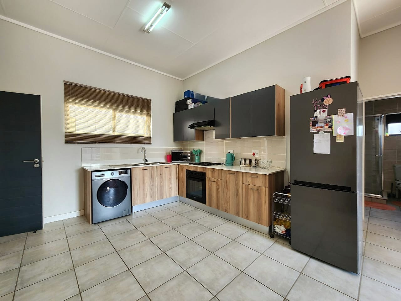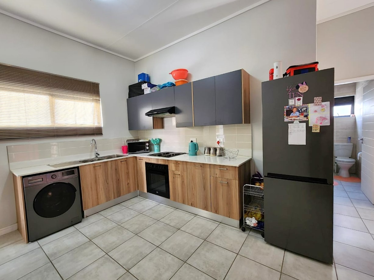 - Kitchen features stylish two-tone cabinetry, integrated oven & hob, and a washing machine