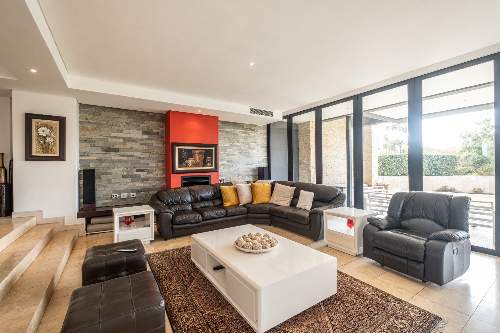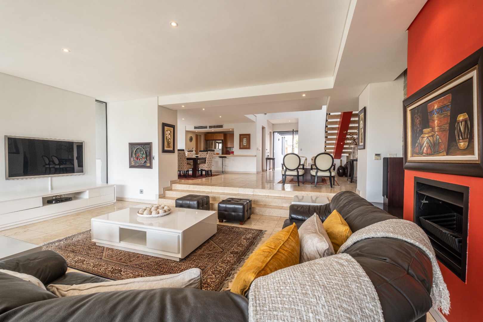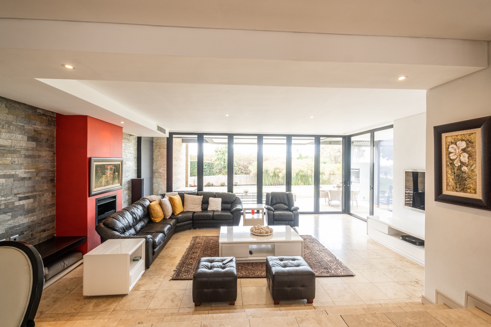 A sunken lounge with a leather lounge suites, a fire place, sound system and TV overlooks the patio, garden and water cannel to the bottom of the garden. With stacking doors that also completely open up, this space provides the perfect entertainment area.