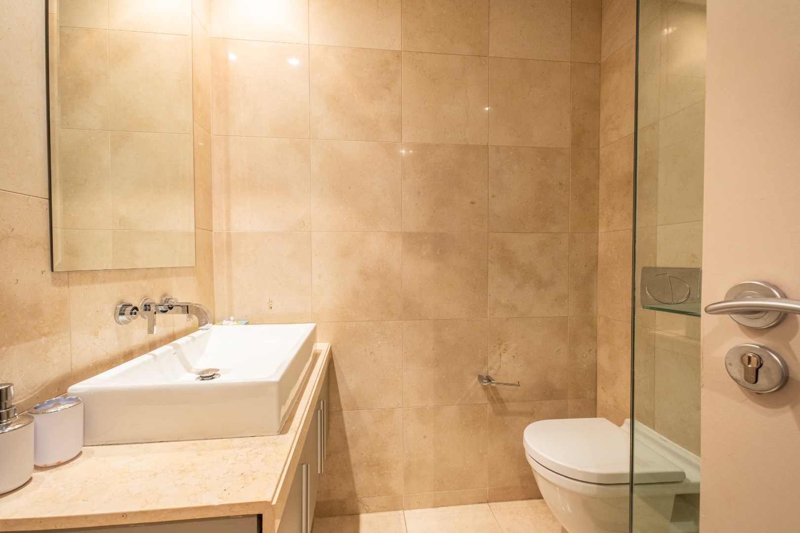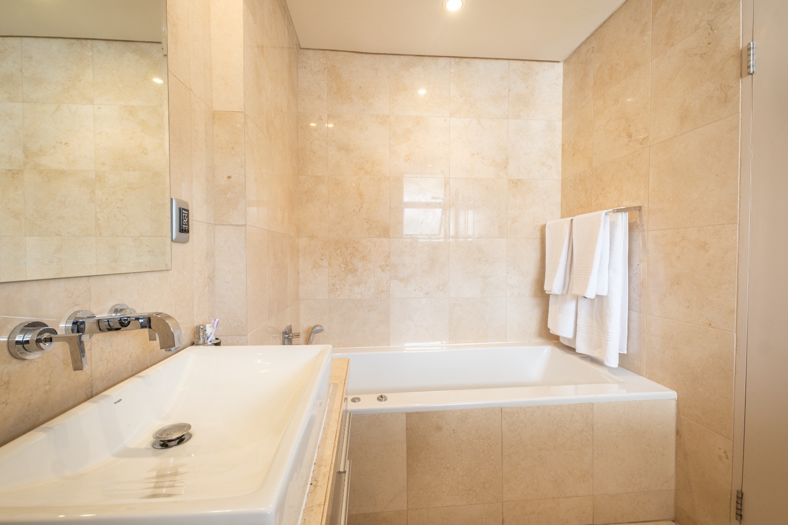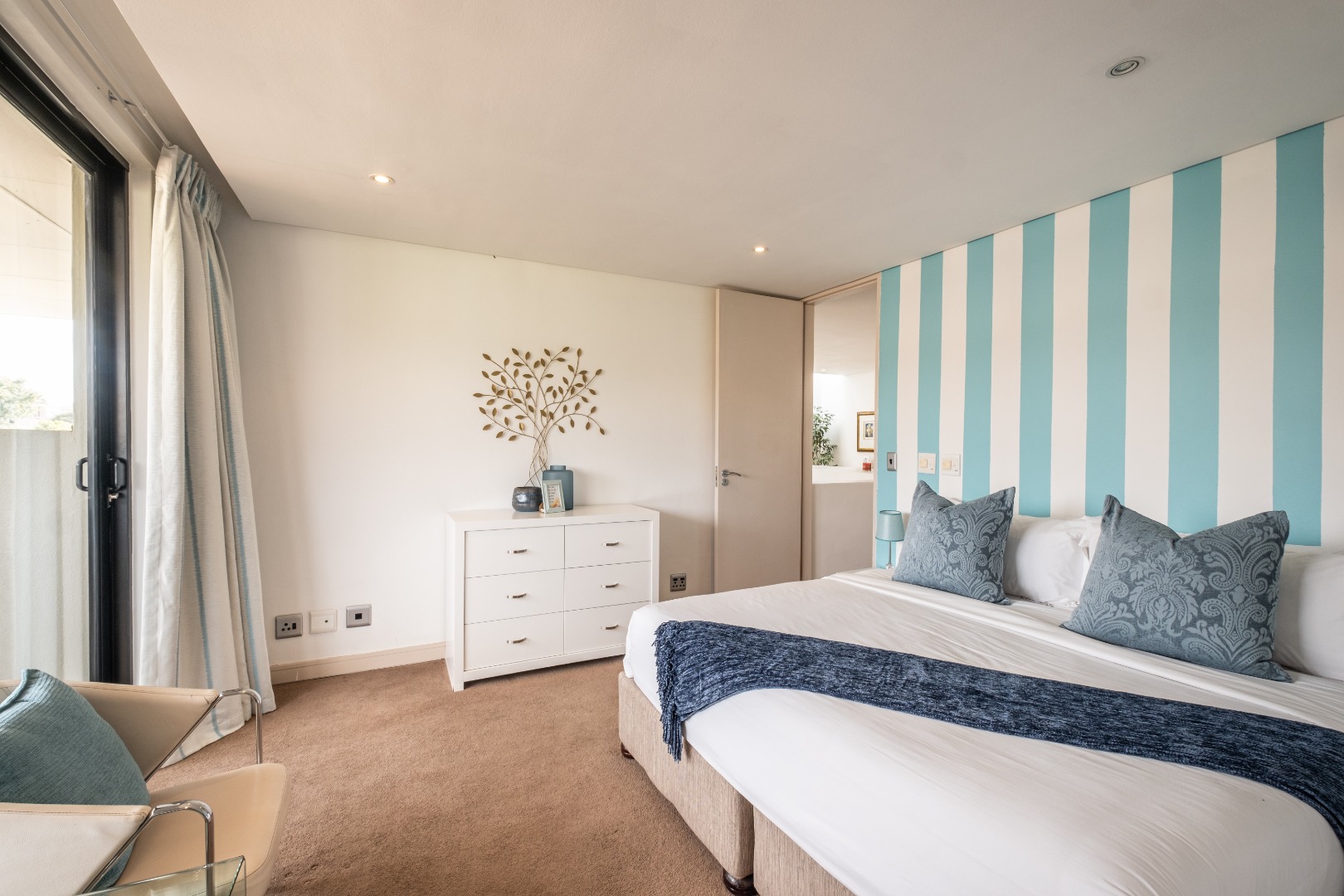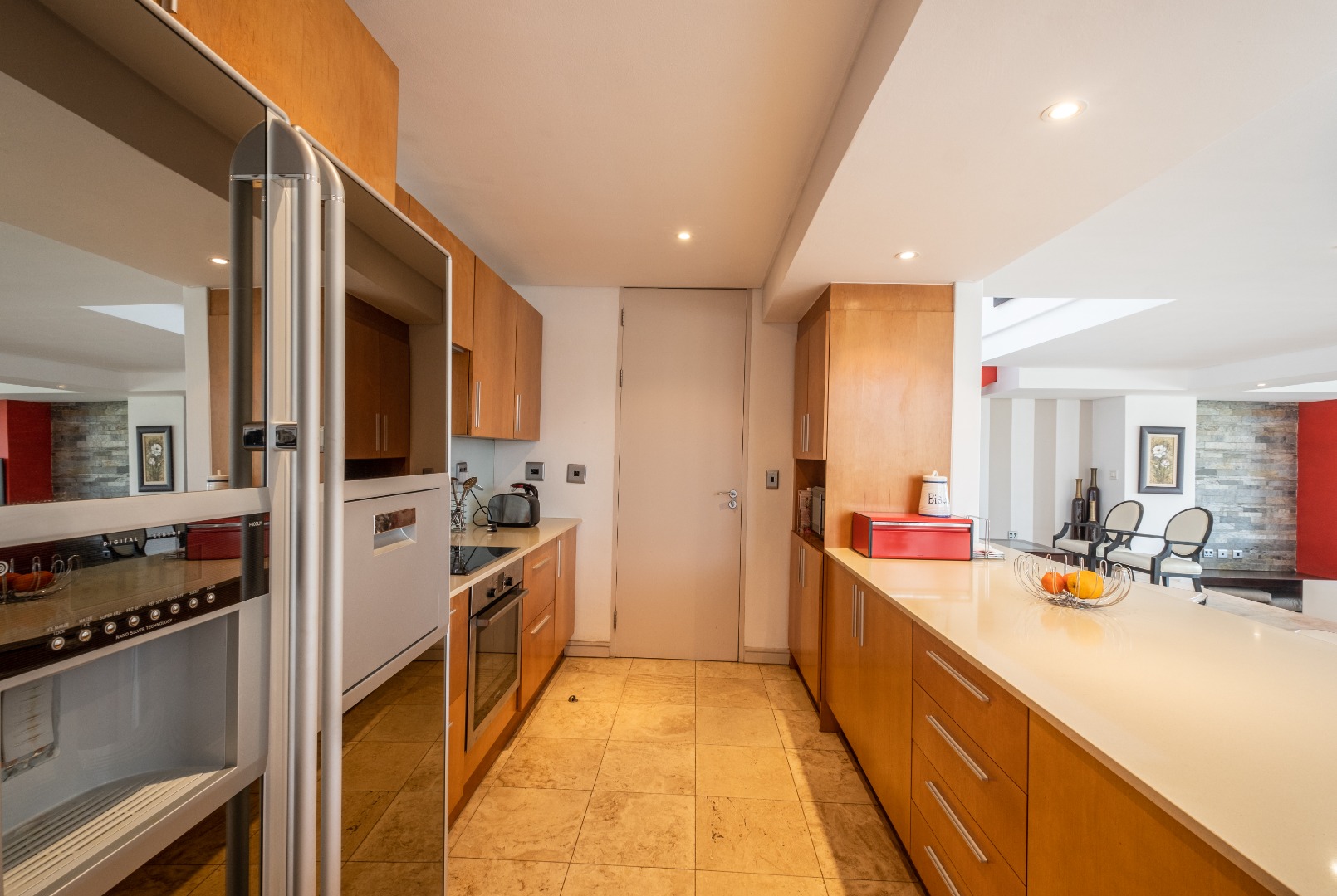 Heading upstairs a skylight provides natural lighting above and a spacious lounge is found where the rooms lead off of. Bedroom 1 has walk through closet into it en suite bathroom with a tub, wash hand basin and WC. Bedroom 2 is set up similarly with a shower instead of bath and main en suite has a full bathroom as well as a walk through closet. All the room have balconies and their own Air conditioning unit.