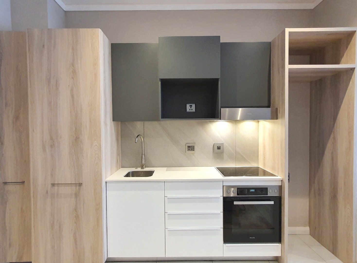 The kitchen is fitted with Technistone work surfaces, a Miele under-counter oven, hob and extractor. The laundry cupboard can