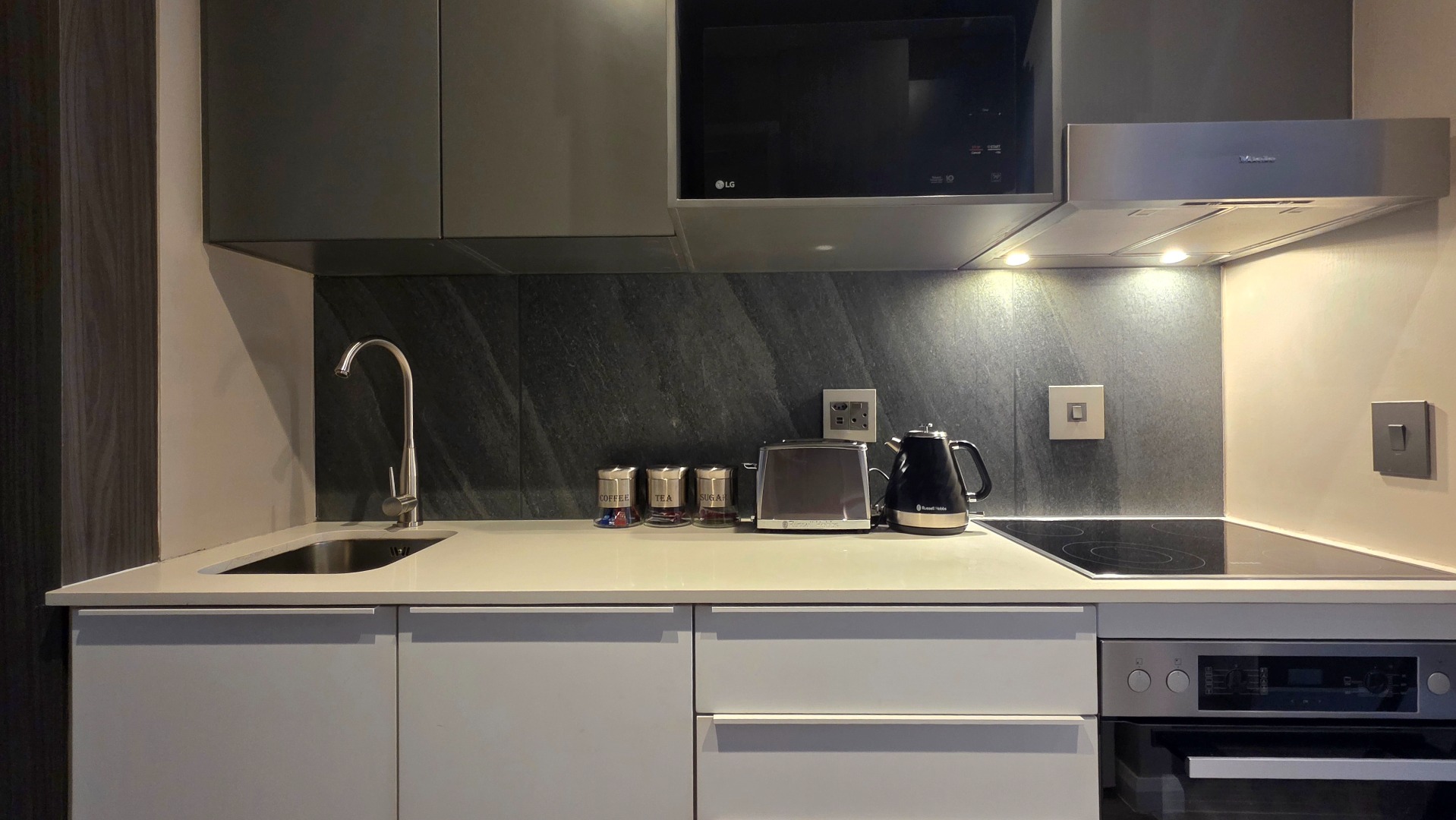 The kitchen is fitted with Miele appliances which includes a multi-function oven, hob and extractor, undercounter