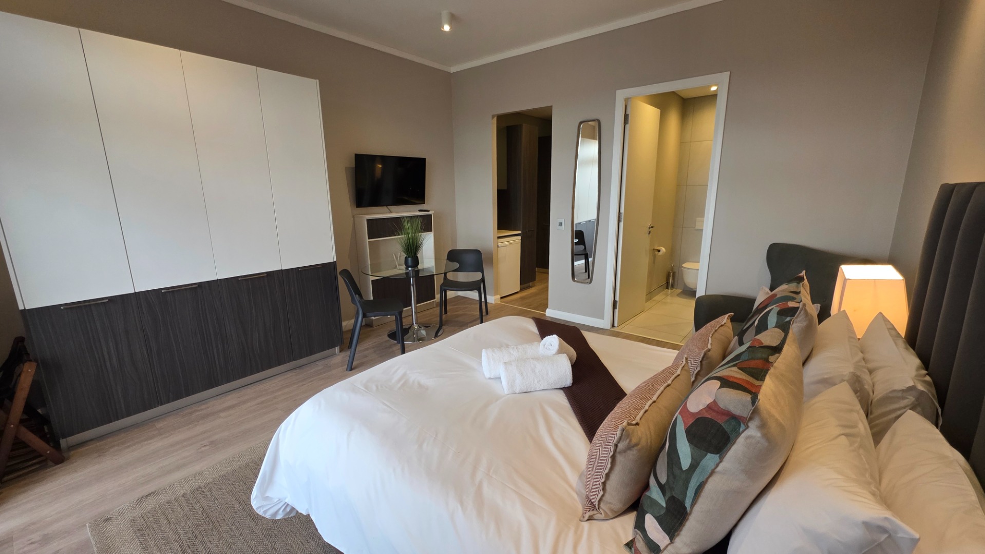 The studio offers a spacious bedroom with built in cupboard and en-suite bathroom fitted with a shower, toilet and basin. The room opens onto a private balcony.