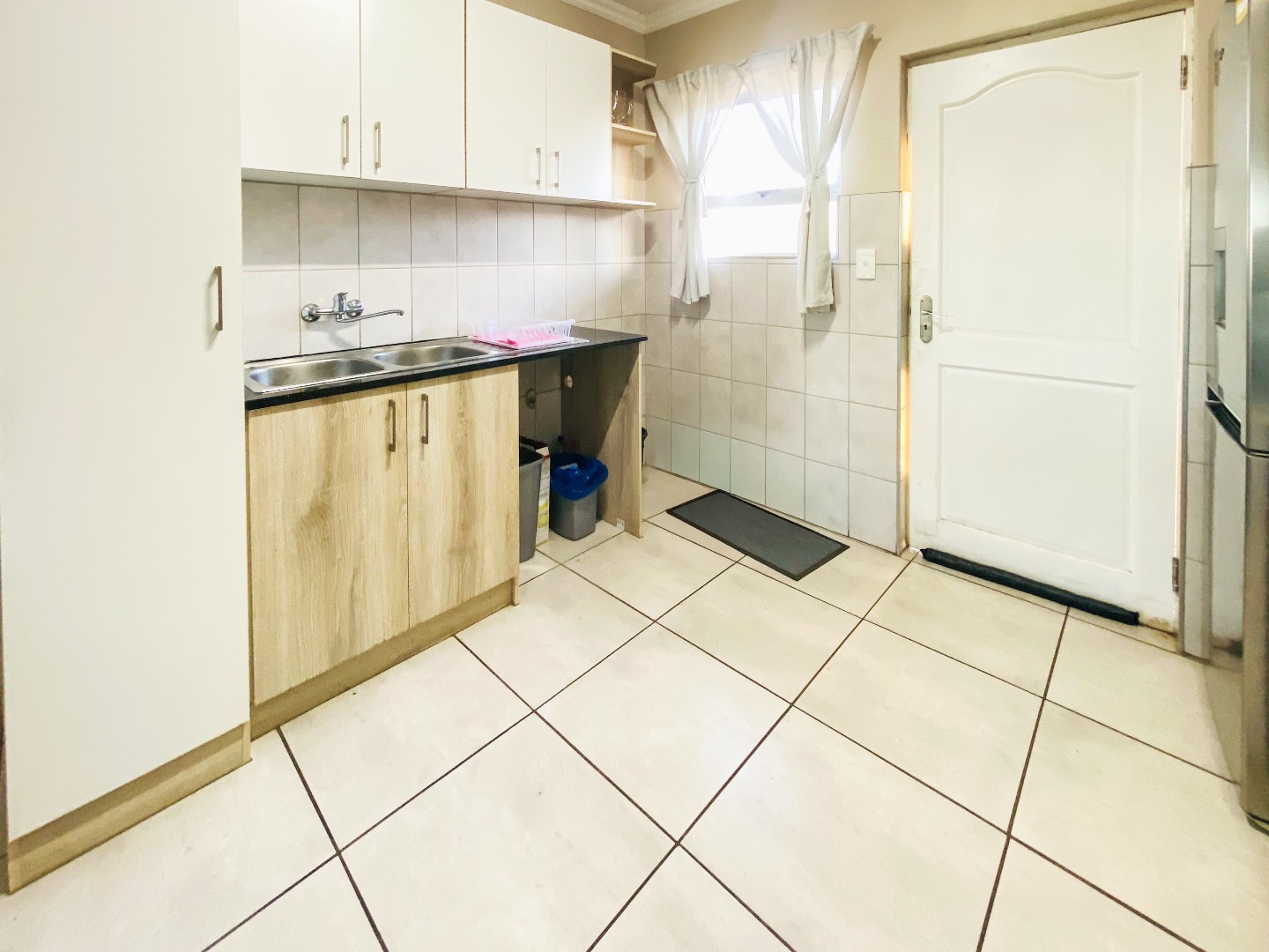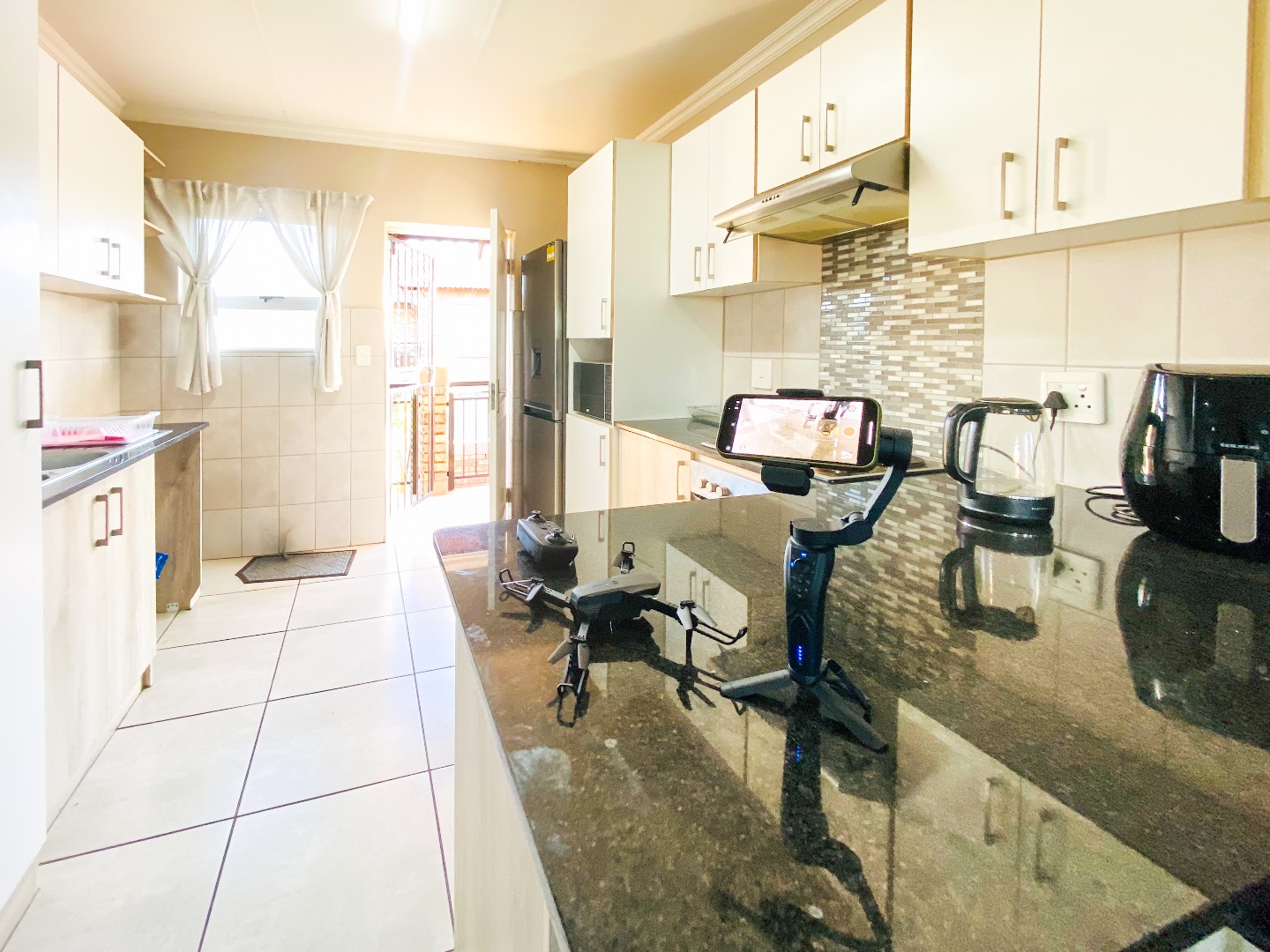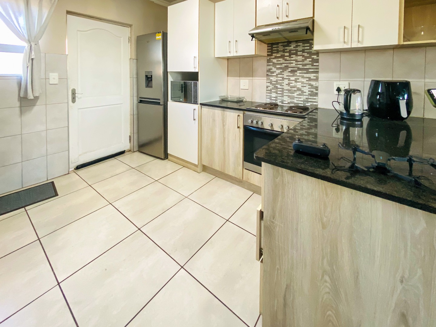 Discover an exquisite rental opportunity within a prestigious security estate in Montana, Pretoria. This sophisticated 110 sqm residence offers a meticulously designed open-plan living experience. The heart of the home is a contemporary kitchen, boasting elegant two-tone cabinetry, sleek dark granite countertops, and a stylish mosaic tiled backsplash. Equipped with a built-in oven, hob, and extractor fan, alongside ample storage and dedicated spaces for a large refrigerator and microwave, it caters to culinary enthusiasts. The seamless flow into the bright lounge area, adorned with easy-to-maintain tiled flooring, creates an inviting ambiance perfect for both relaxation and entertaining.