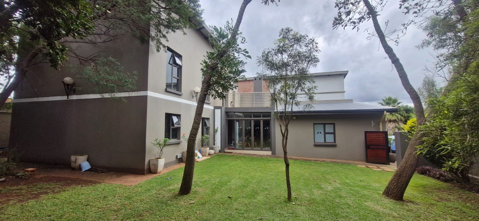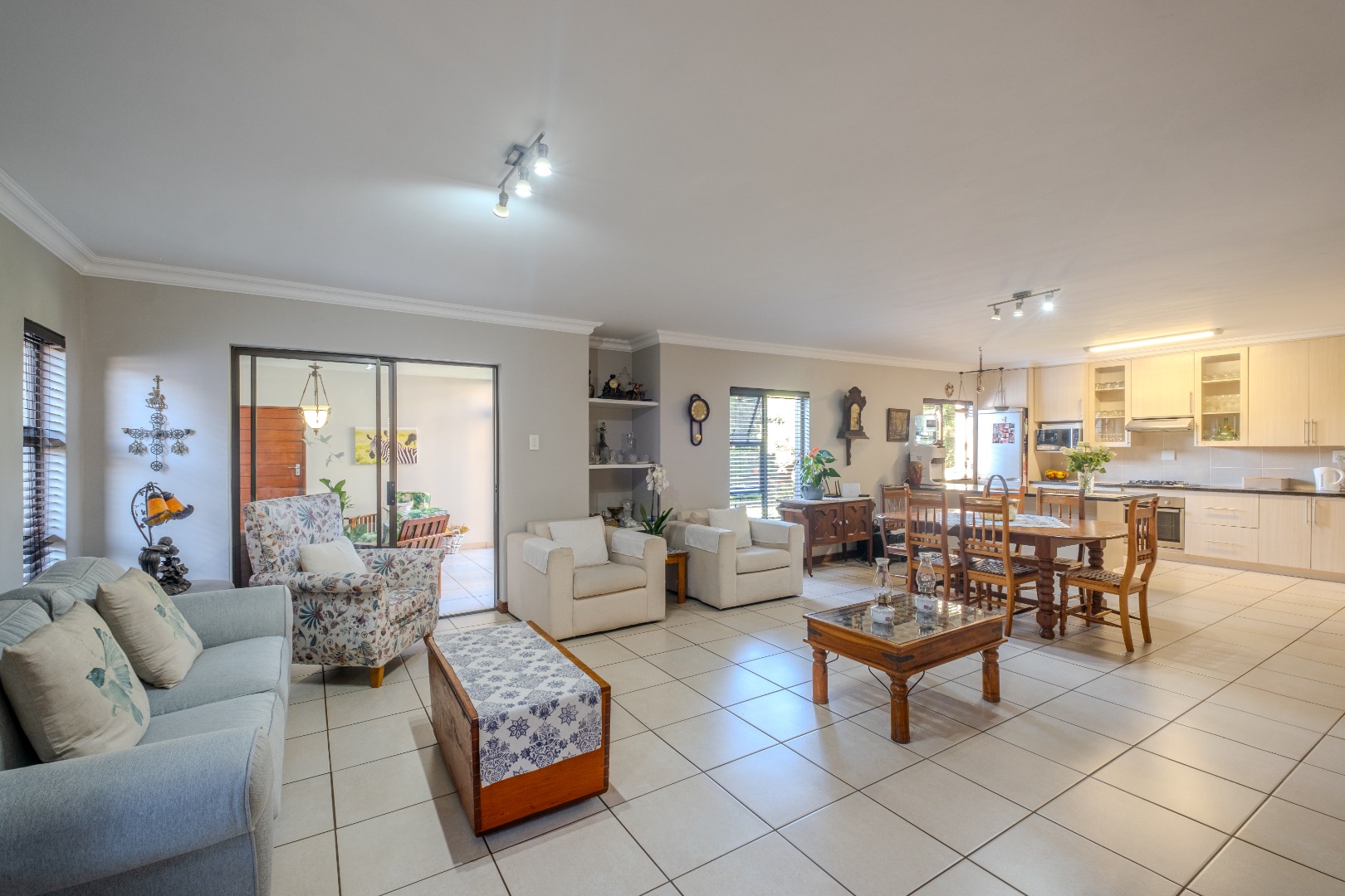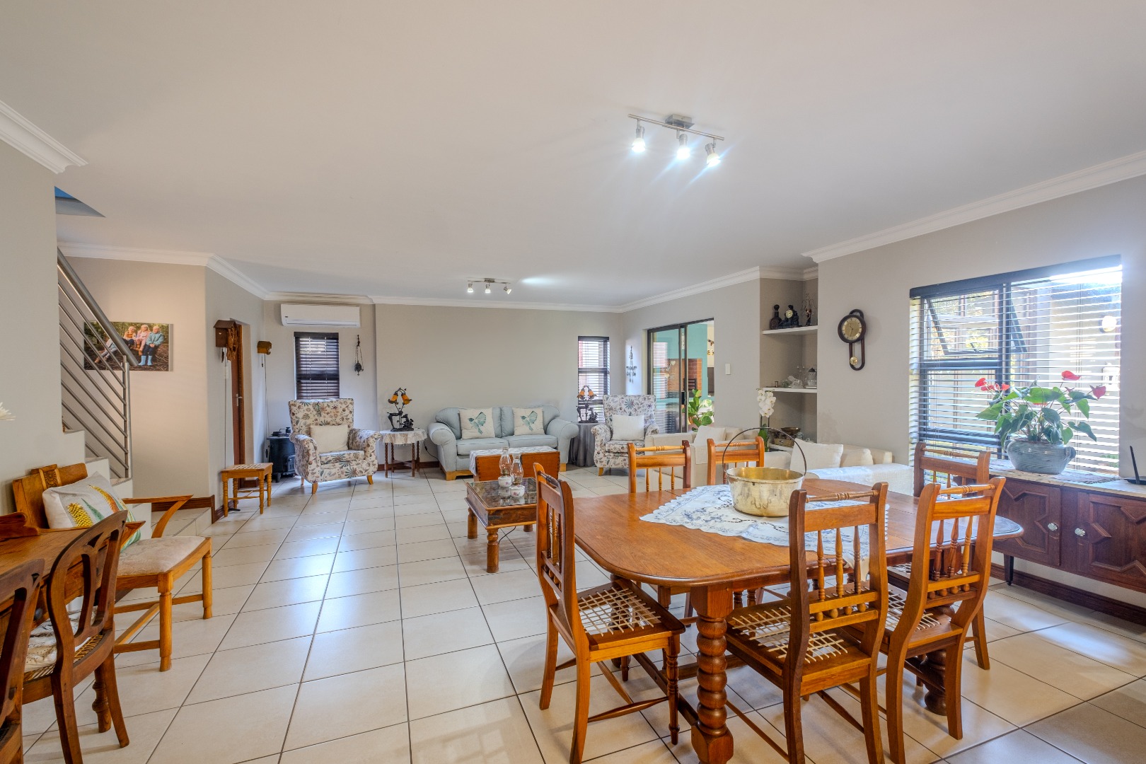 Open-plan and airy flowing living areas include a lounge (with aircon), dining area, kitchen with separate scullery and braai room that can serve as a play room for children as well - all leading out to an established garden by means of aluminium stack doors. Guest toilet as well.