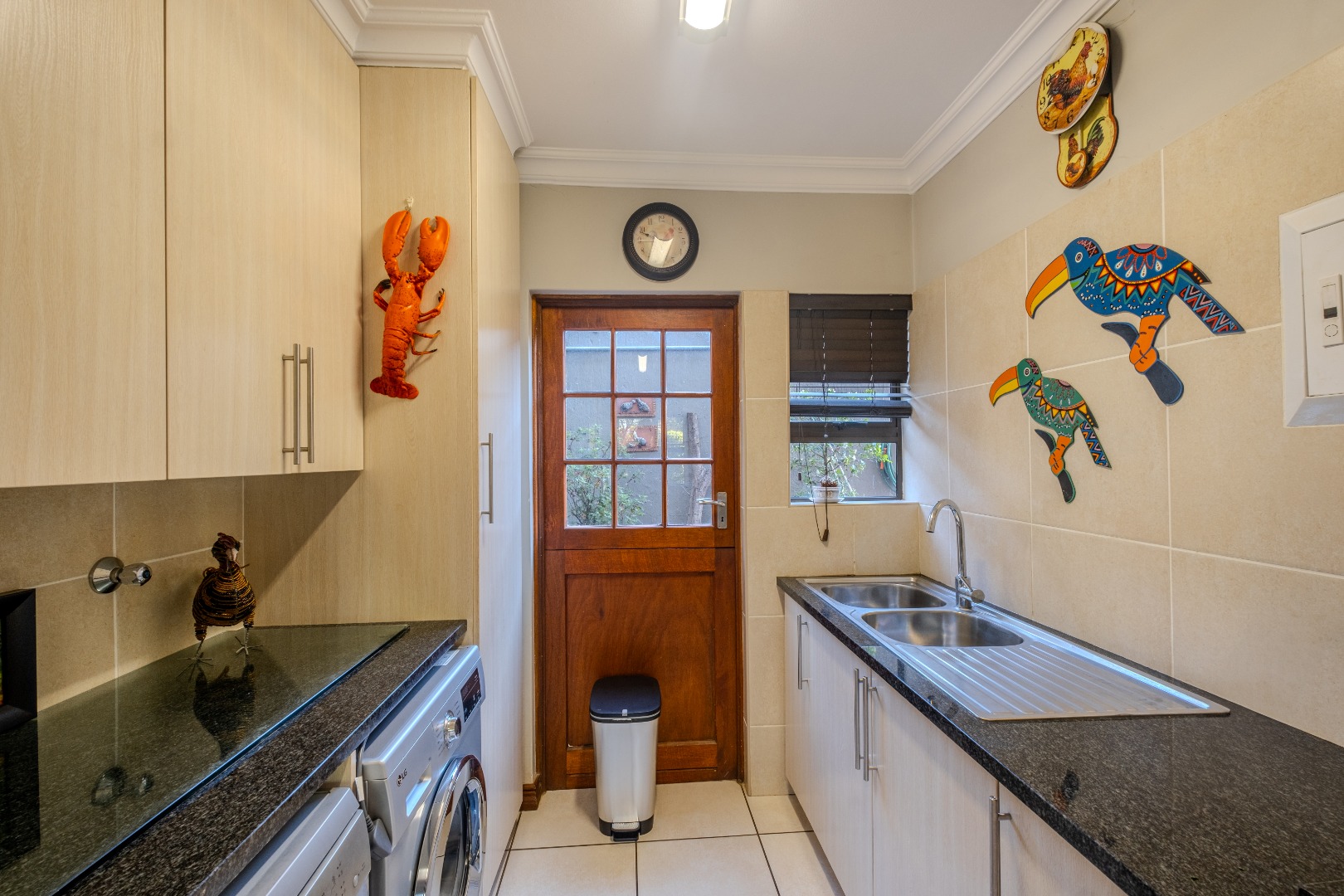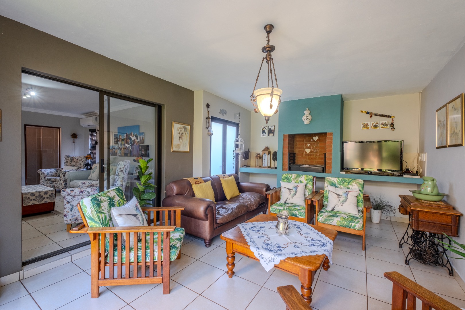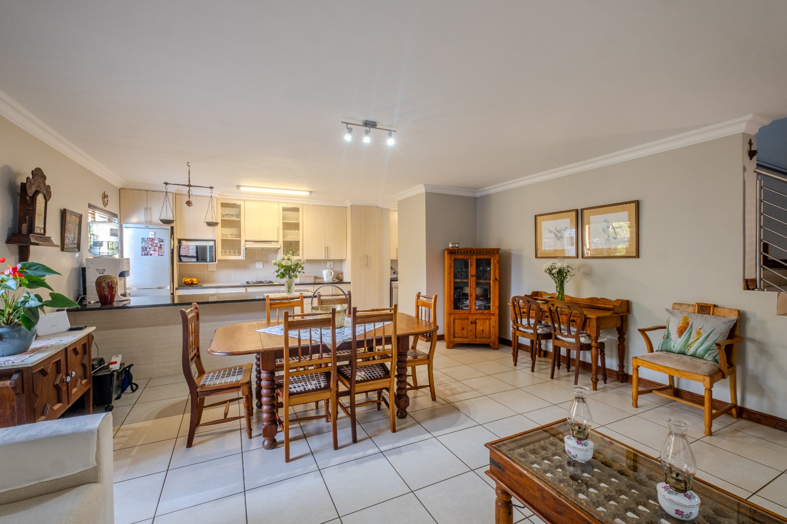 Open-plan and airy flowing living areas include a lounge (with aircon), dining area, kitchen with separate scullery and braai room that can serve as a play room for children as well - all leading out to an established garden by means of aluminium stack doors. Guest toilet as well.