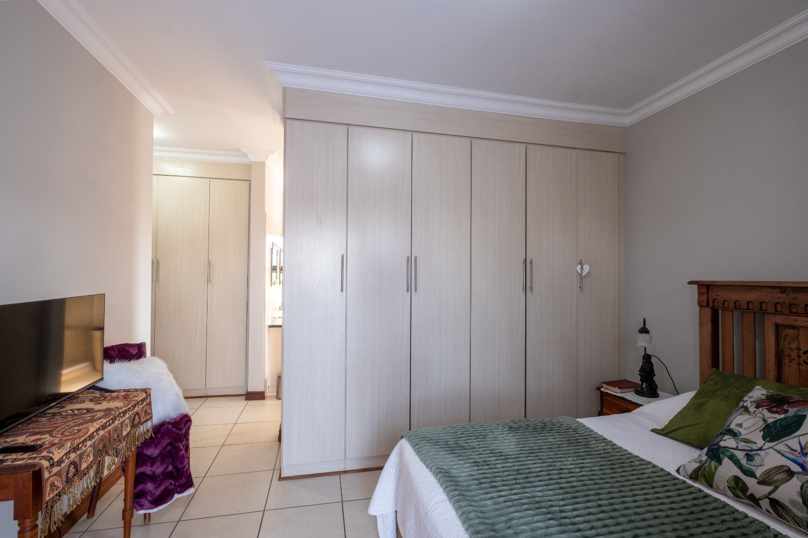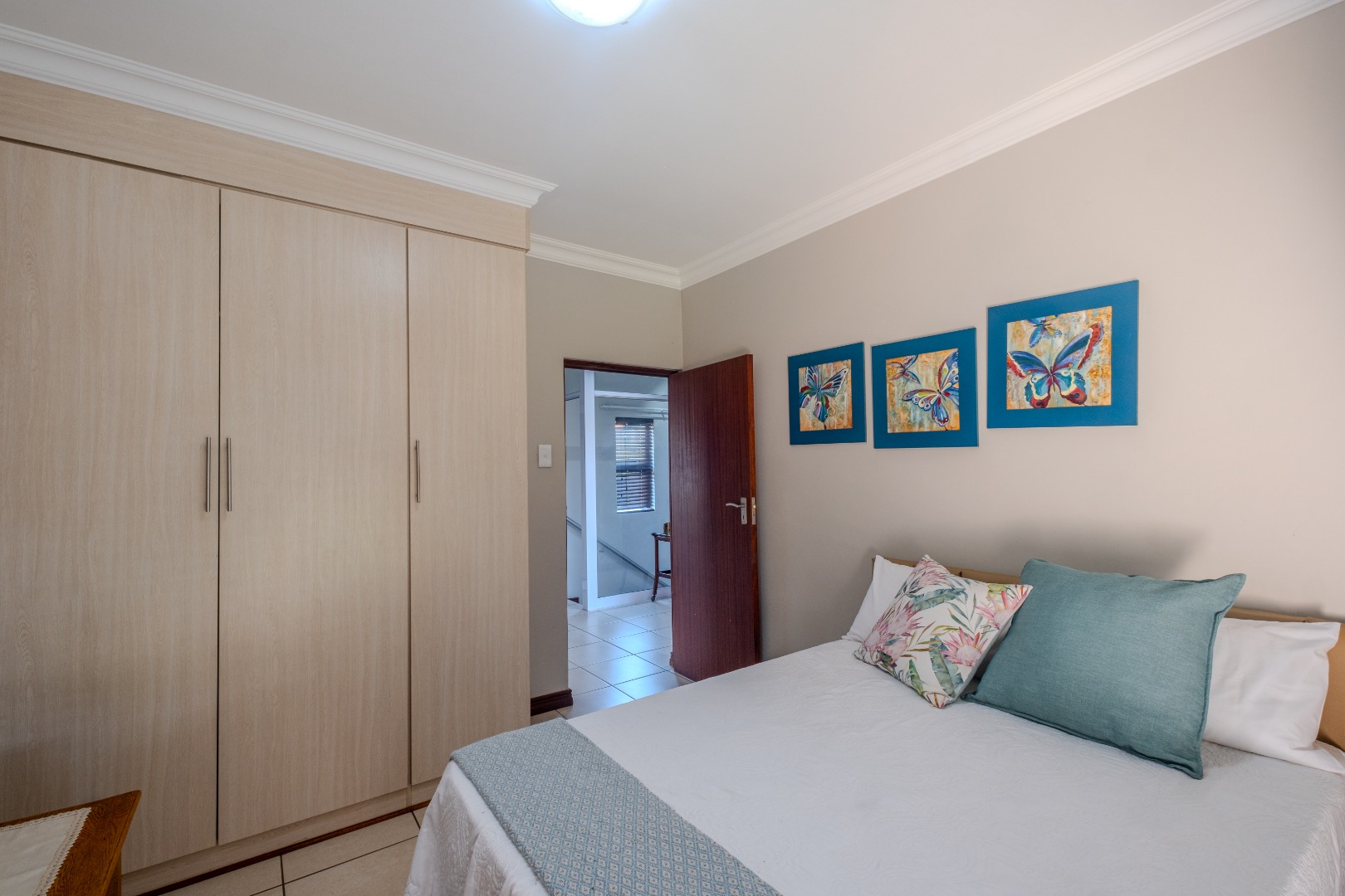 The main bedroom fits a double bed as there is a double row of cupboards, and the second and third bedrooms can fit queen beds.