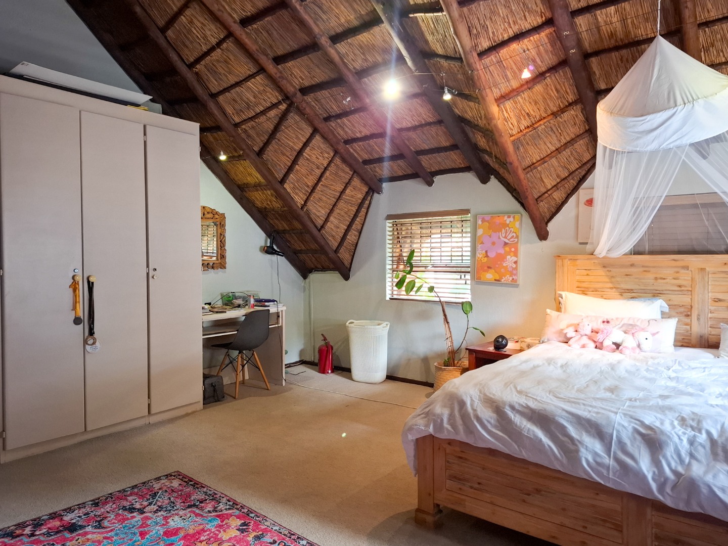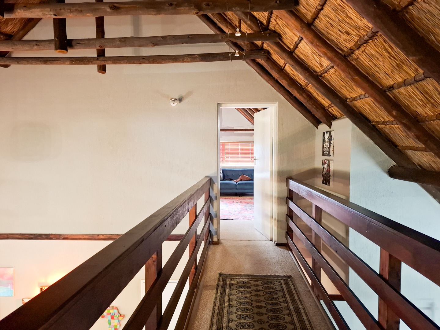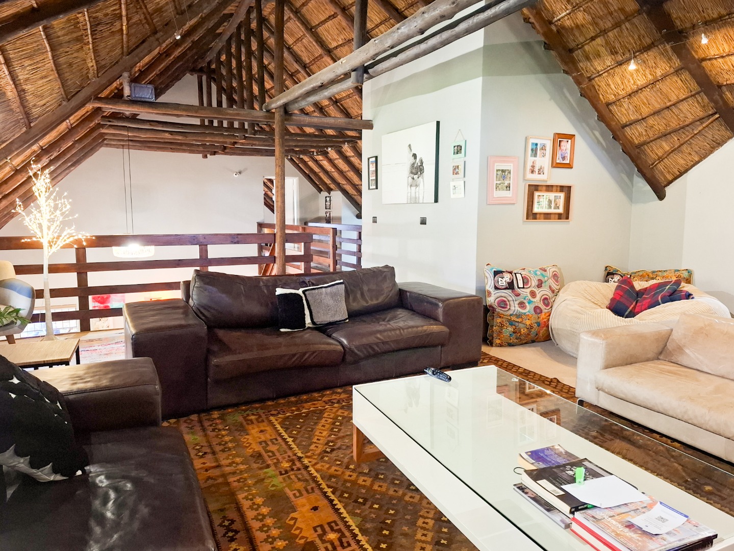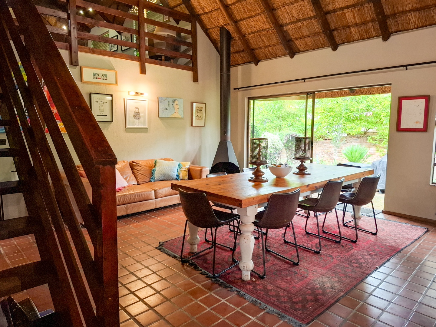 Step into a truly unique rental experience with this charming 4-bedroom, 3-bathroom home nestled in the lovely Wapadrand Security Village. You'll immediately fall for the distinctive thatched roof and high vaulted ceilings, beautifully accented with exposed wooden beams, creating a warm and inviting atmosphere that feels both rustic and spacious. The open-plan living and dining areas are perfect for relaxing or entertaining, complete with a cozy fireplace for those cooler evenings, making it a real hub for family life.