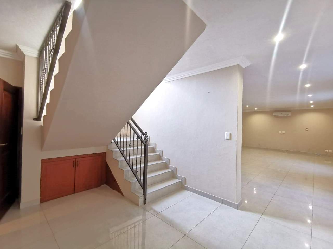 Venturing upstairs, you'll be greeted by a pajama lounge, providing an additional space for relaxation or family movie nights. The three sizable bedrooms on this level each open up onto their private balconies. The master bedroom is a true sanctuary, featuring an en-suite bathroom and ample cupboard space. The remaining two bedrooms share a well-appointed full bathroom, ensuring convenience for the entire family. All bedrooms are fitted with air conditioning.